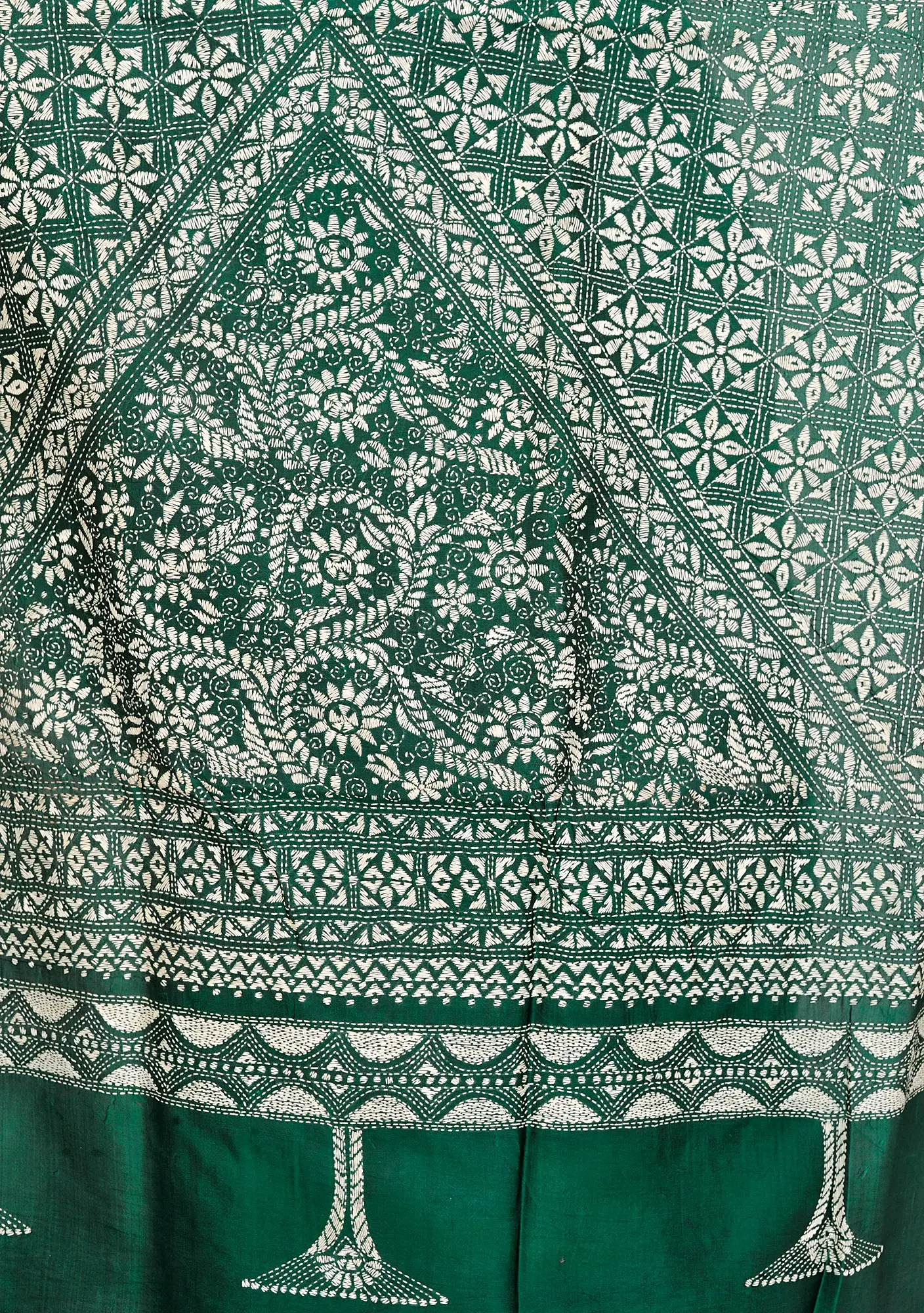 The design features a captivating interplay of motifs. The body of the sari is adorned with a repeating pattern of interlocking geometric shapes, reminiscent of ancient motifs that speak of continuity and harmony. As you move towards the borders and the pallu (the decorative end piece), the artistry unfolds further. Here, you'll find a more elaborate display of delicate floral designs and traditional patterns, each meticulously rendered by hand. The contrast between the deep green silk and the crisp white embroidery creates a visually stunning effect that is both classic and contemporary. This sari is a celebration of traditional Indian art forms. The Kantha embroidery technique, characterized by its running stitch, creates a textured and subtly raised effect that adds dimension to the design. The skill required to achieve such precision and uniformity in hand embroidery is truly remarkable, making each sari a unique creation.