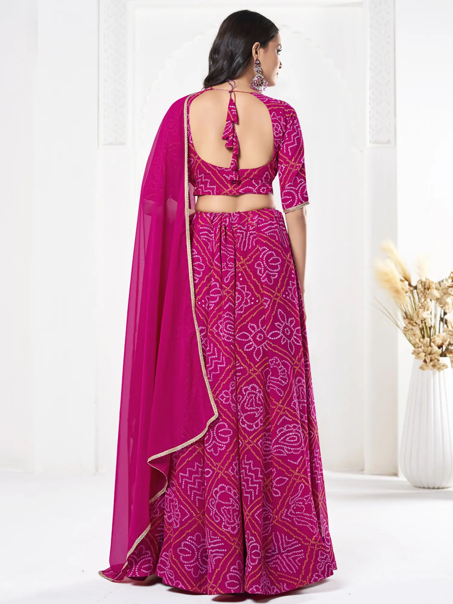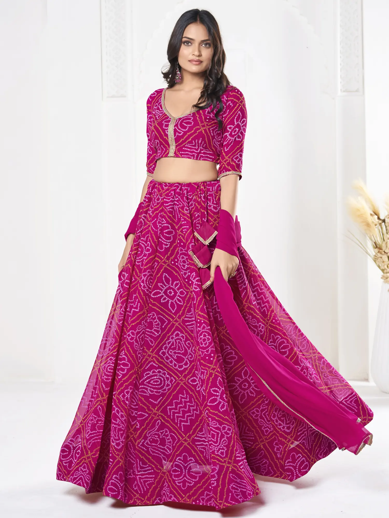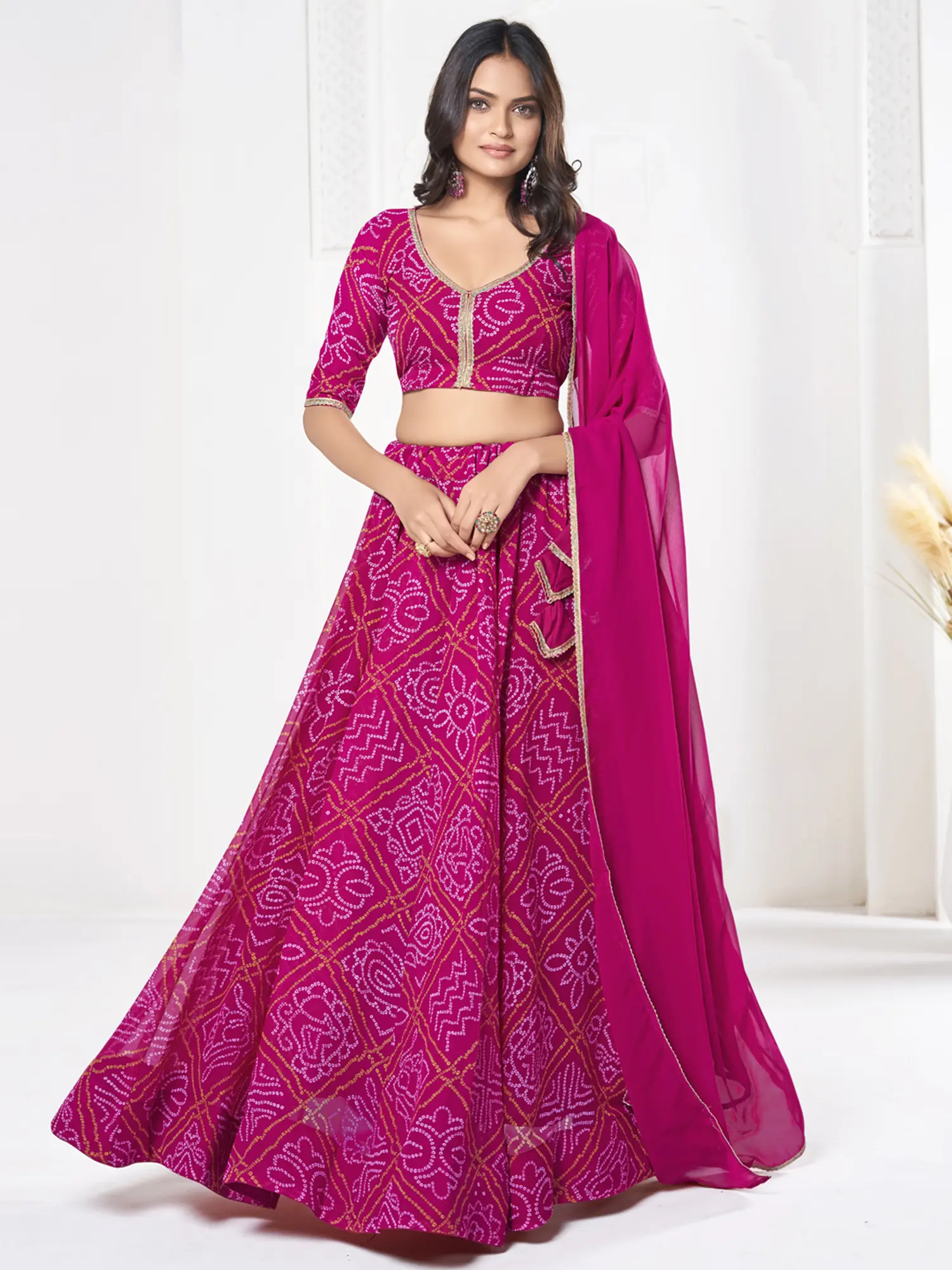 Step into the spotlight with this exquisite Dark-Hot-Pink Bandhani Print Work Georgette Designer Lehenga Choli. Crafted from luxurious georgette, this ensemble embodies the rich heritage of Indian craftsmanship, reimagined for contemporary elegance. The striking dark-hot-pink hue serves as a captivating canvas for the intricate Bandhani print, a time-honored tie-dye technique that creates mesmerizing patterns of dots and geometric shapes. Each motif tells a story of tradition and artistry, making this lehenga choli a true wearable masterpiece.