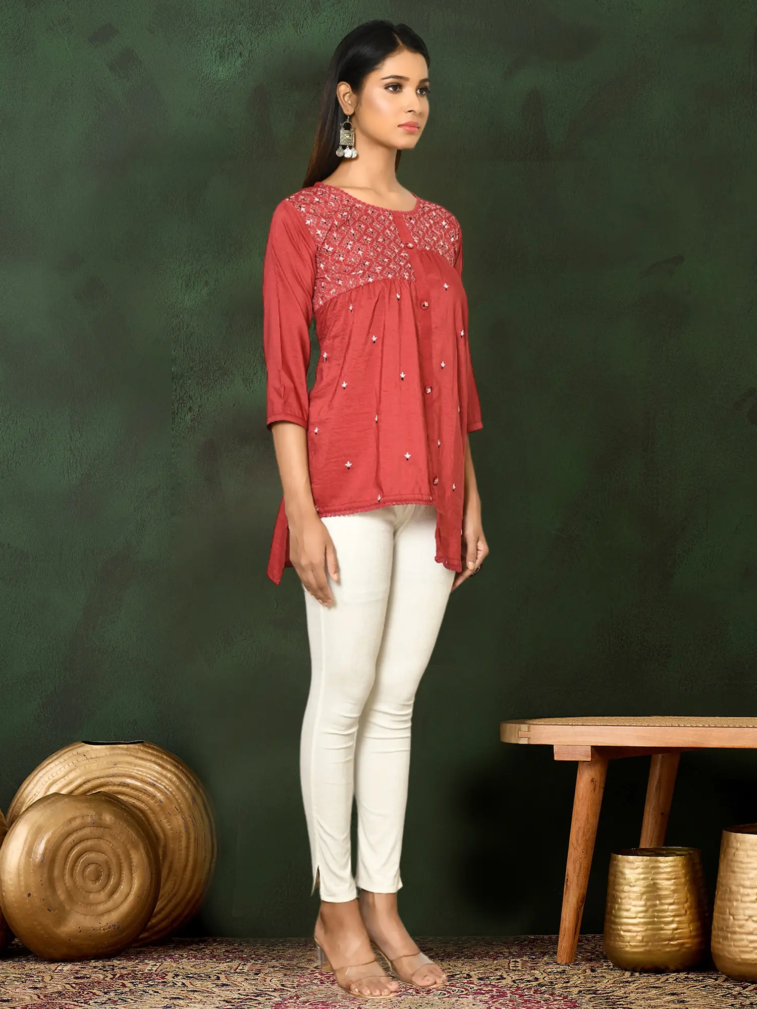 Persian-Red Embroidered And Ethnic Motifs Casual Round Neck Viscose Blend Short Top