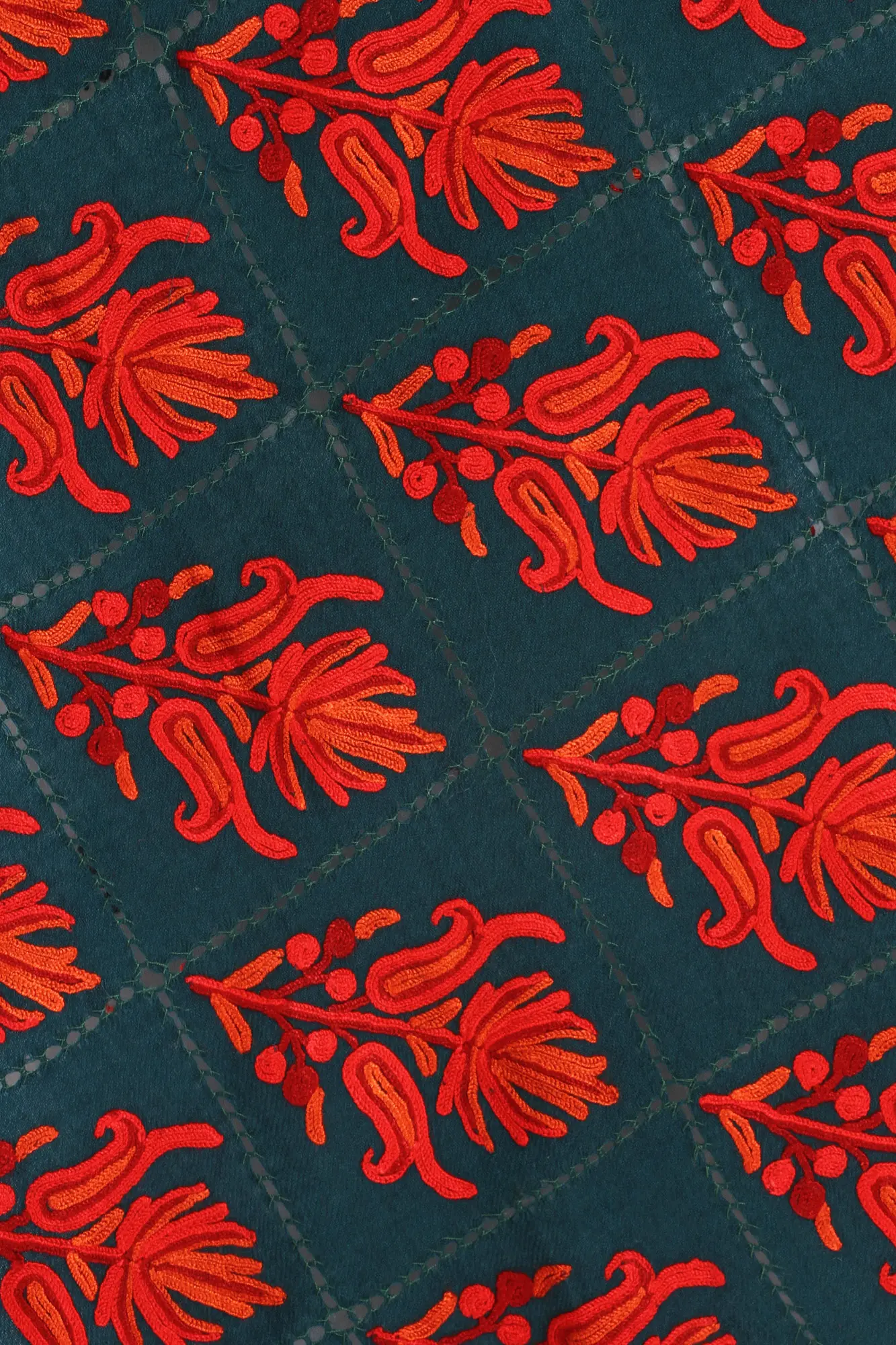 Our Deep Teal Stole from Kashmir is an embodiment of artistic finesse. The Aari-embroidered paisley motifs and cutwork showcase the dexterity of Kashmiri artisans. The deep teal color symbolizes serenity, and the design pays homage to the region's natural beauty. Aari embroidery, an ancient art form, has gracefully evolved without losing its authenticity, making it a perfect fit for today's fashion trends. Wearing this stole means adorning yourself with a piece of Kashmir's history, an accessory that stands as a fusion of tradition and contemporary style.