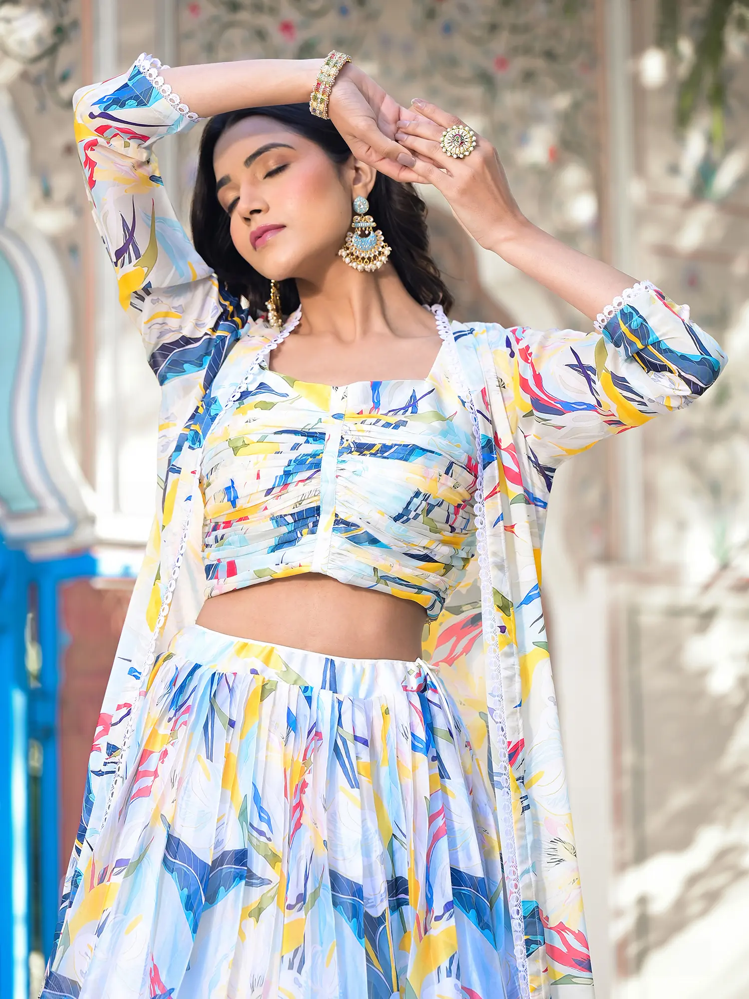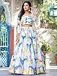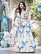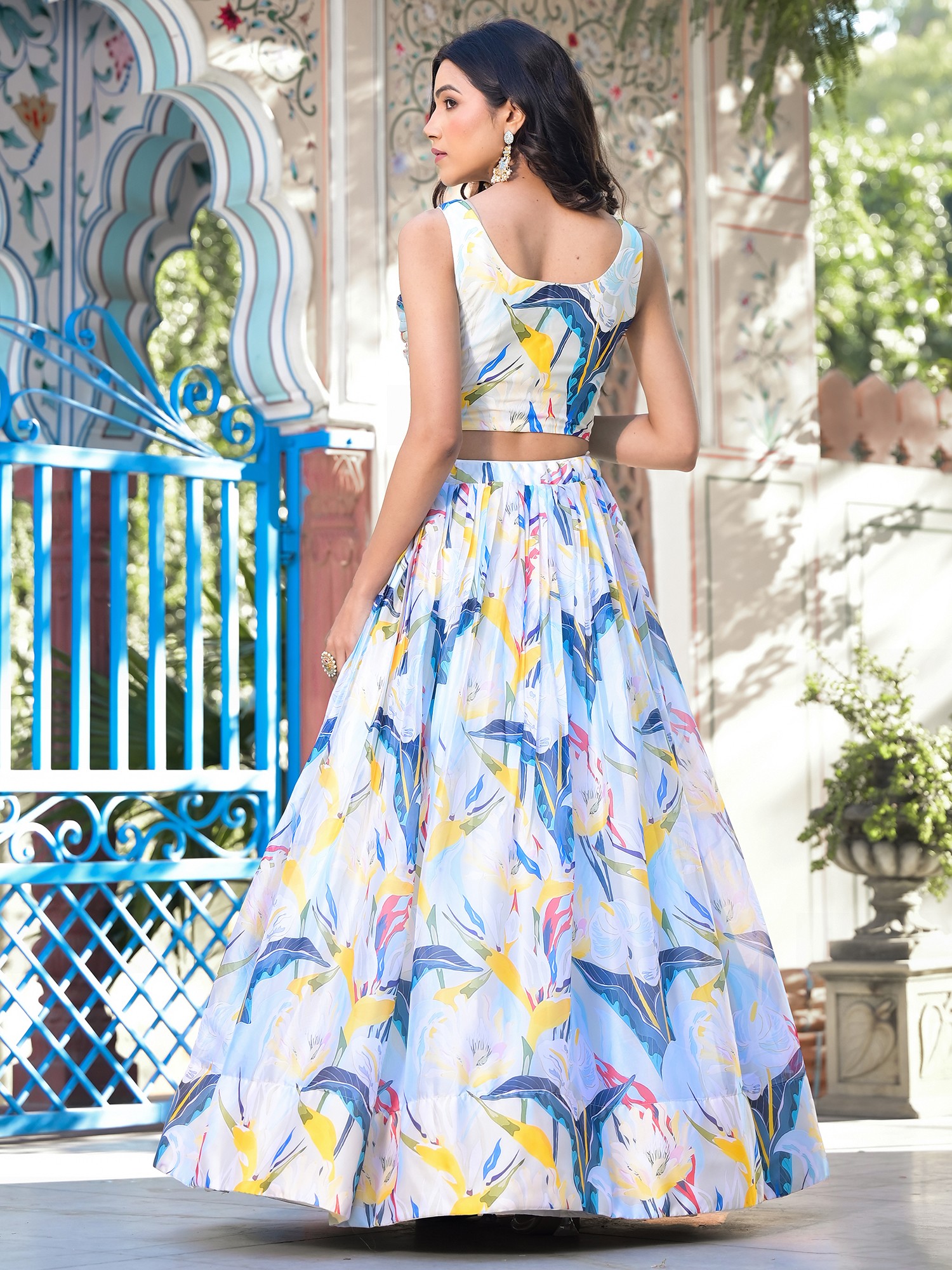 The beauty of this lehenga choli set lies not only in its design but also in its adaptability. Accessorize it with delicate jewelry to accentuate its elegance, or add bold, statement pieces for a more dramatic flair. The digital print's dynamic colors provide a rich palette for coordinating your accessories. Consider pairing it with strappy heels for a touch of glamour, or traditional juttis for a cultural twist. This ensemble is perfect for weddings, receptions, festive gatherings, and any occasion where you want to make a lasting impression. With its modern design and classic silhouette, this lehenga choli is a versatile addition to any wardrobe. It's an investment in your style, guaranteed to make you feel confident and beautiful every time you wear it.