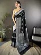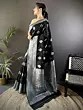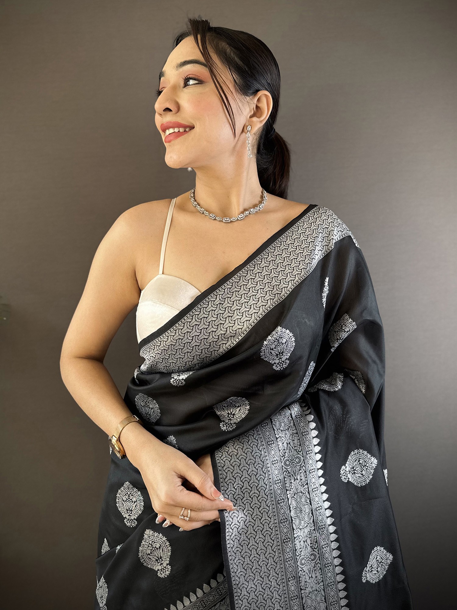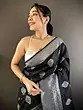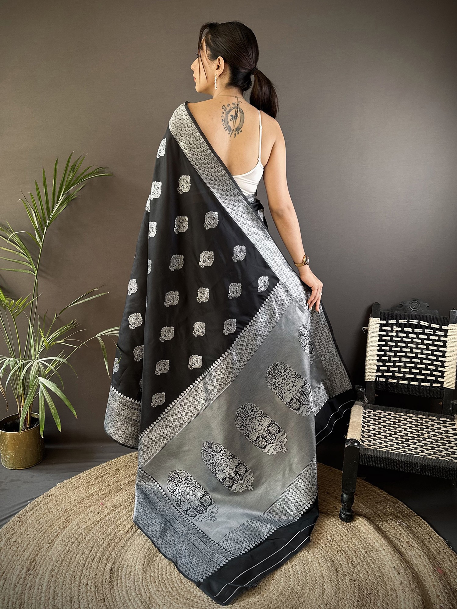 Adorn yourself with the captivating contrast of rich black silk adorned with elegantly rendered silver floral patterns. The meticulously detailed borders showcase a symphony of traditional weaving, framing the garment with undeniable grandeur. You’ll appreciate the way the light plays across the woven motifs, highlighting the opulence of the design.
