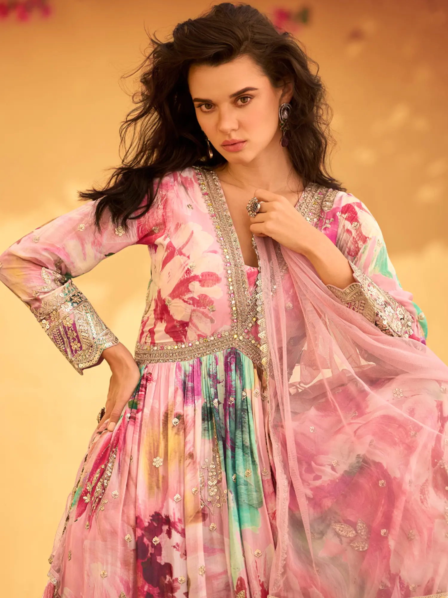 Imagine yourself gliding through your day, enveloped in the graceful flow of this stunning Anarkali gown. The delicate Chinon fabric drapes beautifully, creating a silhouette that is both flattering and comfortable. This gown is more than just clothing; it's an expression of your personal style, perfect for adding a touch of sophisticated charm to your everyday moments.