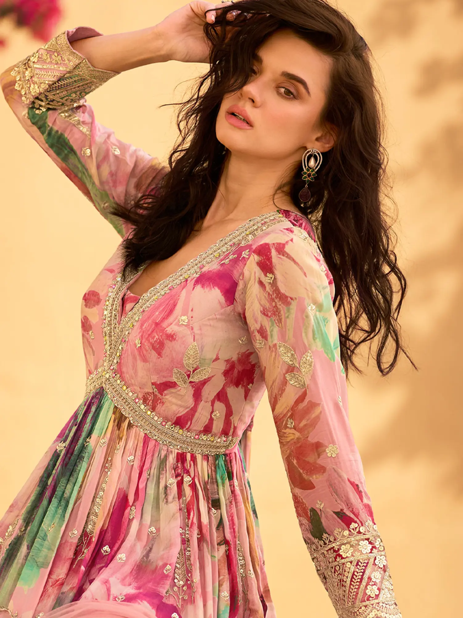 This Anarkali gown is designed to be versatile, seamlessly transitioning from casual daytime outings to more special occasions. Style it with simple flats for a relaxed, everyday look, or elevate it with heels and statement jewelry for a festive gathering. The lightweight Chinon fabric makes it perfect for warmer weather, while the full sleeves provide a touch of coverage and elegance. Whether you're attending a brunch with friends, a family celebration, or simply enjoying a sunny afternoon, this gown will ensure you look and feel your best.