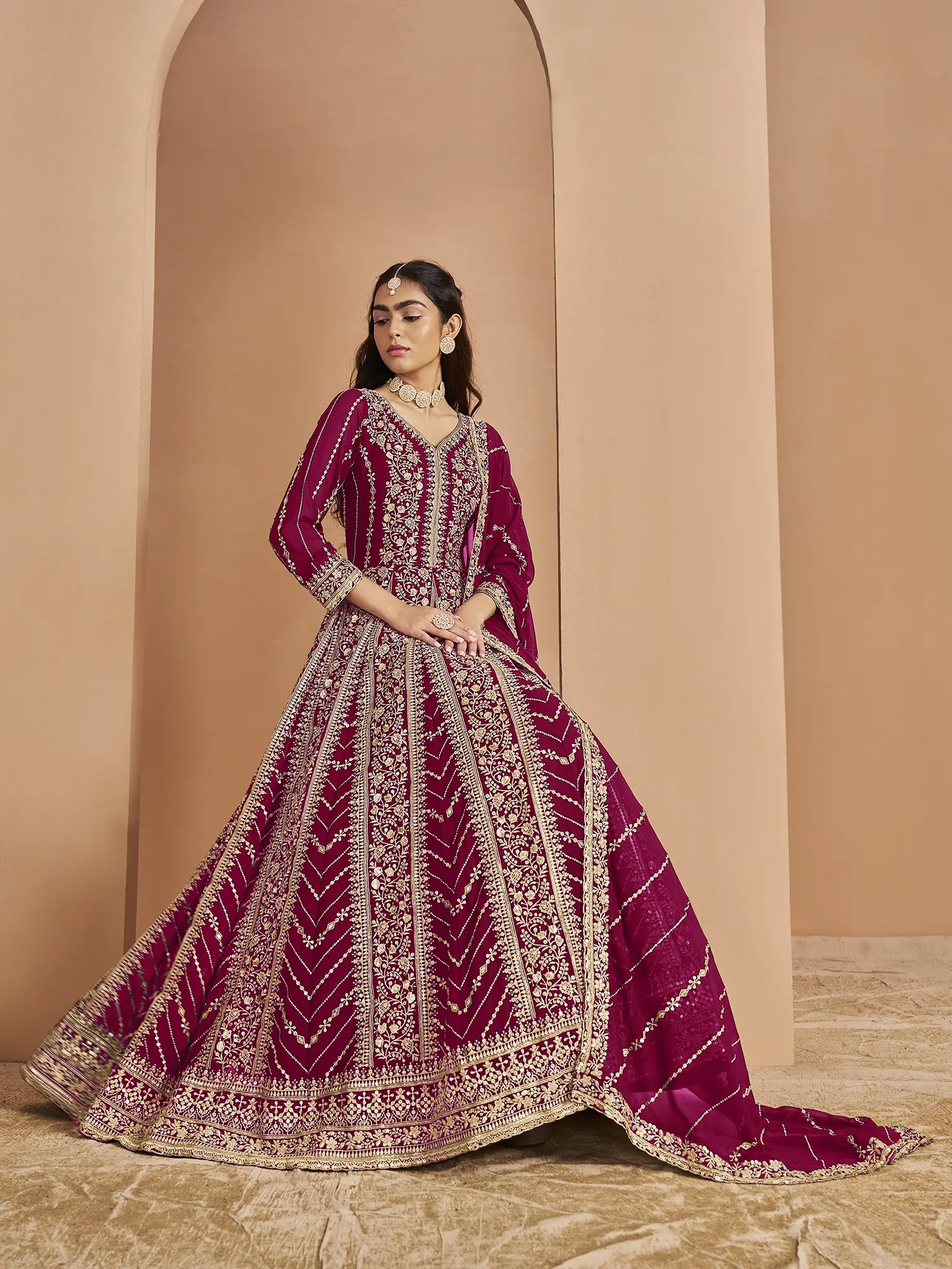 Step into a realm of unparalleled sophistication with this exquisite ensemble, designed to make you the radiant center of attention at any festive occasion. Crafted from luxurious Faux Georgette, this gown drapes beautifully, offering both comfort and a flattering silhouette. The deep, rich hue of the fabric serves as a perfect canvas for the intricate and extensive embroidery that adorns every inch of the garment.