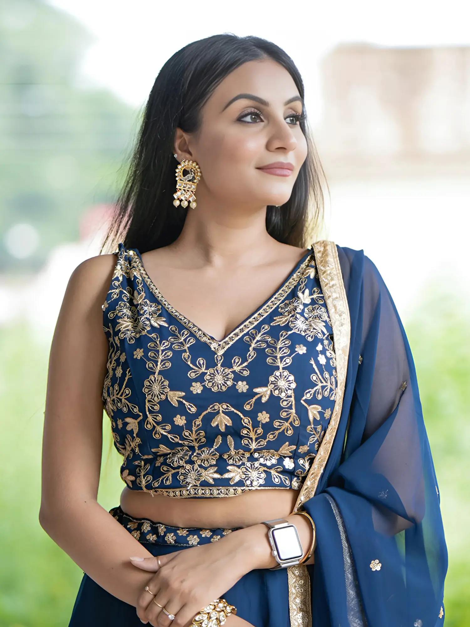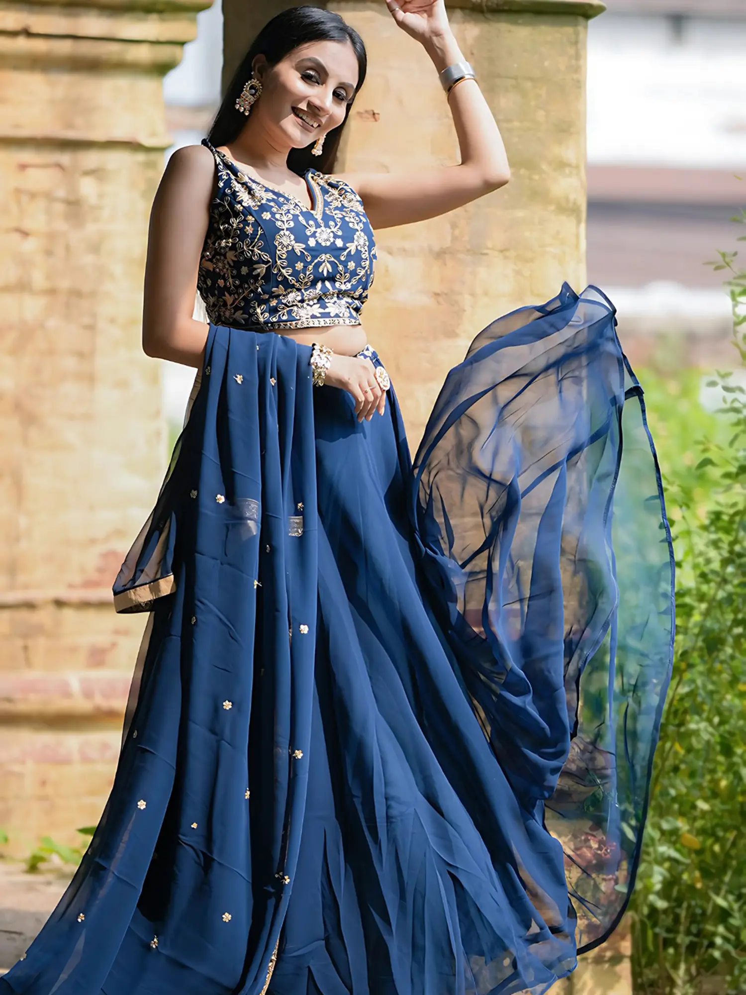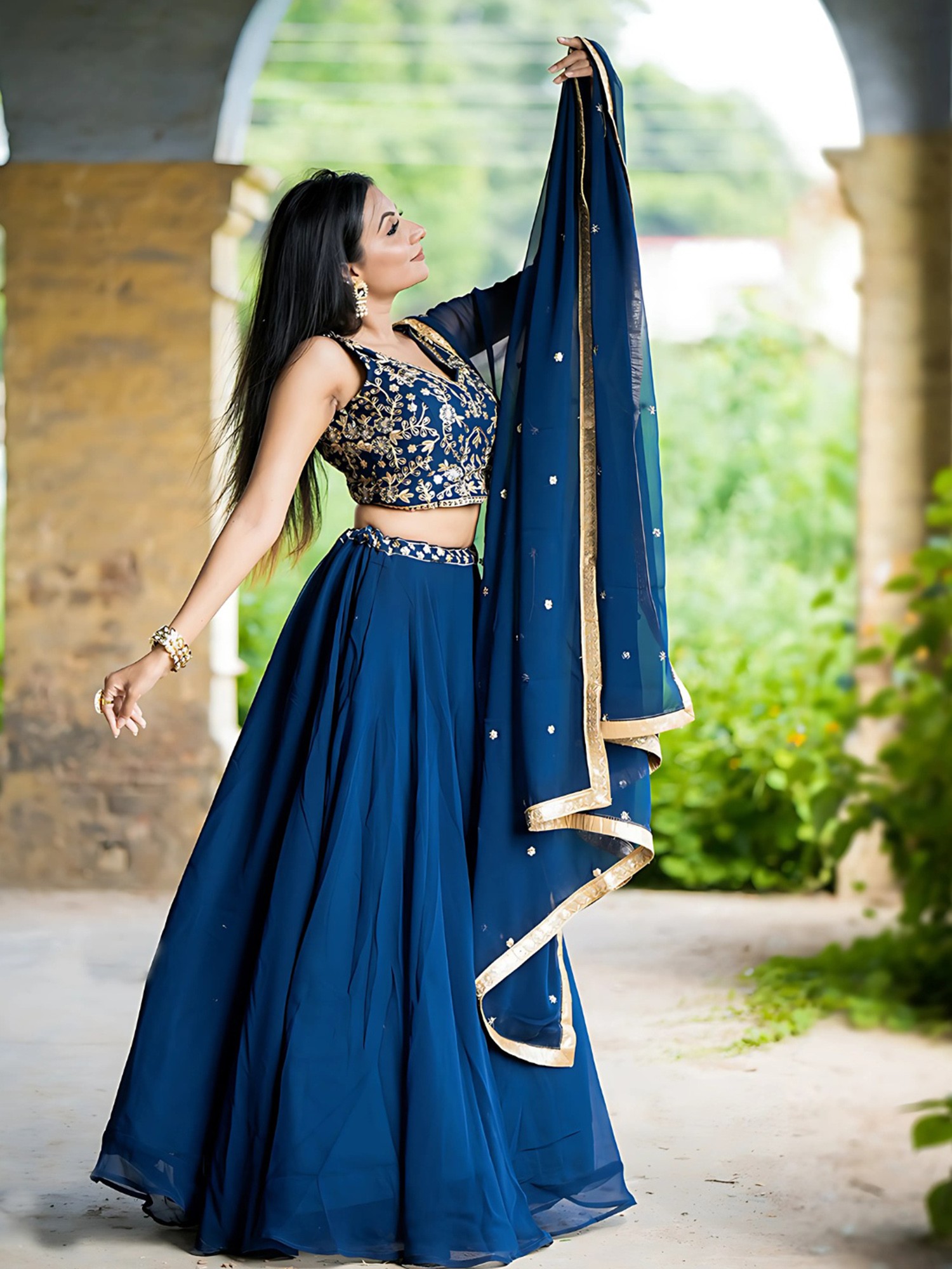 Completing this stunning ensemble is a sheer faux georgette dupatta in the same radiant royal blue. The dupatta is generously sized, allowing for versatile draping styles. Its edges are beautifully finished with a coordinating gold border that mirrors the embroidery on the choli and lehenga, adding a touch of opulence and tying the entire outfit together. The subtle embellishments of scattered motifs on the dupatta further enhance its charm, ensuring it complements rather than competes with the main pieces. Whether draped elegantly over the shoulders or fashioned in a more contemporary style, the dupatta adds an ethereal grace to the overall look.