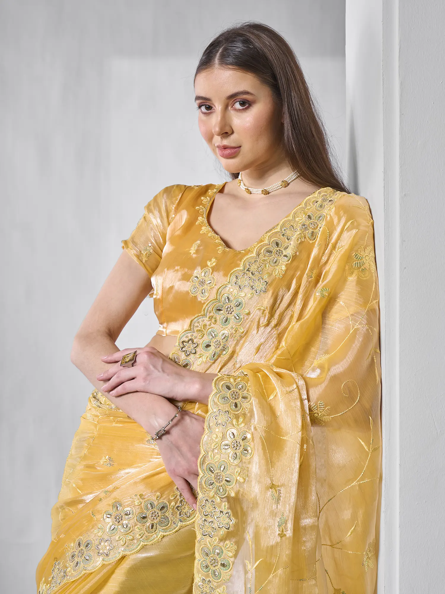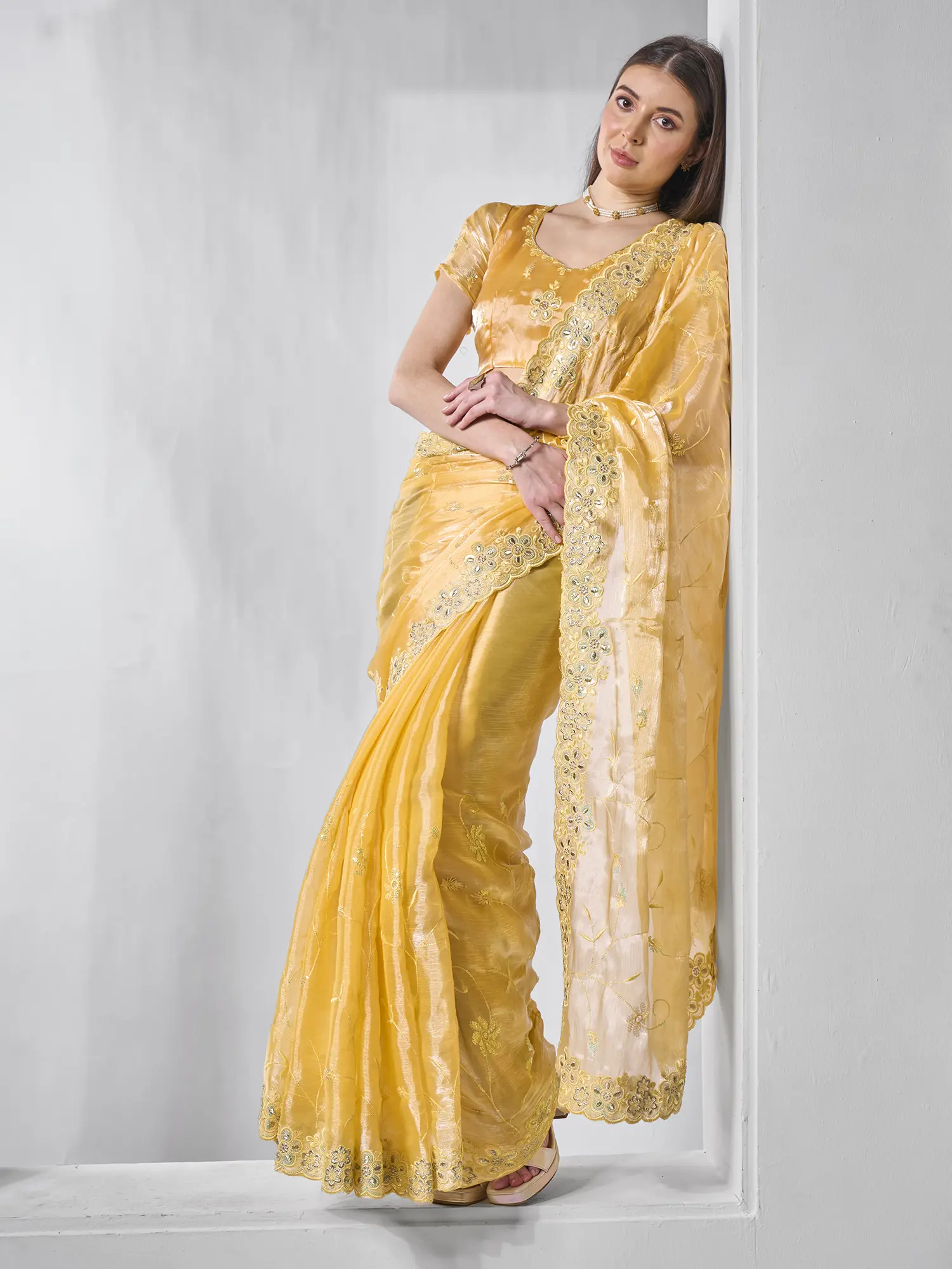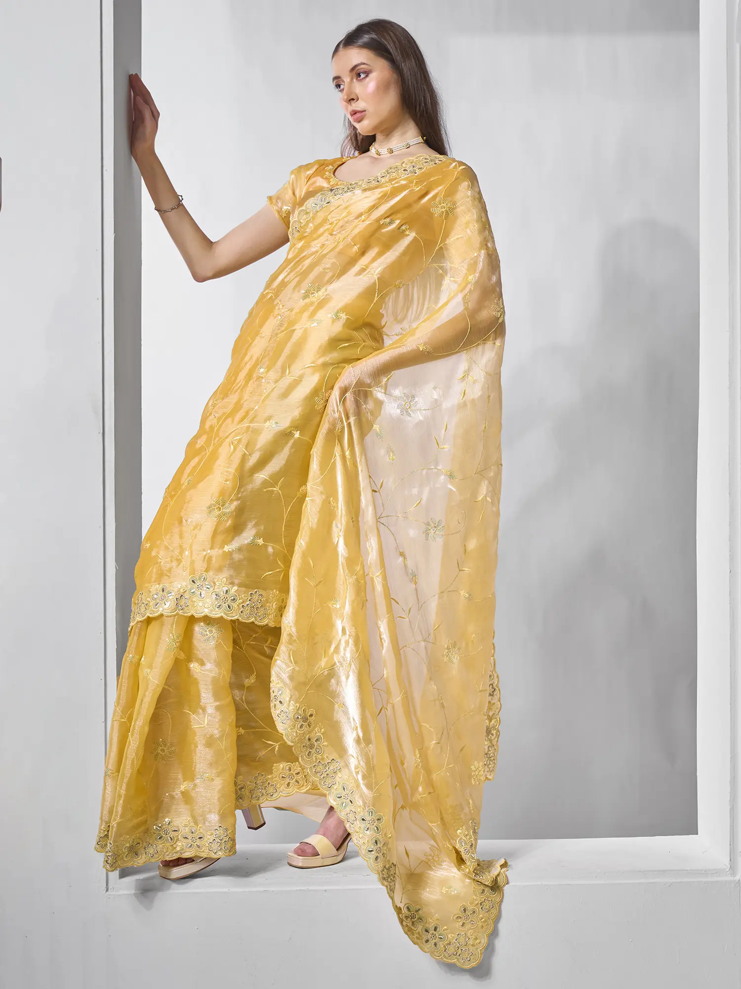 This breathtaking Burberry silk saree is the epitome of sophisticated style, perfect for weddings and other special occasions. The luxurious, subtly shimmering fabric drapes beautifully, creating an effortlessly elegant silhouette. The delicate floral embroidery work adds a touch of exquisite detail, enhancing the saree's inherent grace. The pale golden yellow hue is both timeless and modern, ensuring you'll radiate confidence and charm. The saree is designed to flatter every figure and make you feel like royalty on your special day.