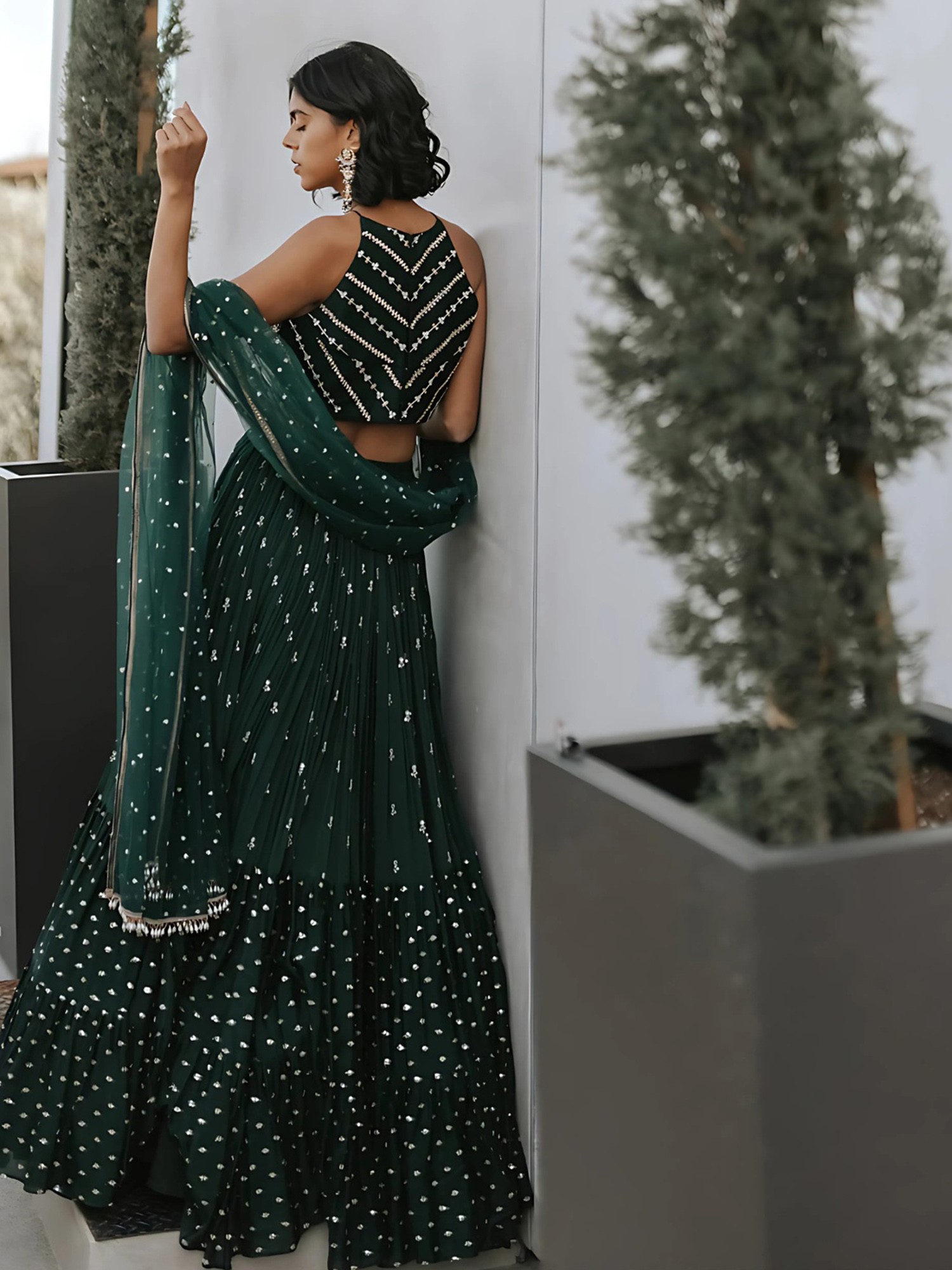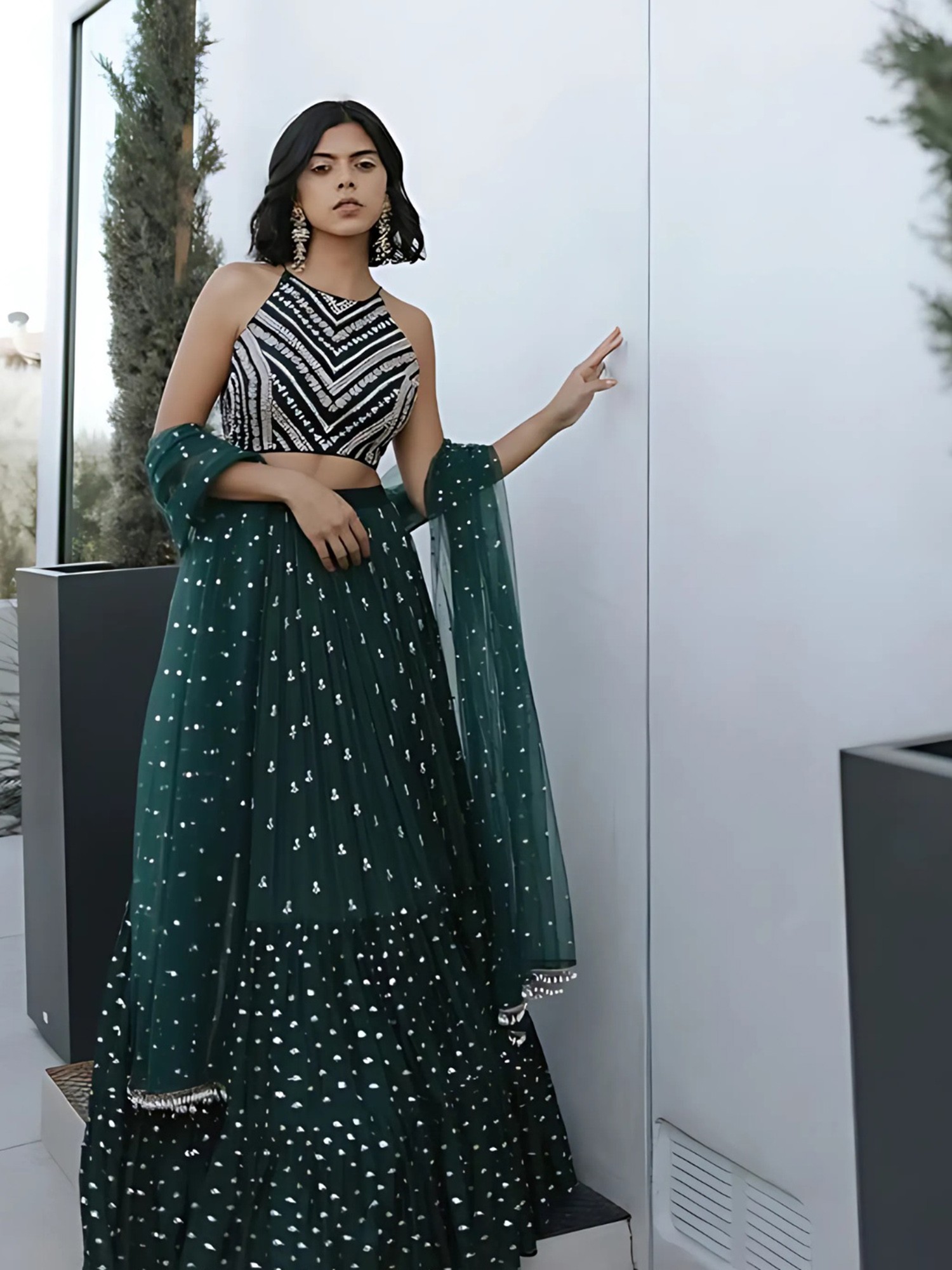 Complementing the majestic lehenga is a stylish halter-neck crop top. The bodice features a striking geometric pattern in contrasting black and silver, meticulously embellished with sequins. This modern cut beautifully balances the traditional silhouette of the lehenga, creating a contemporary and fashionable look. The set is completed with a sheer georgette dupatta, also embellished with scattered sequins that echo the lehenga's design. The dupatta's edges are finished with a beaded trim, adding a final flourish of sparkle and sophistication. Together, these pieces create a harmonious and undeniably glamorous ensemble.