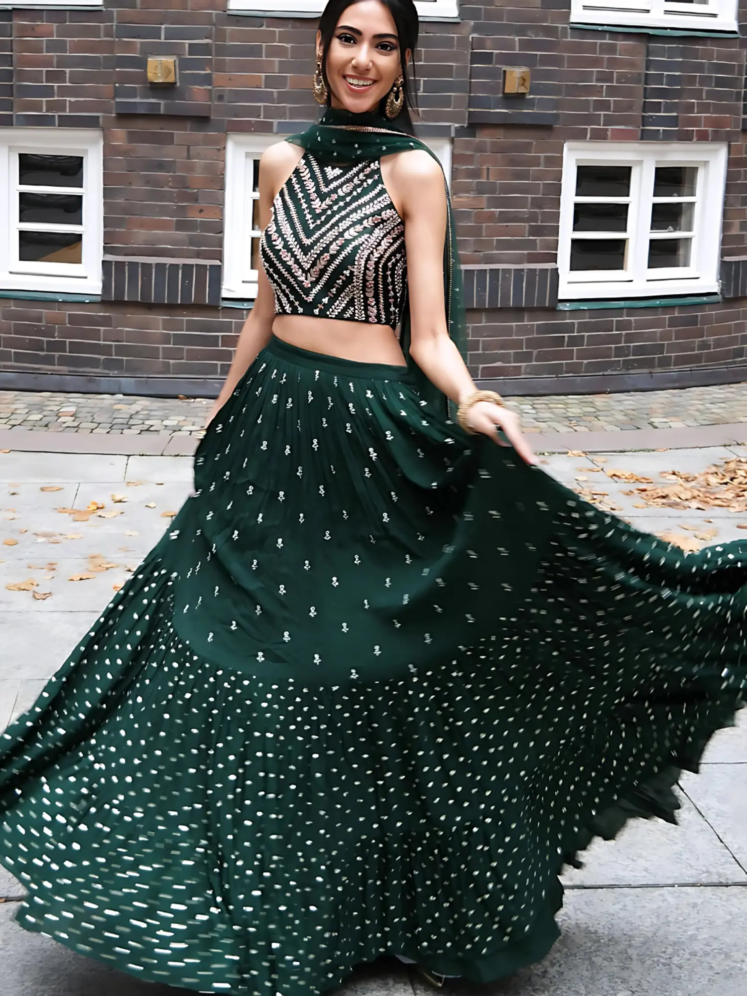 Step into the spotlight with this exquisite Lehenga Choli set, designed to make you the center of attention at any celebratory occasion. Crafted from luxurious georgette fabric, this ensemble drapes beautifully, offering both comfort and an ethereal flow. The deep, rich hue of the lehenga is adorned with a scattering of shimmering sequins and intricate embroidery, creating a captivating play of light and texture that is sure to turn heads.