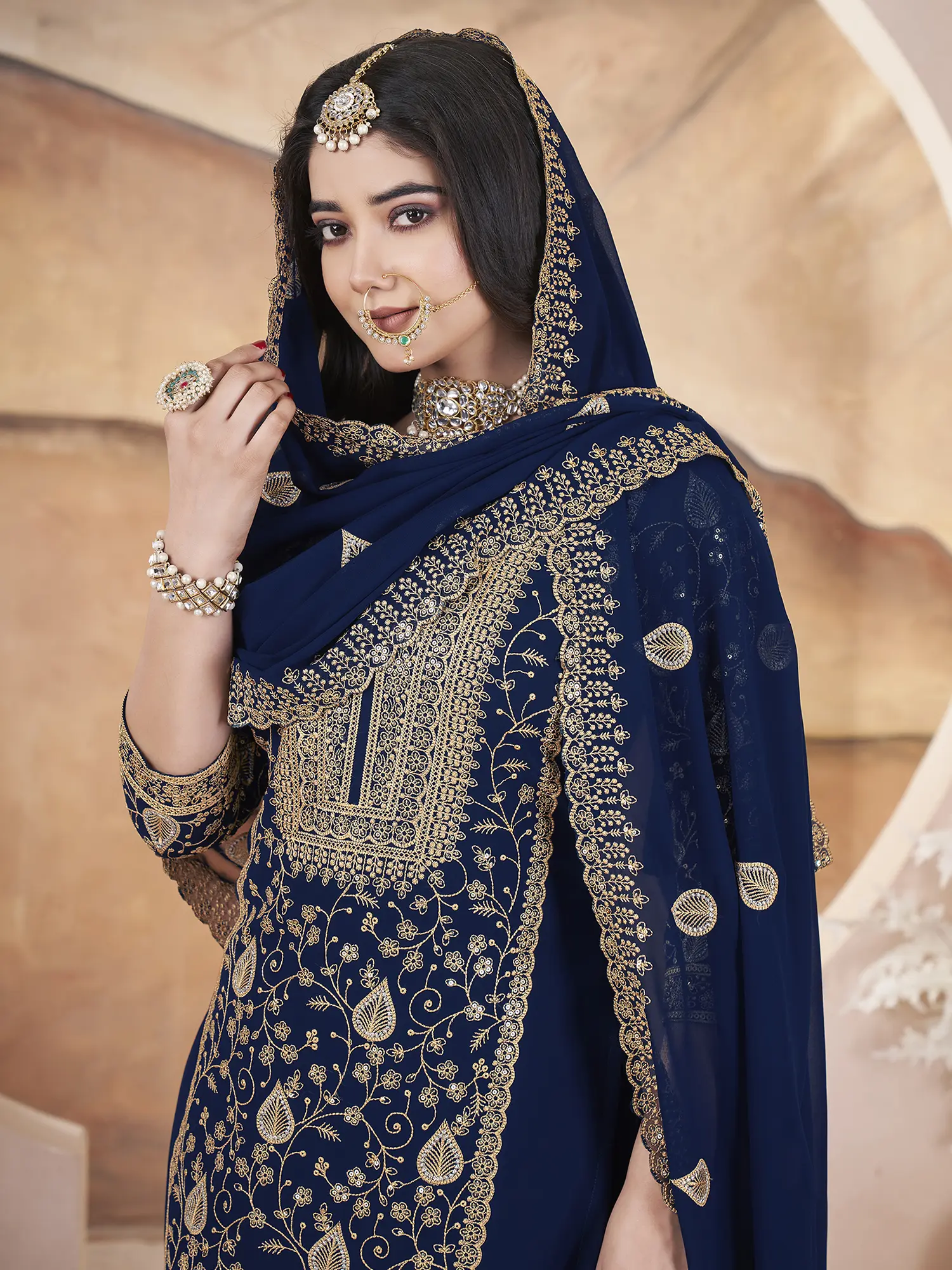 A flowing georgette dupatta completes the look, featuring coordinated embroidery and embellishments.