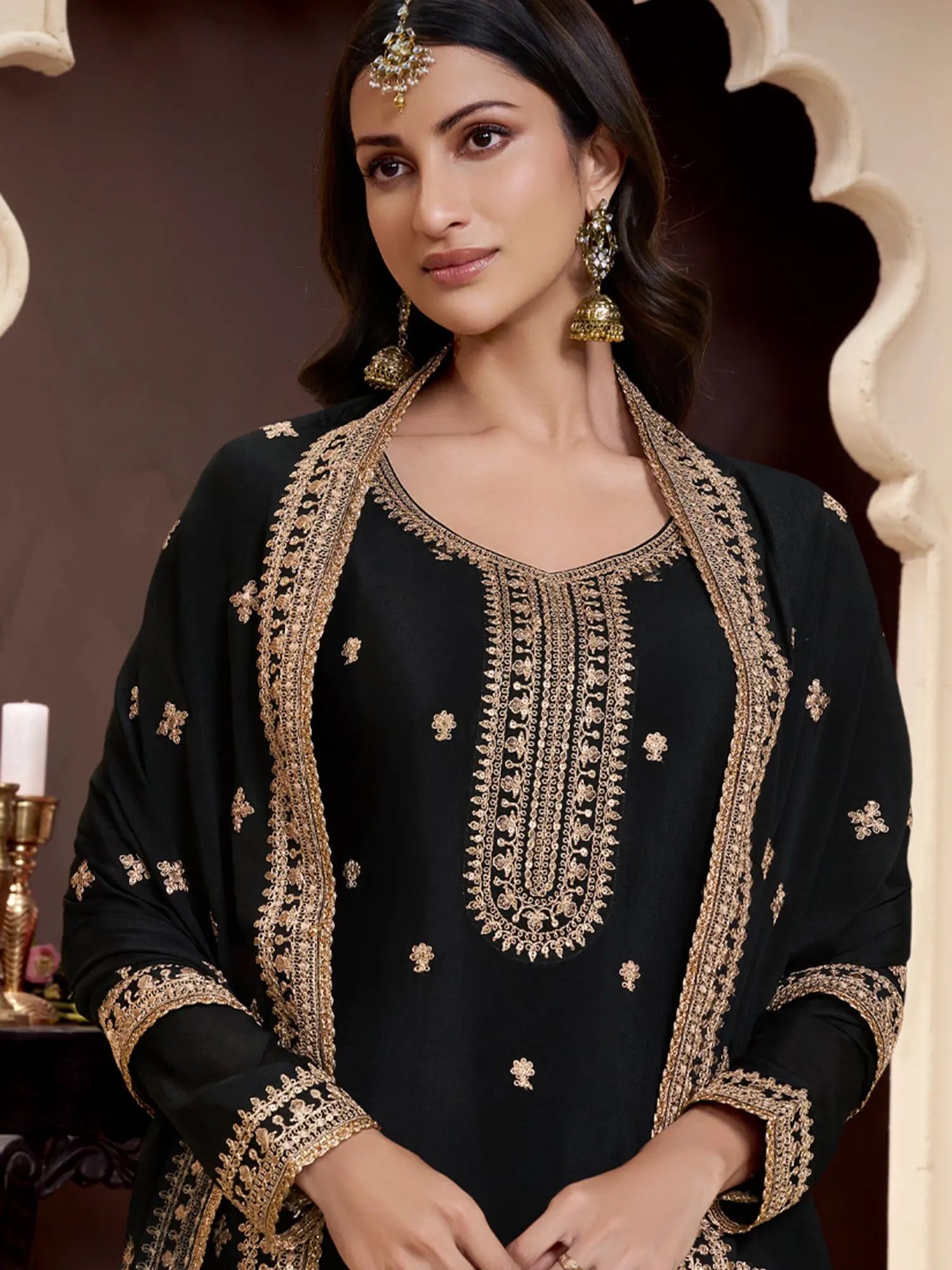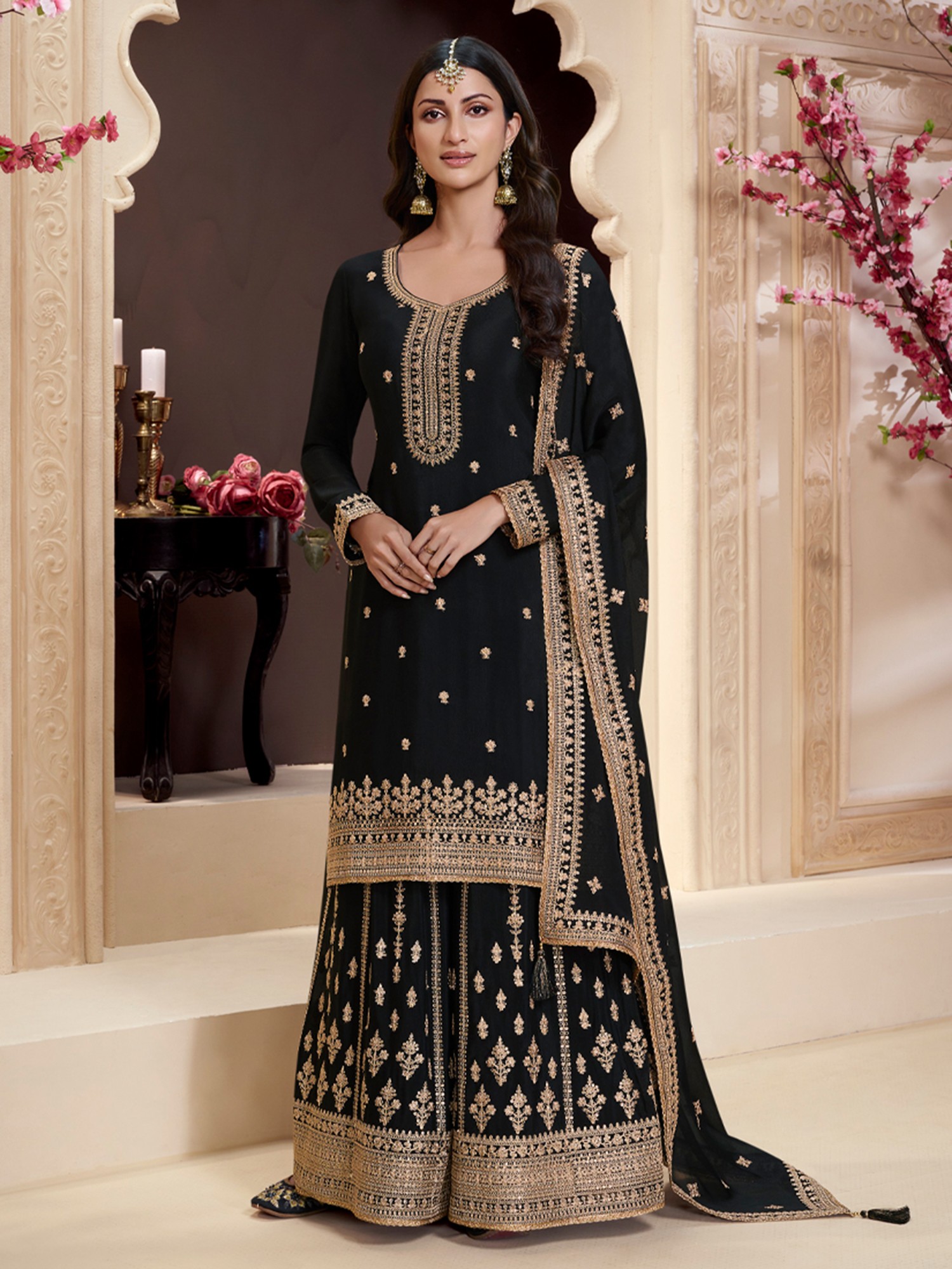 Attractive Thread Embroidery And Sequins Work Chinon Palazzo Suit With Dupatta