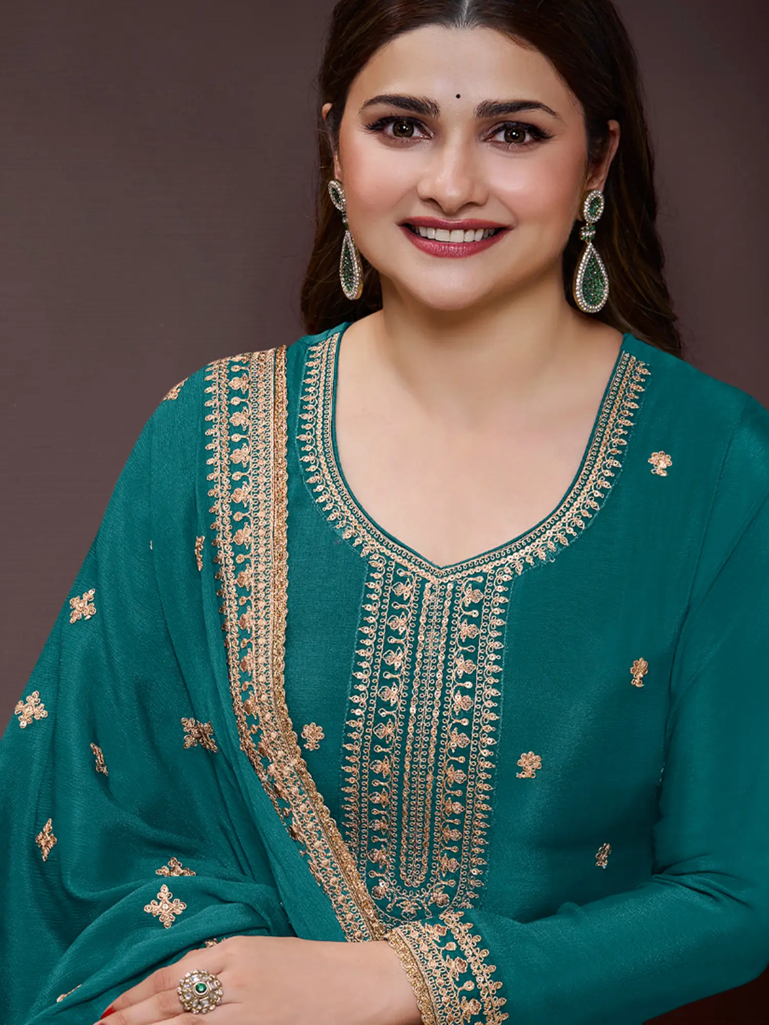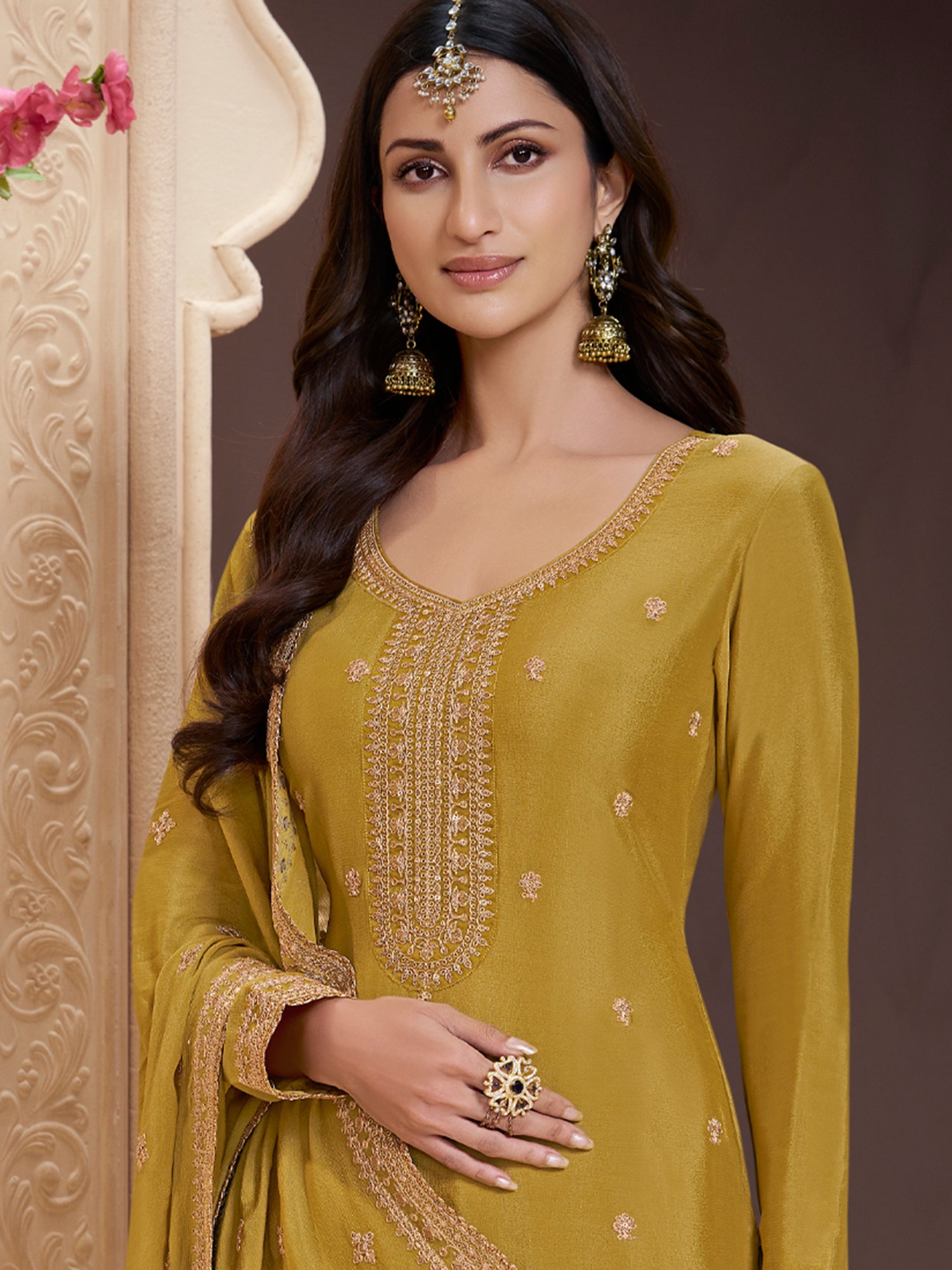Chinon Floral Motif Embroidered Palazzo Suit With Dupatta For Wedding