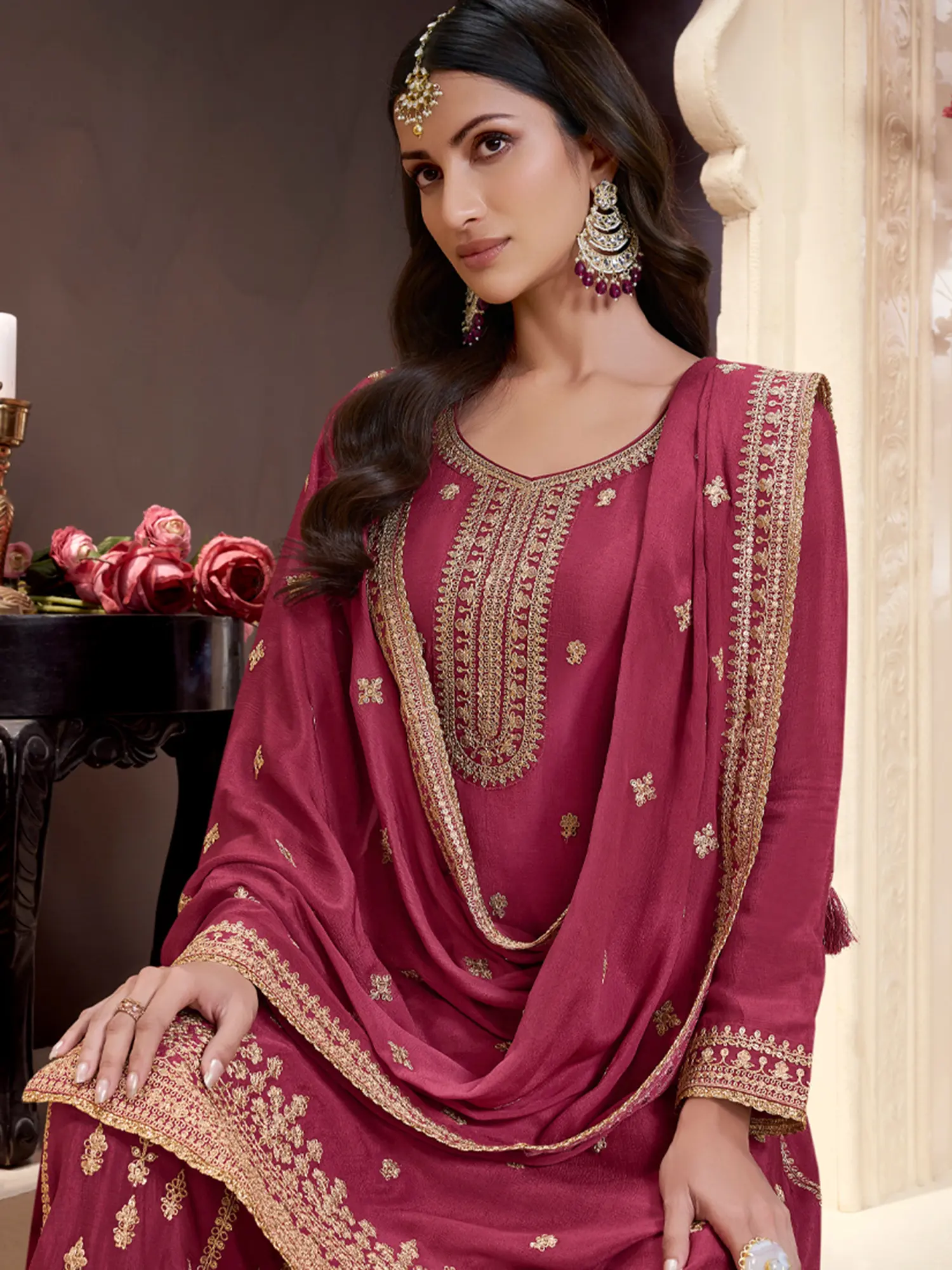 Designer Pink Velvet Palazzo Suit With All Over Embroidery And Chanderi Dupatta Ethnic Wear