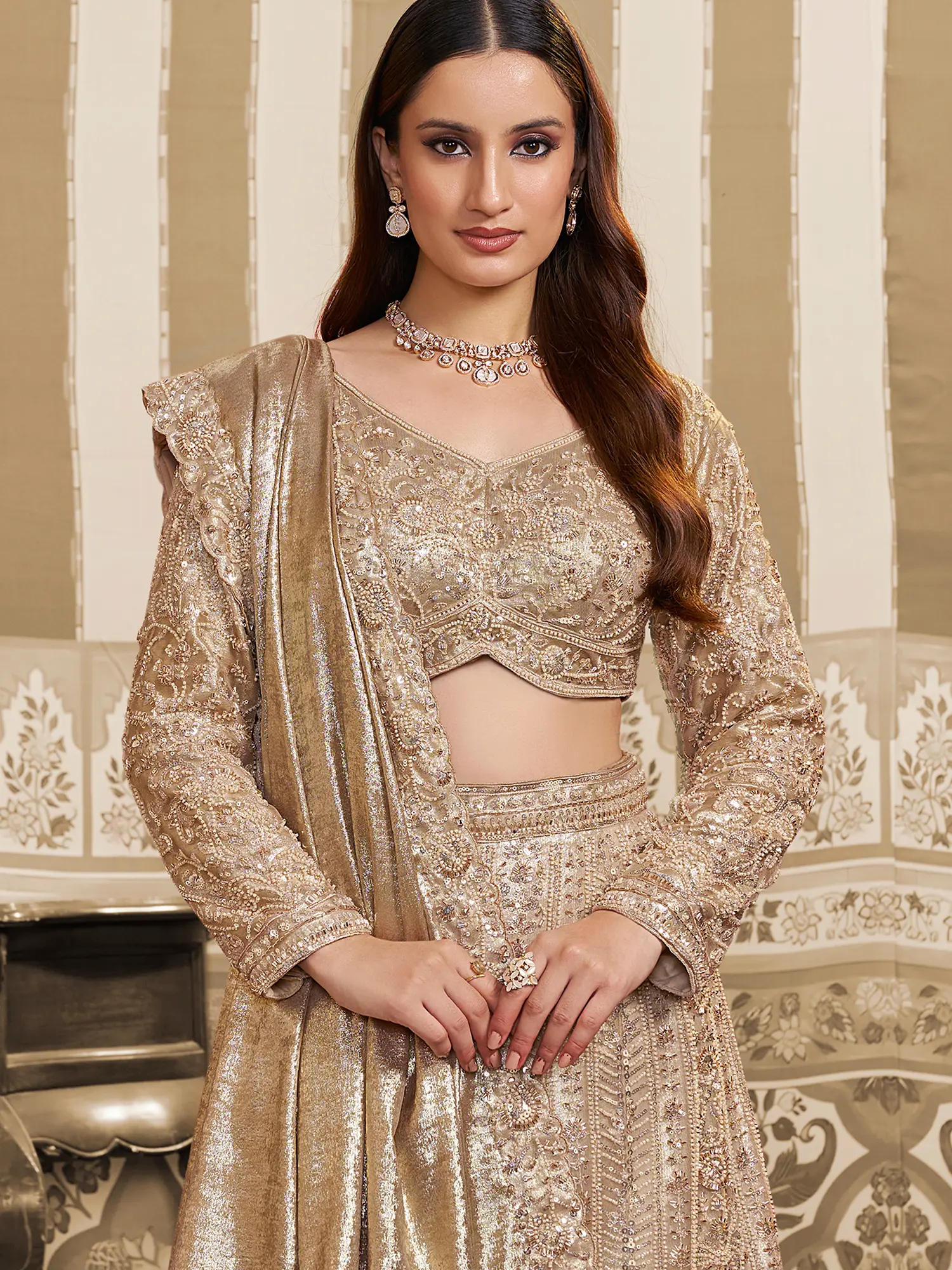 Frosted-Almond Two-Piece Lehenga Choli with Aari-Embroidered Flowers and Gota Patch Border