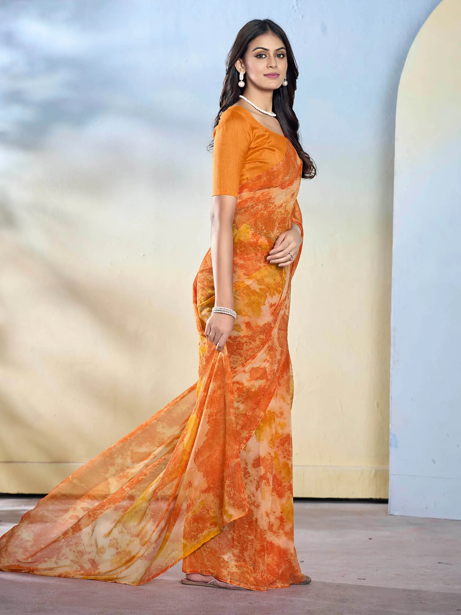 This saree features a captivating abstract print in a rich color palette of oranges and yellows. The design is both eye-catching and subtle, making it a versatile piece you can style in a variety of ways. The soft georgette fabric drapes beautifully, accentuating your figure without being restrictive. The saree is designed to offer a perfect blend of traditional grace and contemporary style. It's the perfect choice for women who appreciate both comfort and elegance. The half-sleeved blouse complements the saree’s design, adding a touch of sophistication to the overall look.