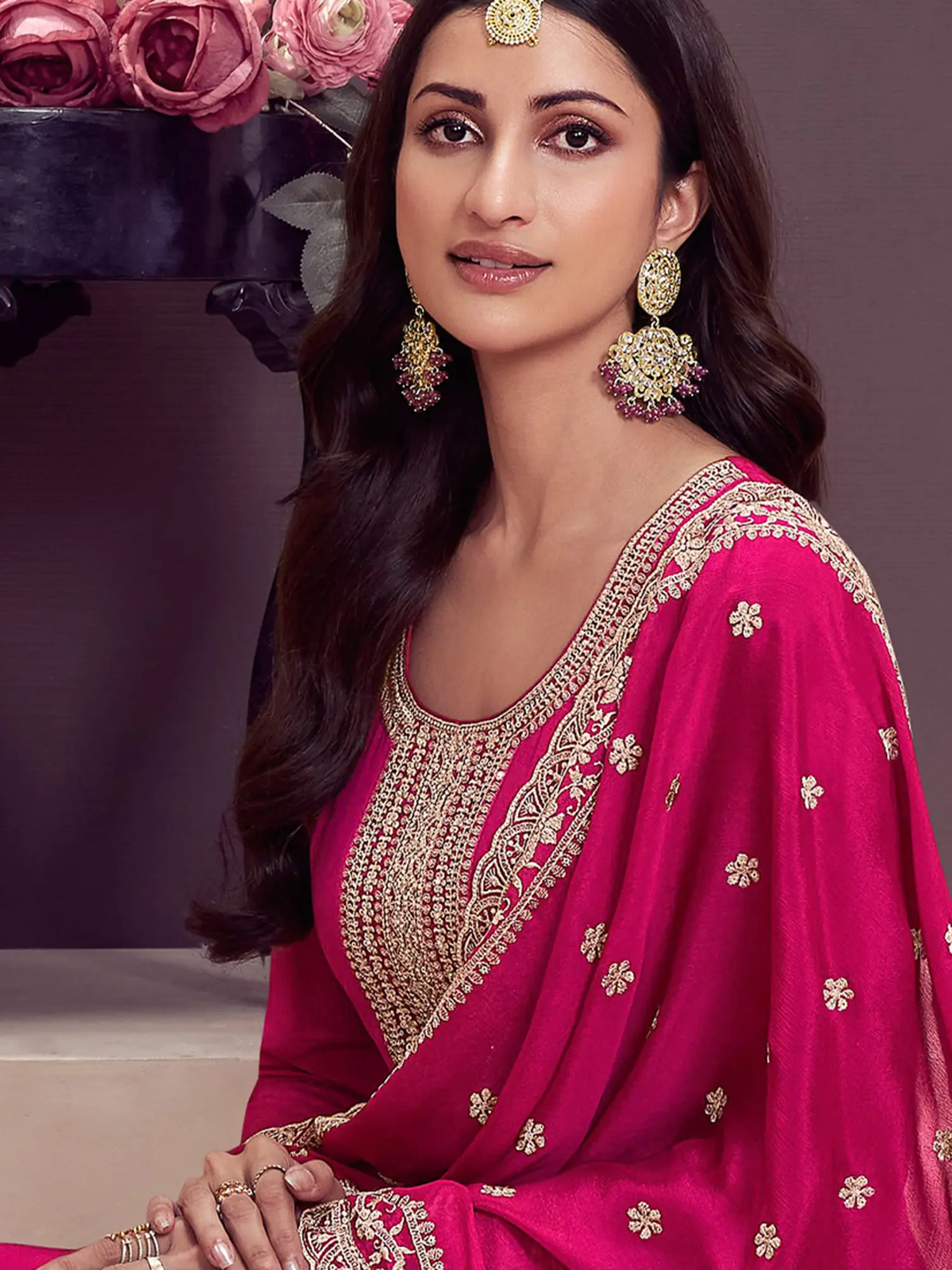 This beautiful Anarkali suit is fabricated using Chinon, known for its lightweight feel and elegant drape. The fabric allows for a comfortable and breathable fit, making it ideal for wearing for long hours, whether you're attending a festive celebration or a formal gathering. The smooth texture of the fabric further enhances the overall elegance and sophistication of the ensemble.