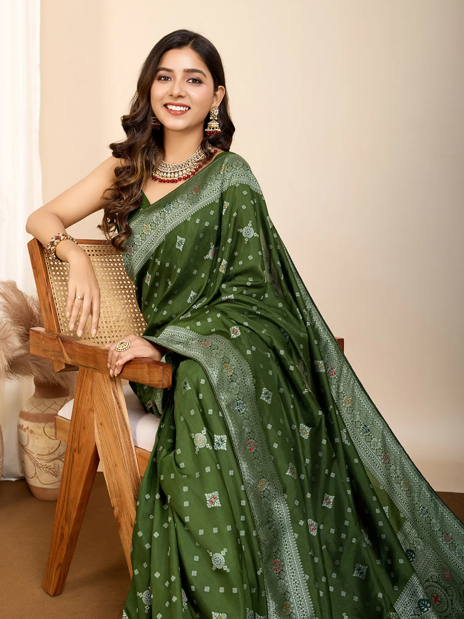 The saree features a captivating all-over woven pattern, a testament to skilled artisans. Small, diamond-shaped motifs are scattered across the main body, interspersed with larger, more elaborate circular designs that feature geometric patterns and subtle pops of color. These intricate details are framed by a broad border, embellished with a sophisticated Bandhani-inspired pattern in contrasting silver and lighter green threads. The pallu is a true highlight, showcasing an even richer tapestry of woven artistry. It culminates in a border of lustrous gold, accented with delicate, hand-tied tassels in a complementary shade, adding a touch of playful sophistication to this regal garment.