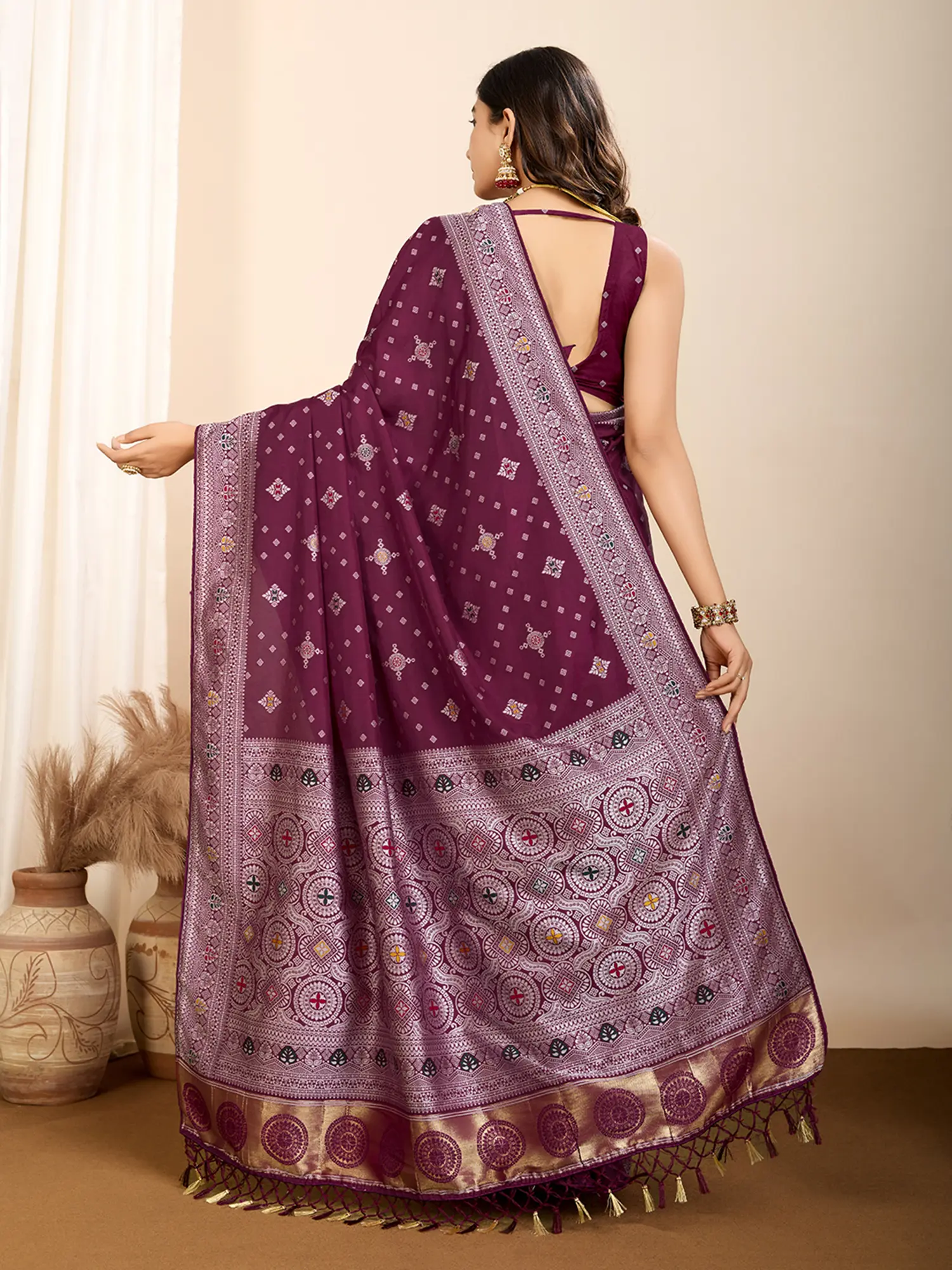 Art Silk Saree: Prism-Violet with Zari Chevron and Peacock Border