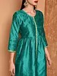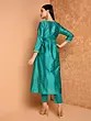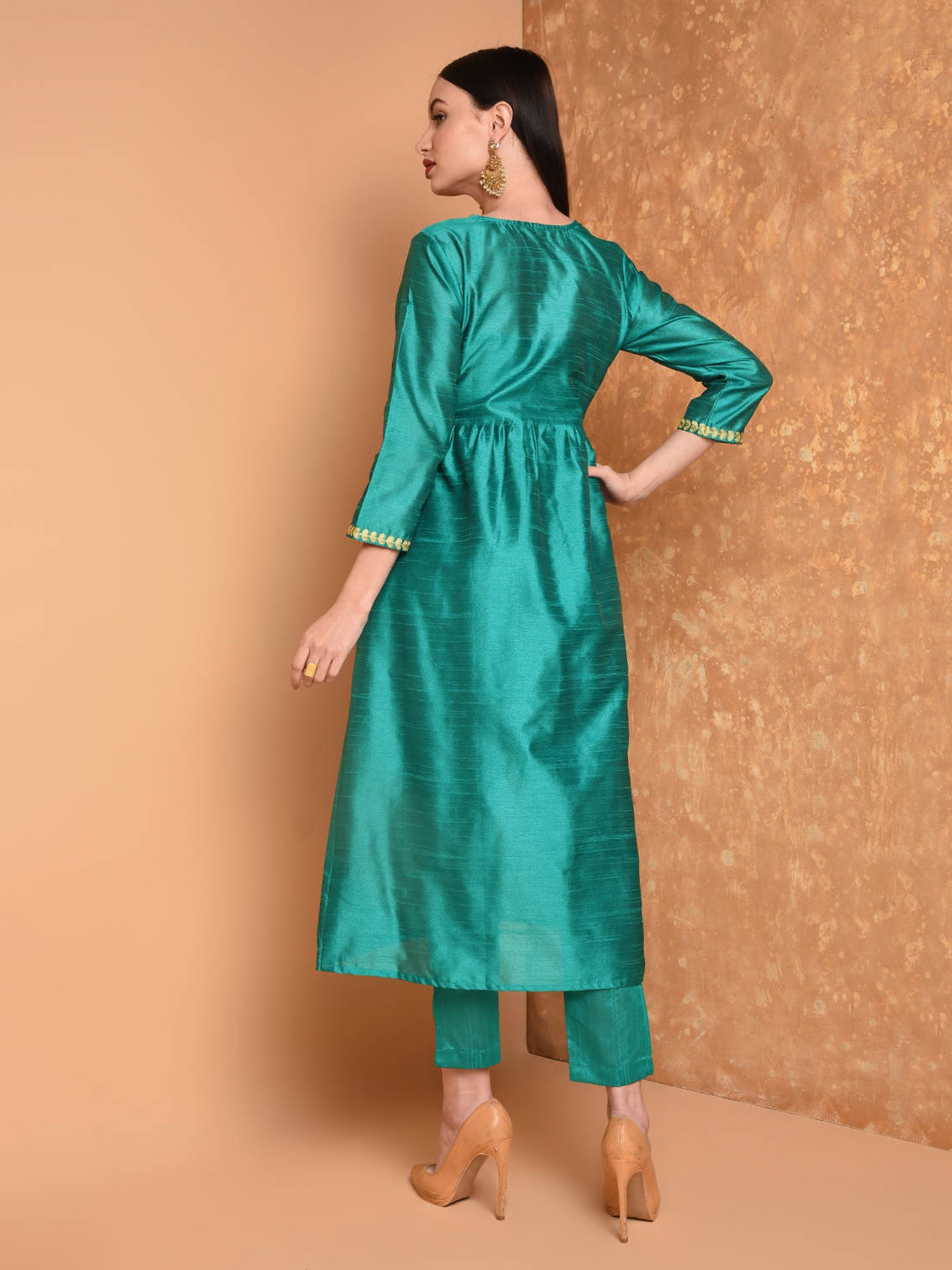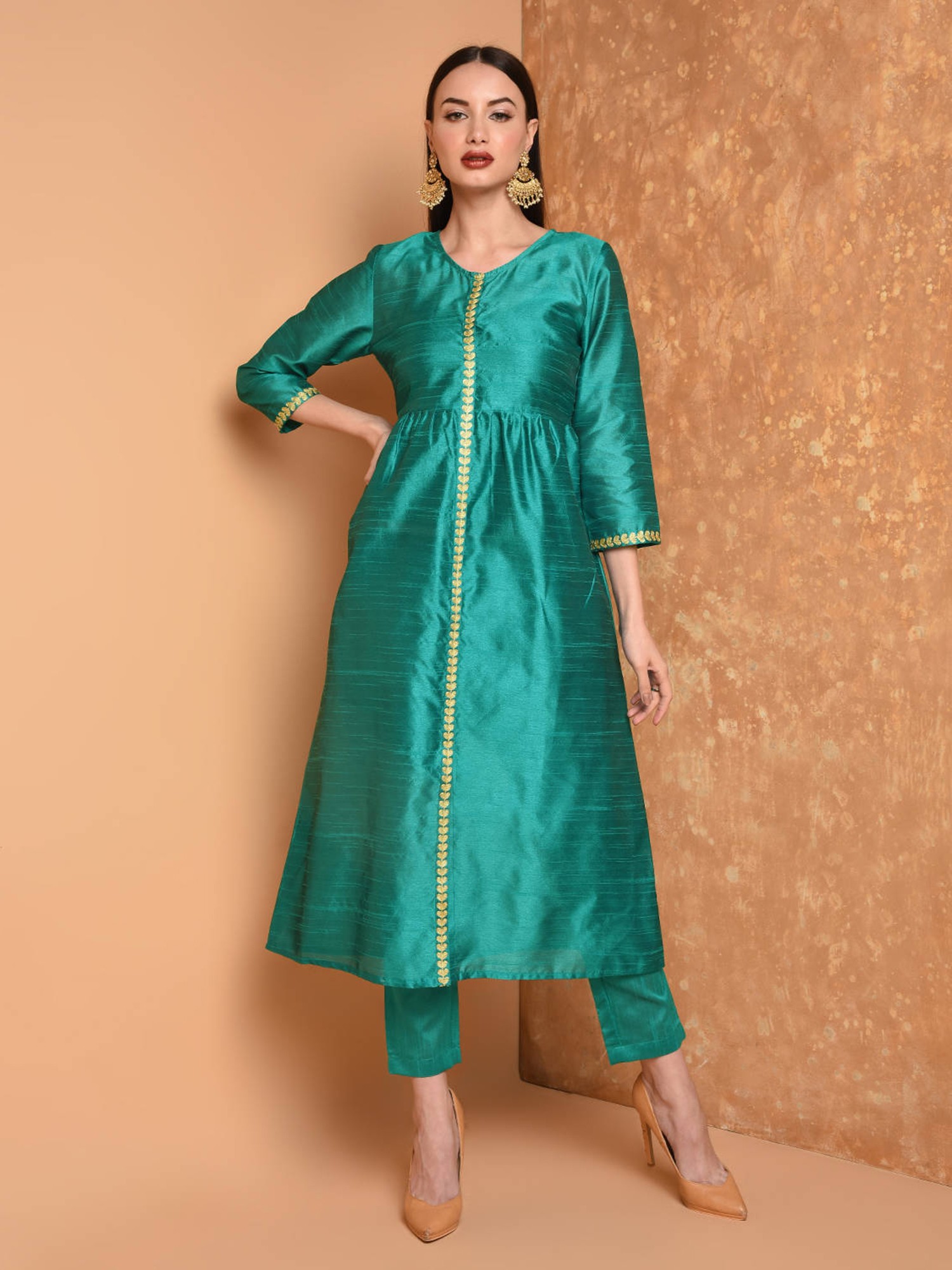 Step into the spotlight with this breathtaking A-line kurta set, meticulously crafted from luxurious silk. The vibrant teal hue evokes a sense of regal elegance, making it the perfect choice for festive occasions, weddings, or any event where you wish to make a sophisticated statement. The natural sheen of the silk fabric drapes beautifully, offering both comfort and an undeniable air of opulence. This ensemble is designed to flatter, with its classic A-line silhouette that flares gently from the waist, creating a graceful and feminine profile.