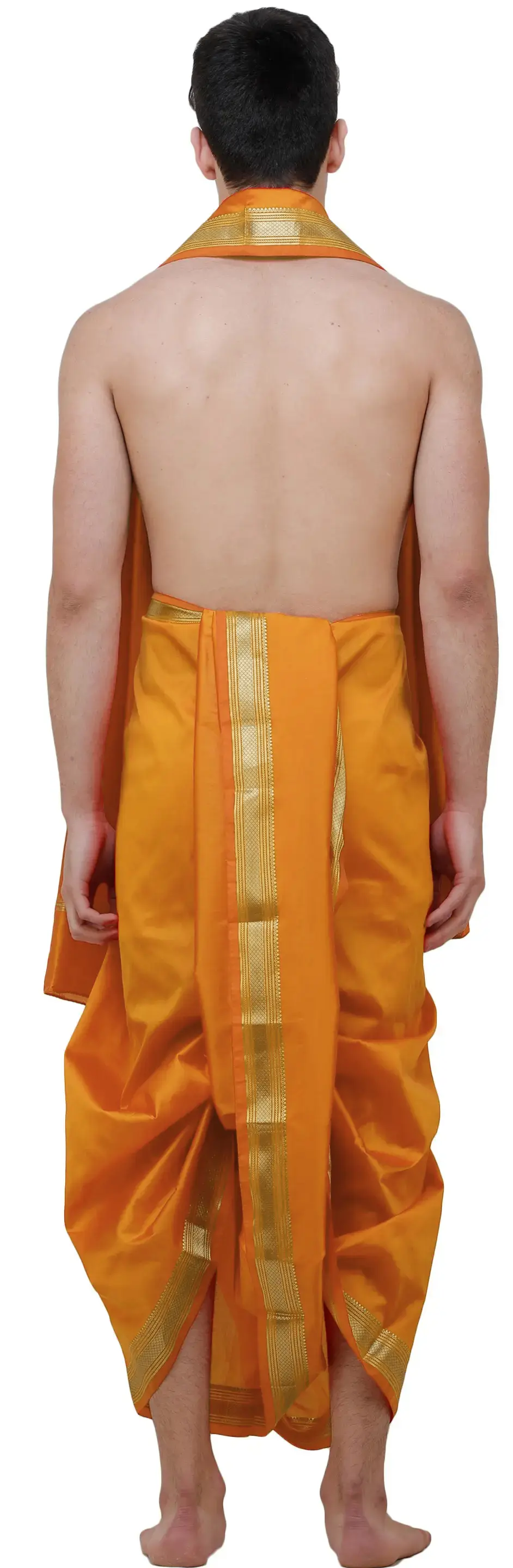 Discover the epitome of traditional Indian menswear with this exquisite Dhoti and Angavastram set, crafted from luxurious art silk. This ready-to-wear ensemble offers a perfect blend of comfort, style, and cultural significance, making it an ideal choice for a wide array of occasions, from religious ceremonies and festivals to weddings and formal gatherings. The vibrant orange hue radiates warmth and auspiciousness, while the meticulously woven wide golden border adds a touch of regal sophistication, catching the light and drawing admiring glances.