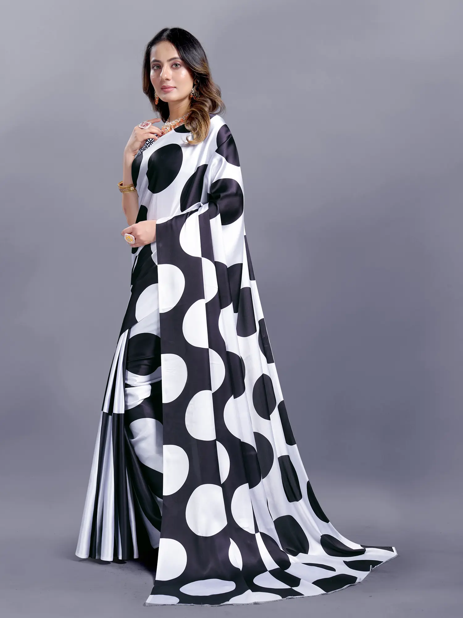 Embrace timeless elegance with this captivating digital print saree, meticulously crafted from luxurious Japan crepe fabric. The striking black and white polka dot design exudes sophistication, perfect for making a memorable impression at any special occasion. The saree's fluid drape and lustrous sheen will ensure you look and feel your absolute best. This saree is more than just an outfit; it's a statement piece that reflects your impeccable style.