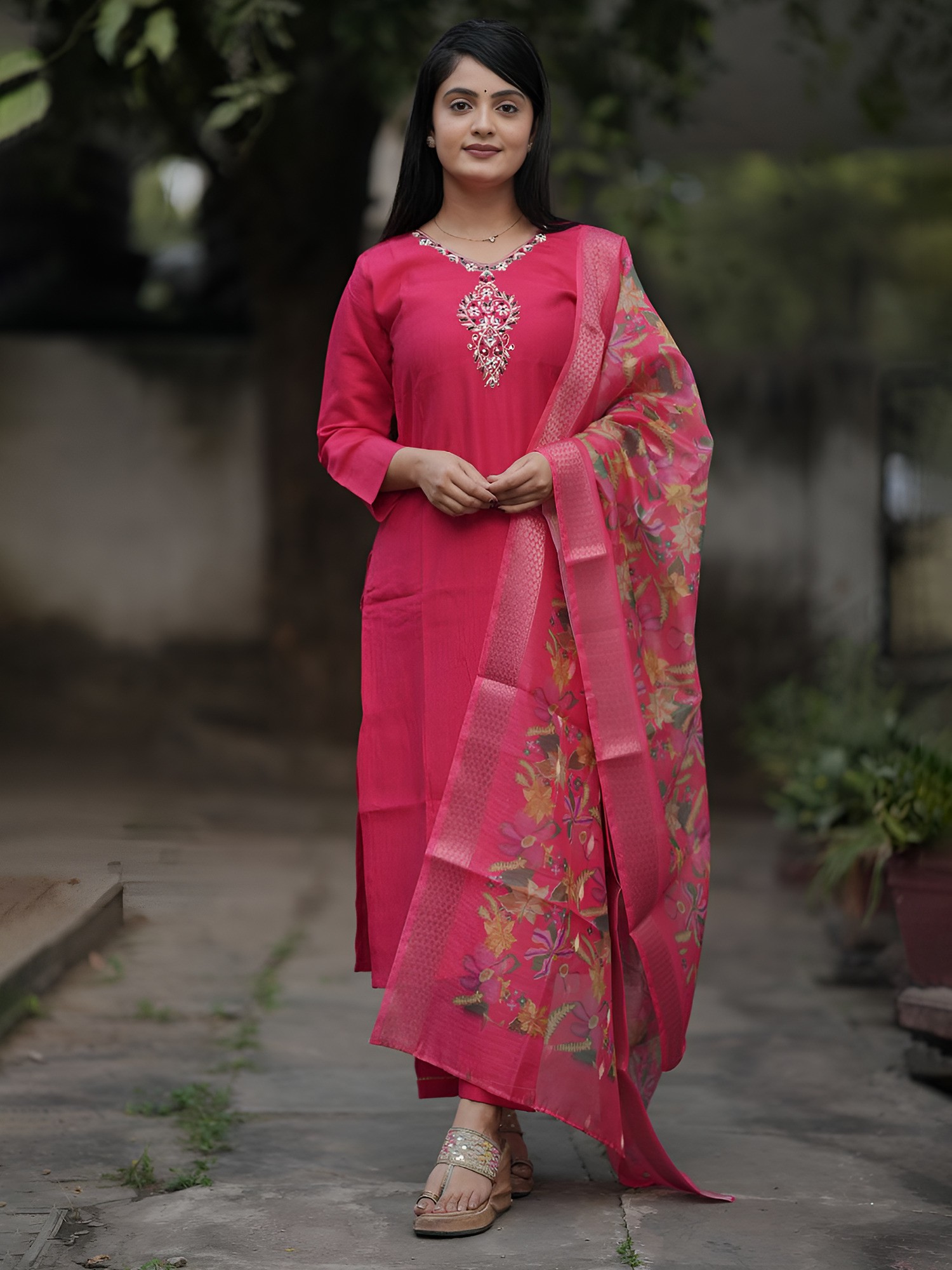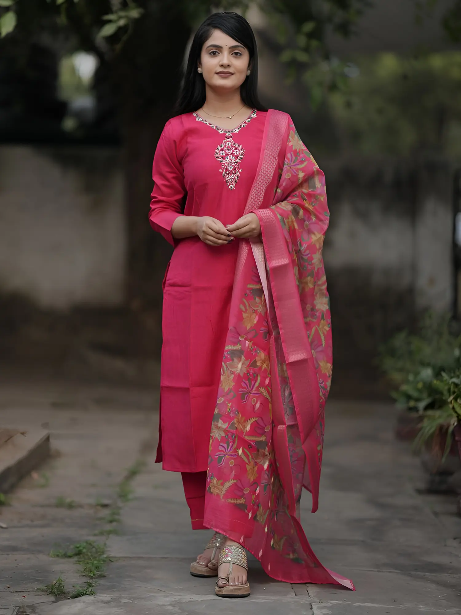 Step into the spotlight with this salwar suit, a fusion of traditional grace and contemporary design. The vibrant hue of the kurta instantly catches the eye, exuding confidence and joy. The clean, flattering V-neckline is further accentuated by delicate embellishments around the neck, adding a touch of subtle sparkle without overwhelming the overall design. The simplicity of the kurta's silhouette allows its rich color and the intricate detailing to truly shine, making it a statement piece for any festive occasion.