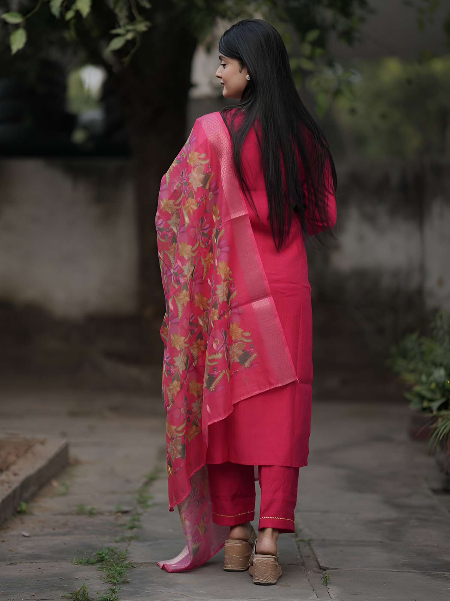 Crafted from premium muslin silk, this salwar suit drapes beautifully and feels luxurious against the skin. The fabric’s inherent sheen enhances the richness of the color, while its breathable nature ensures comfort even during extended wear. The accompanying dupatta features a complementary design, with its digital print mirroring and amplifying the overall festive vibe. The lightweight fabric of the dupatta adds an ethereal touch, allowing for effortless styling and movement.