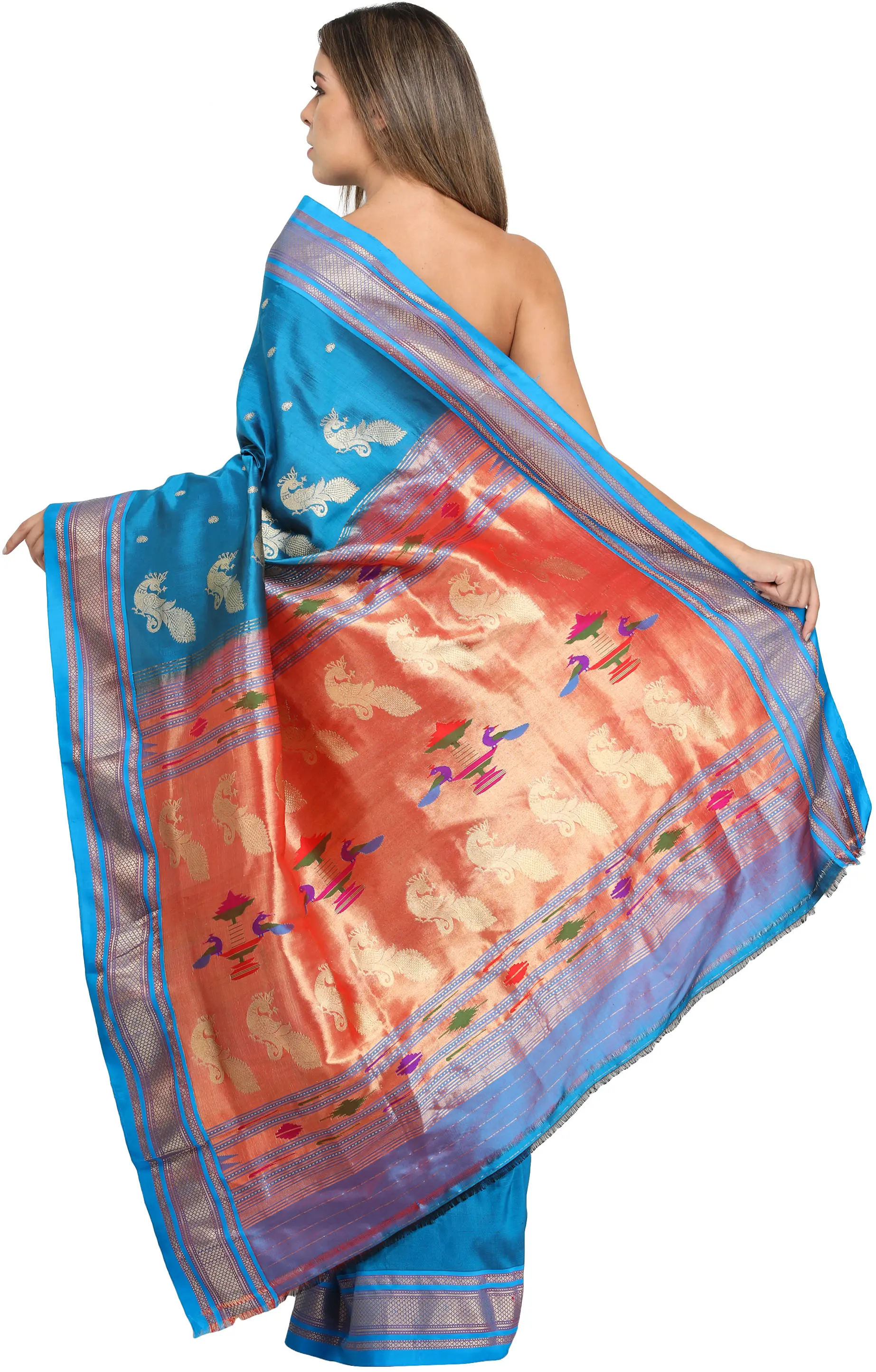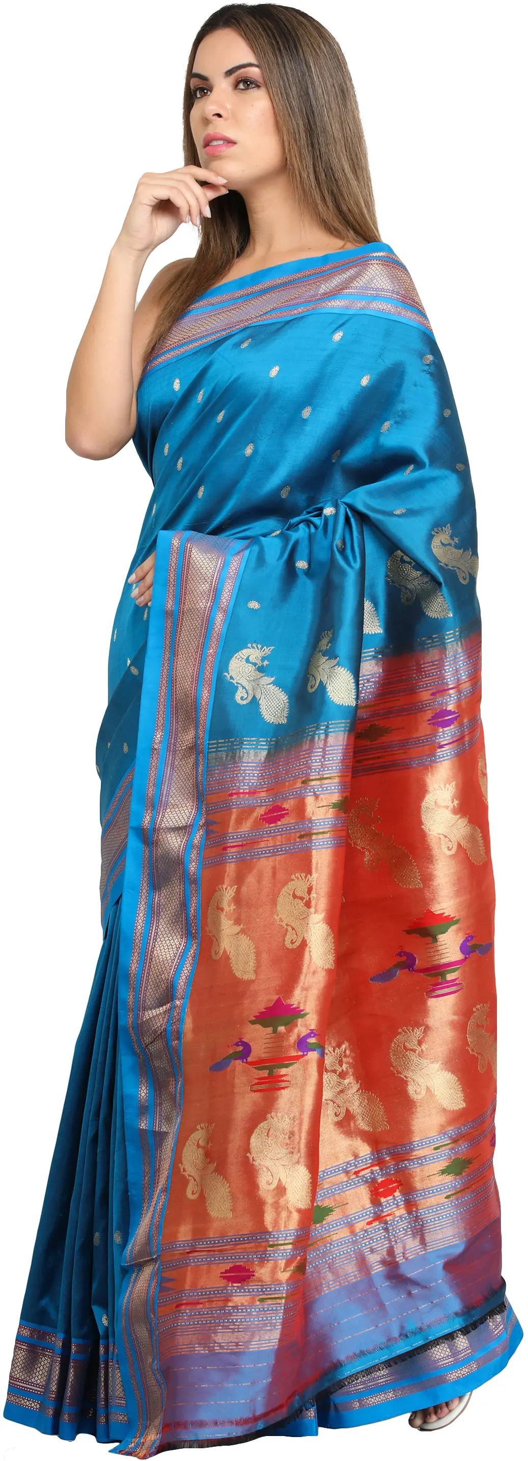 Azure-Blue Brocaded Paithani Handloom Silk Sari from Maharashtra with Peacock Motif Zari-Woven Pallu