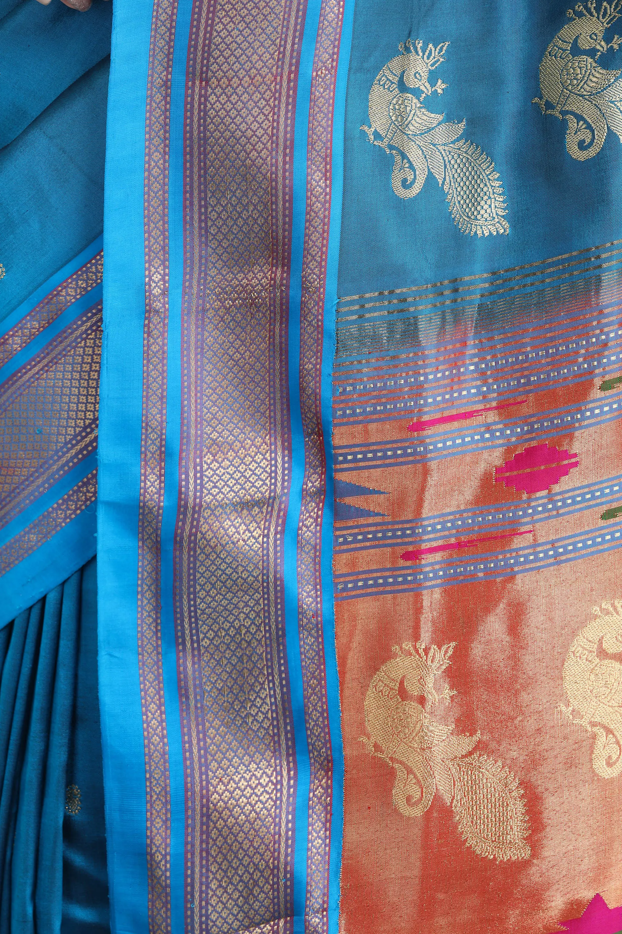 Royal Sheen Ocean Blue Pure Silk Maharani Paithni Saree with Chattai Border and Zari Butta