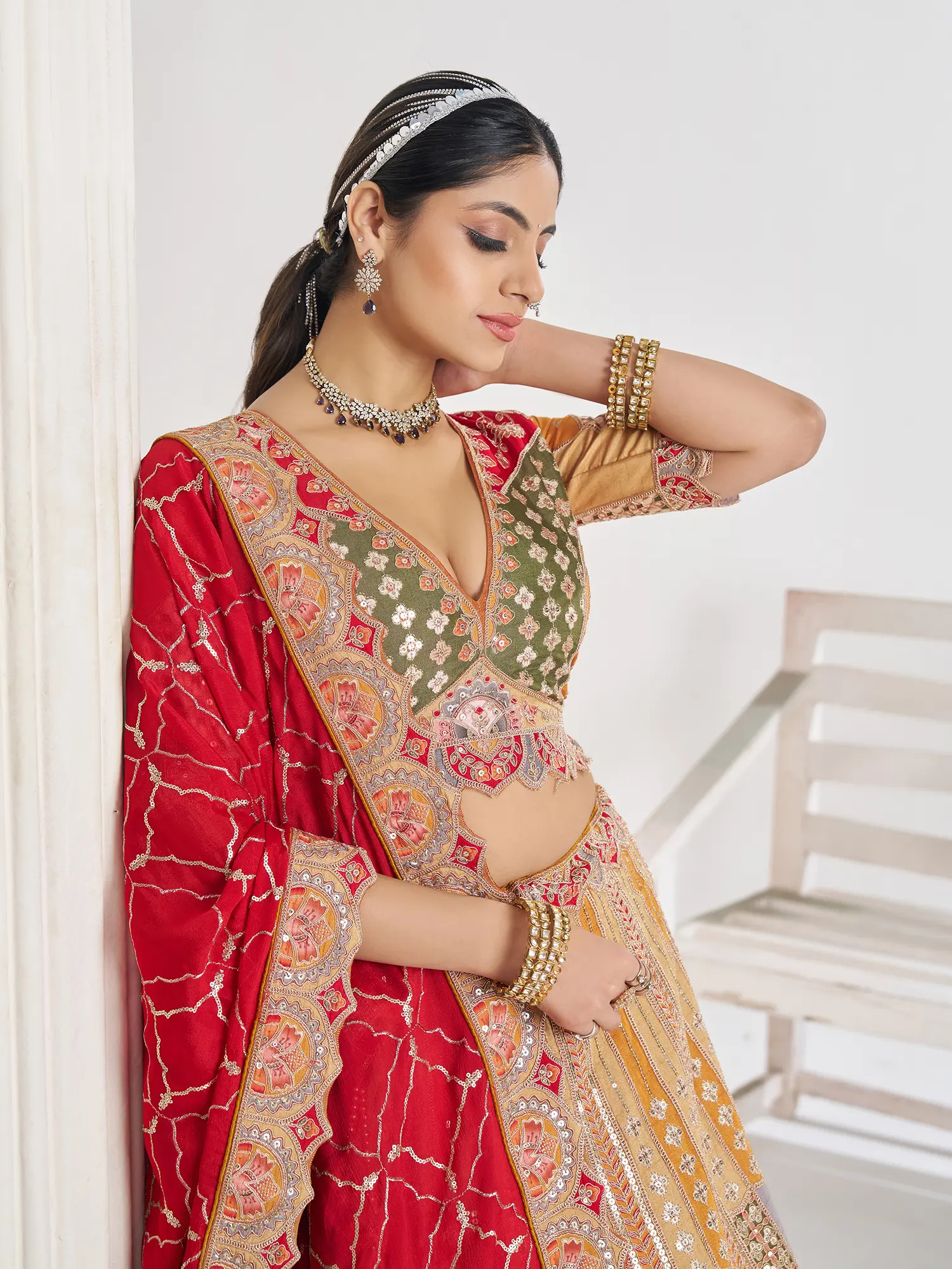 Bottle-Green Net Beads and Golden Thread Embroidery Lehenga Choli with Cutwork Dupatta