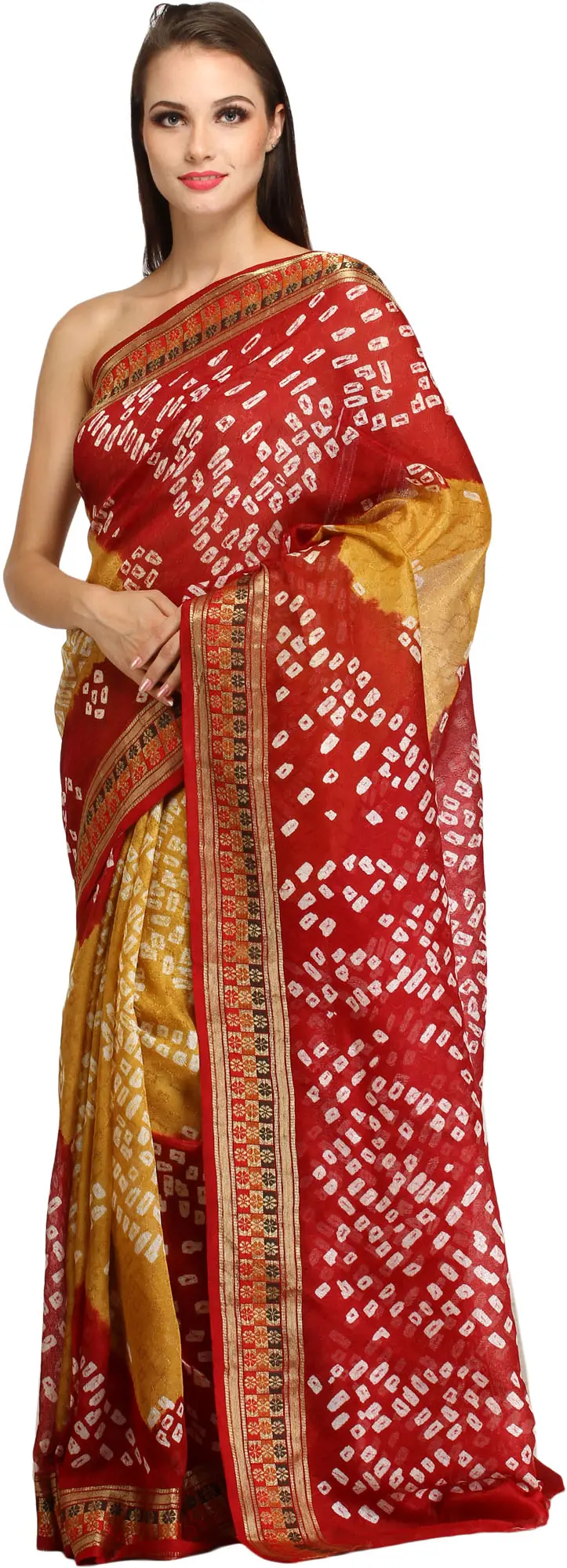Embrace the vibrant spirit of Rajasthan with this exquisite double-colored Bandhani tie-dye sari. Hailing from the artisanal heartland of Jodhpur, this sari is a testament to centuries-old textile traditions, meticulously crafted to bring a touch of regal charm to your wardrobe. The striking interplay of rich red and sunny yellow hues creates a captivating visual symphony, reminiscent of the desert sunsets that paint the skies of this legendary city.