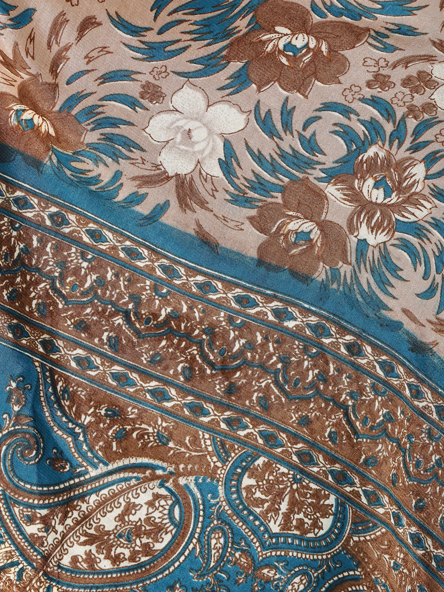 The skirt's luxurious silk viscose fabric drapes gracefully, moving fluidly with each step. Its soft touch against your skin promises comfort throughout the day. The intricate floral print is a masterpiece of design, showcasing a delicate blend of teal and gold hues that dance across the fabric. The double-layered design adds a touch of volume and sophistication, while maintaining a lightweight feel. The skirt's wrap-around style offers versatility, allowing you to adjust the fit to your preference and create a unique look every time you wear it. Whether you prefer a more fitted or flowing silhouette, this skirt effortlessly adapts to your personal style.