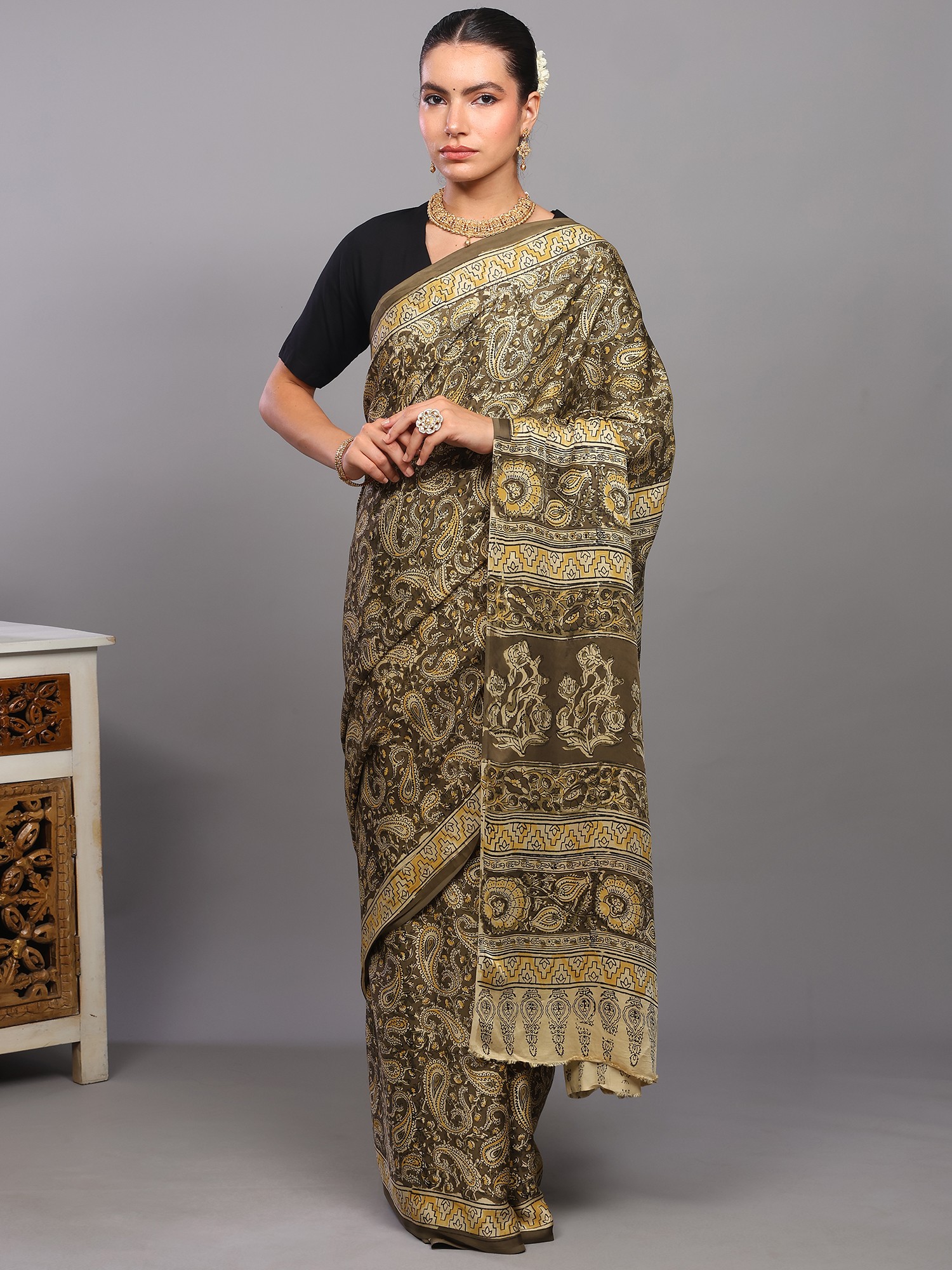 Kalamkari Saree with Printed Jungle Scene and Nandi Ox Border from Telangana