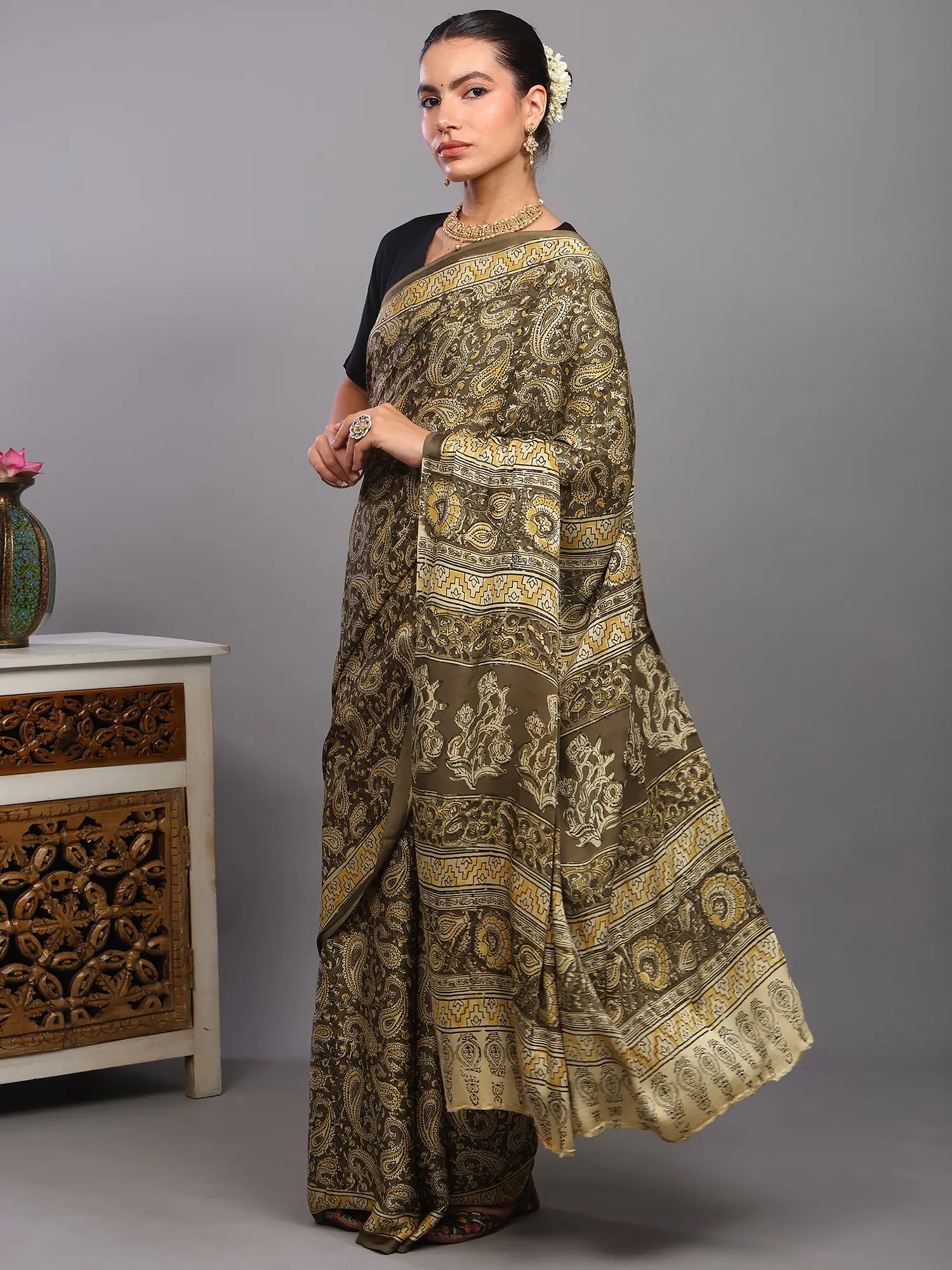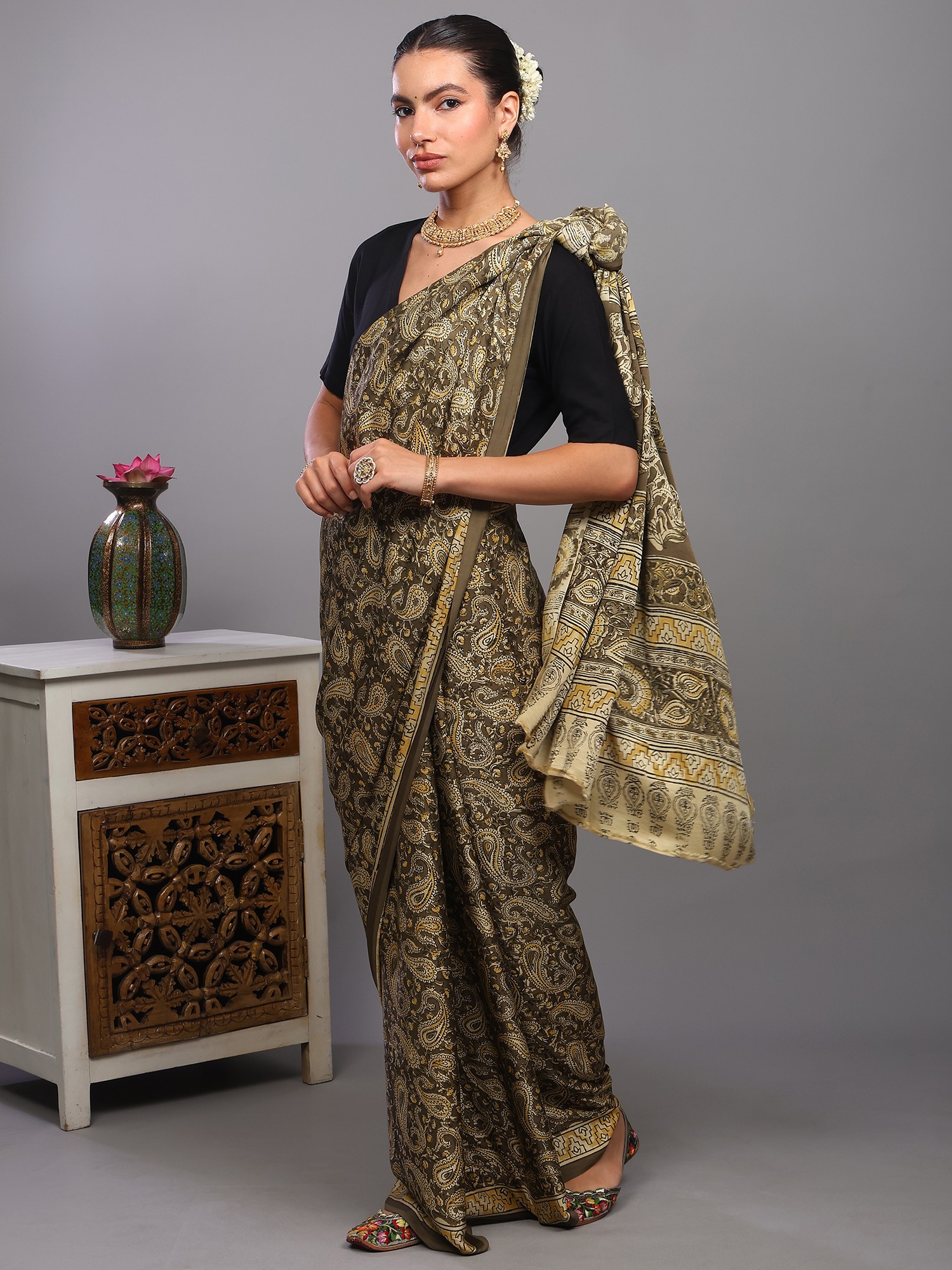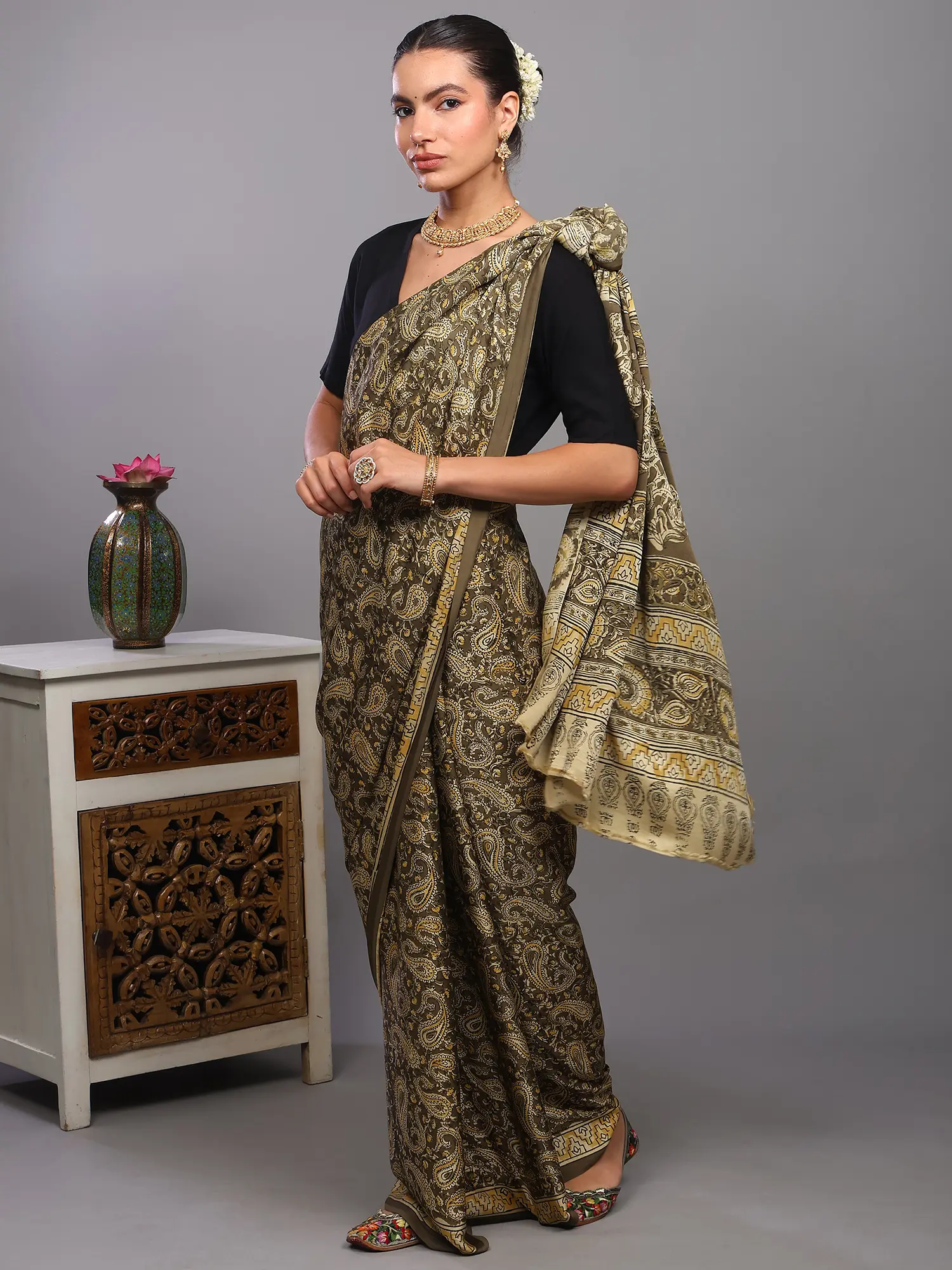 The heart of this saree lies in its captivating paisley vine print. The paisley, a symbol of fertility, abundance, and life, is expertly depicted in a winding, vine-like formation that covers the entire expanse of the fabric. The printing technique, passed down through generations, imbues each paisley with a sense of depth and character. The subtle contrast between the dried-herb base color and the lighter printed hues makes the motifs stand out without being overly ostentatious. This all-over design ensures that the saree looks stunning from every angle, making you the focal point of any occasion.