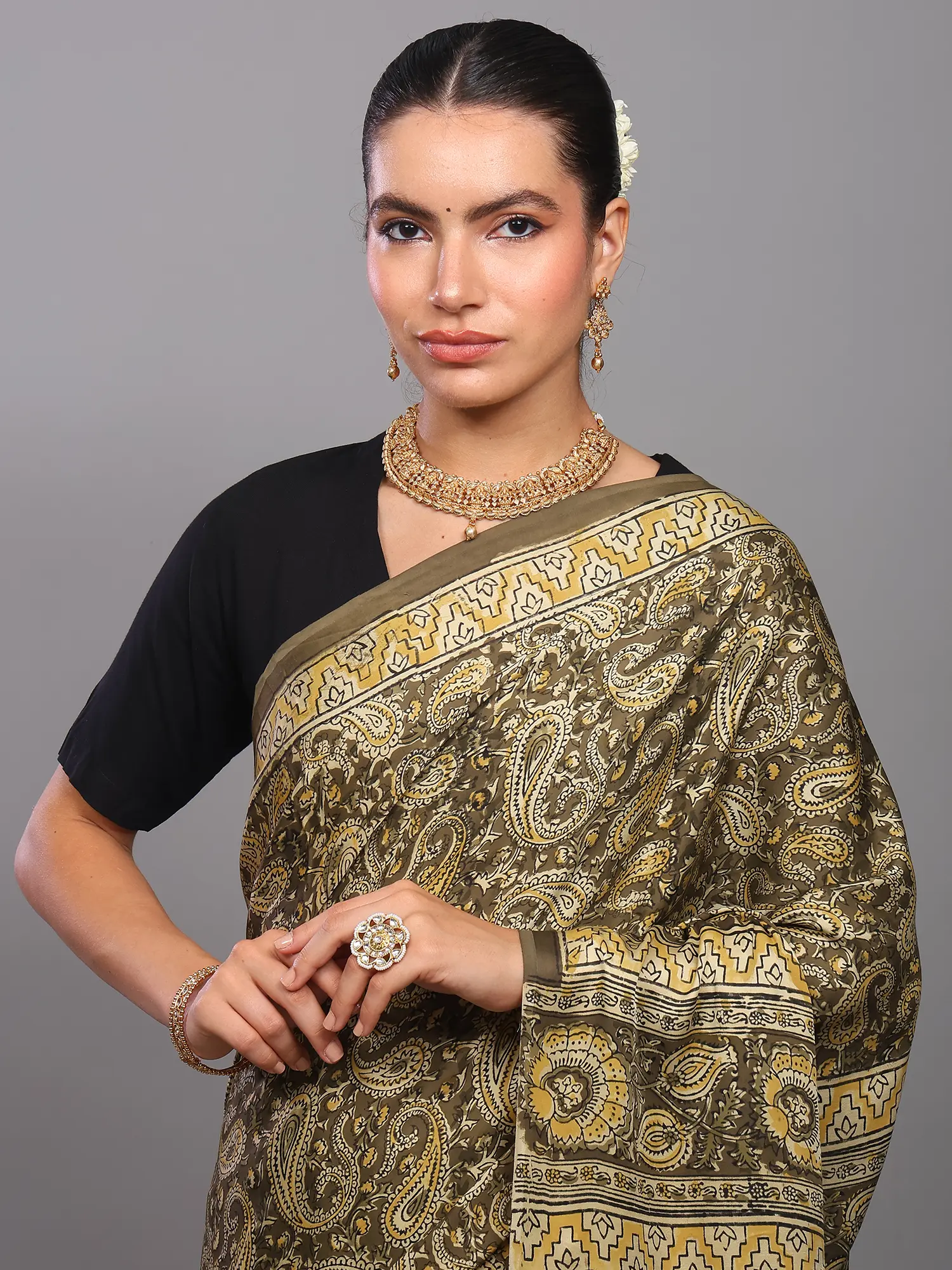 Immerse yourself in the rich heritage of Telangana with this exquisite silk saree, a true testament to traditional Indian artistry. Crafted from luxurious Modal silk, this saree offers a soft drape and a subtle sheen that enhances its intricate design. The deep, earthy tone, reminiscent of dried herbs, serves as a beautiful canvas for an all-over print of delicate paisley vines. Each motif is thoughtfully rendered, creating a mesmerizing pattern that flows gracefully across the fabric.
