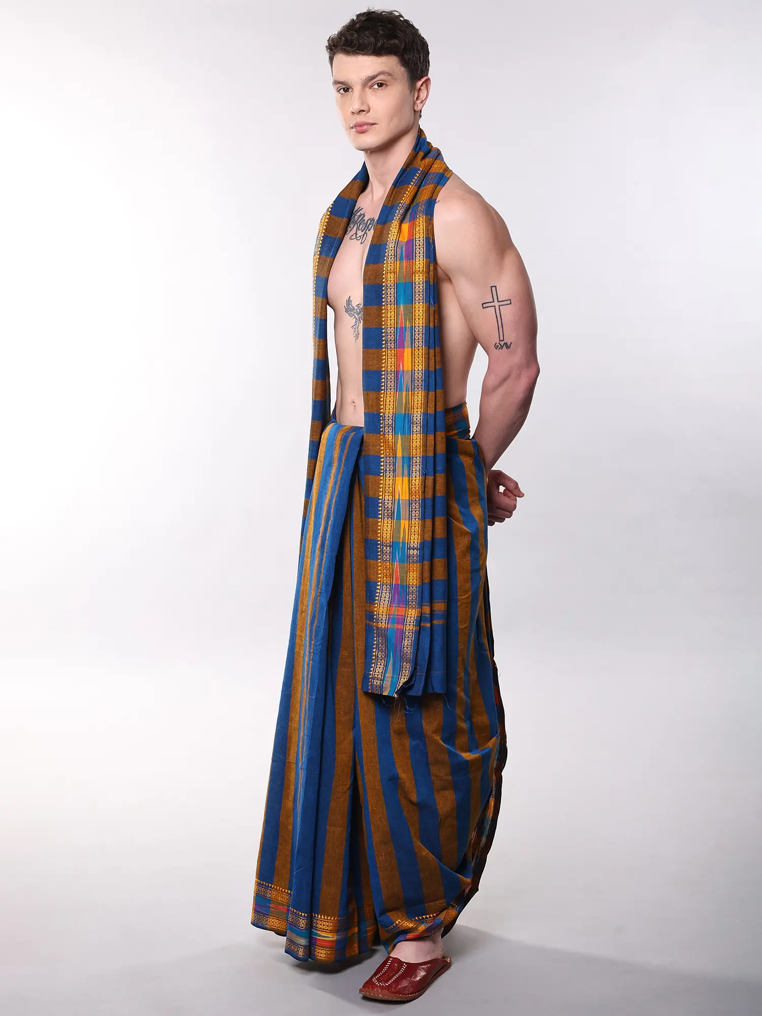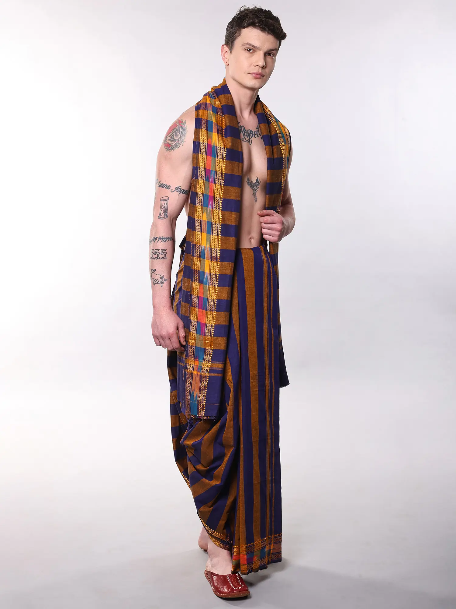 The dhoti features bold dual-color stripes in a captivating interplay of deep navy and warm ochre, creating a dynamic yet harmonious visual appeal. Complementing this is the angavastram, which showcases a vibrant checkered pattern within its border, accented by a unique Ikat weave that draws inspiration from the sacred Rudraksha. The generous dimensions of the dhoti, measuring 180 inches in length and 48 inches in width, allow for graceful draping, while the accompanying angavastram, measuring 90 inches by 48 inches, provides a perfect finishing touch.