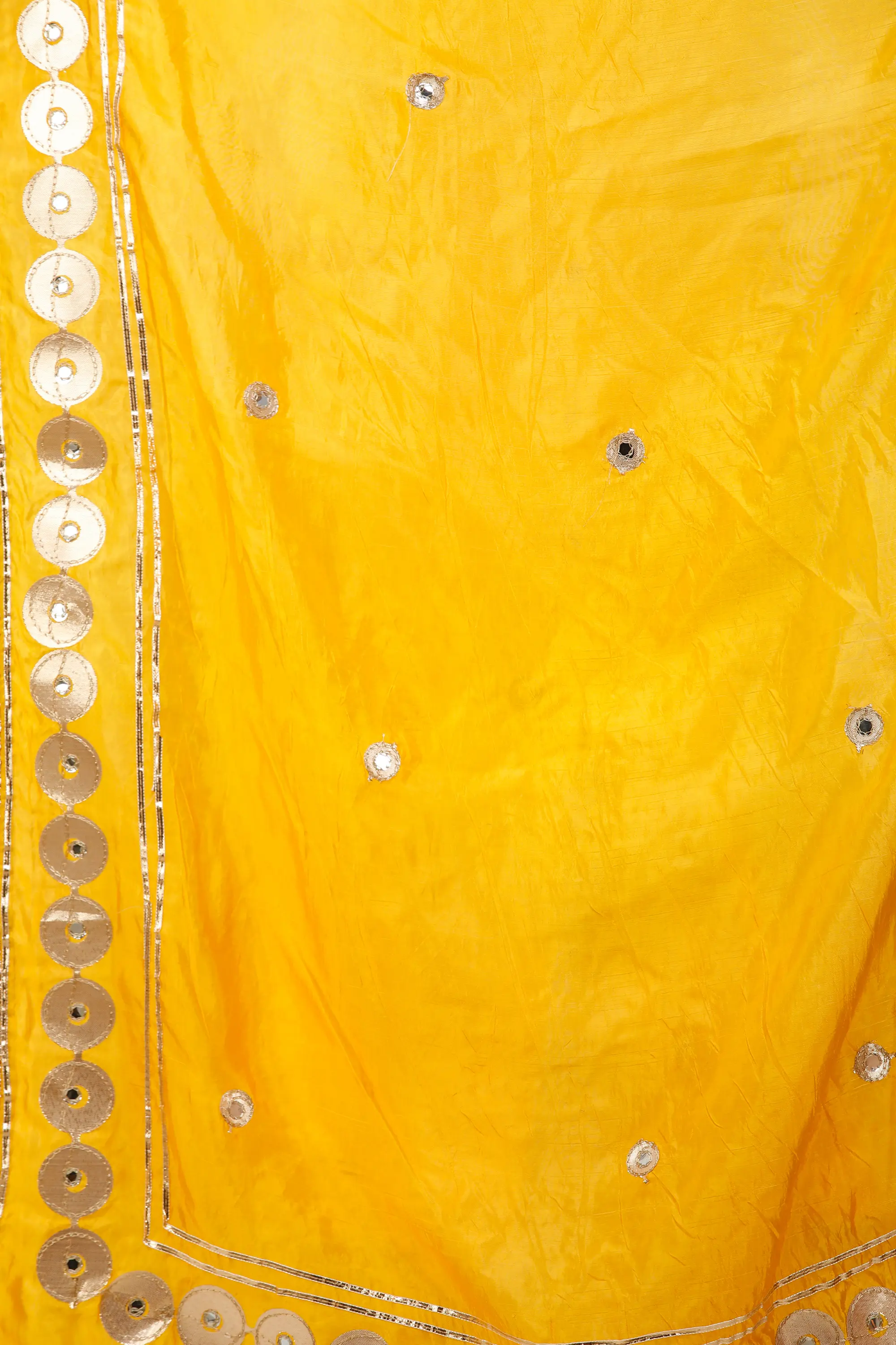 Metallic patchwork and embroidery on the dupatta are beautifully complemented by plastic mirror work across the smooth fabric.