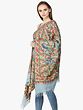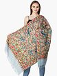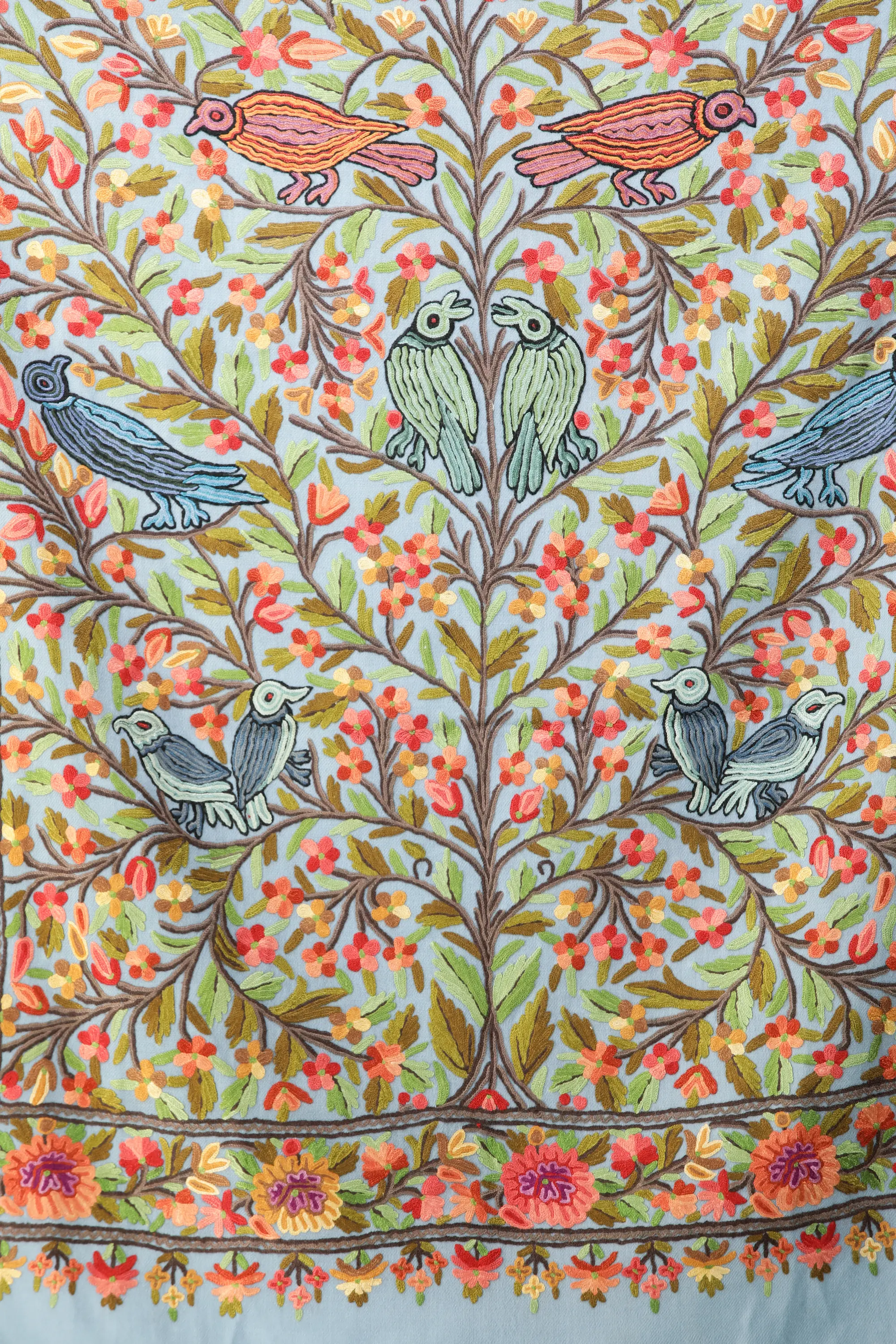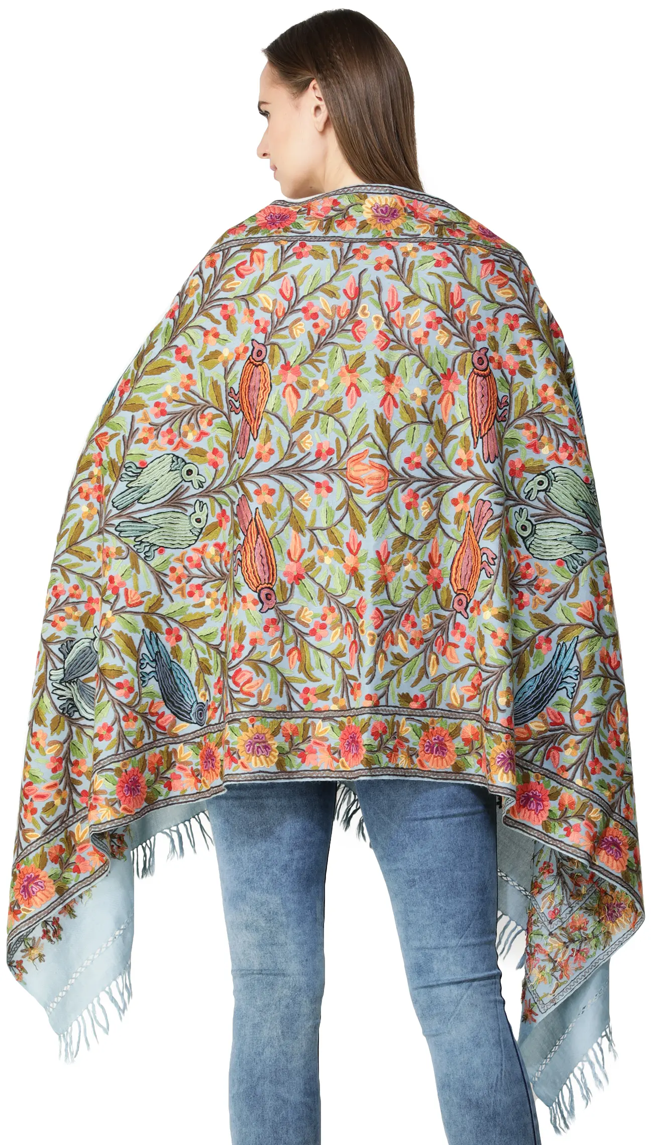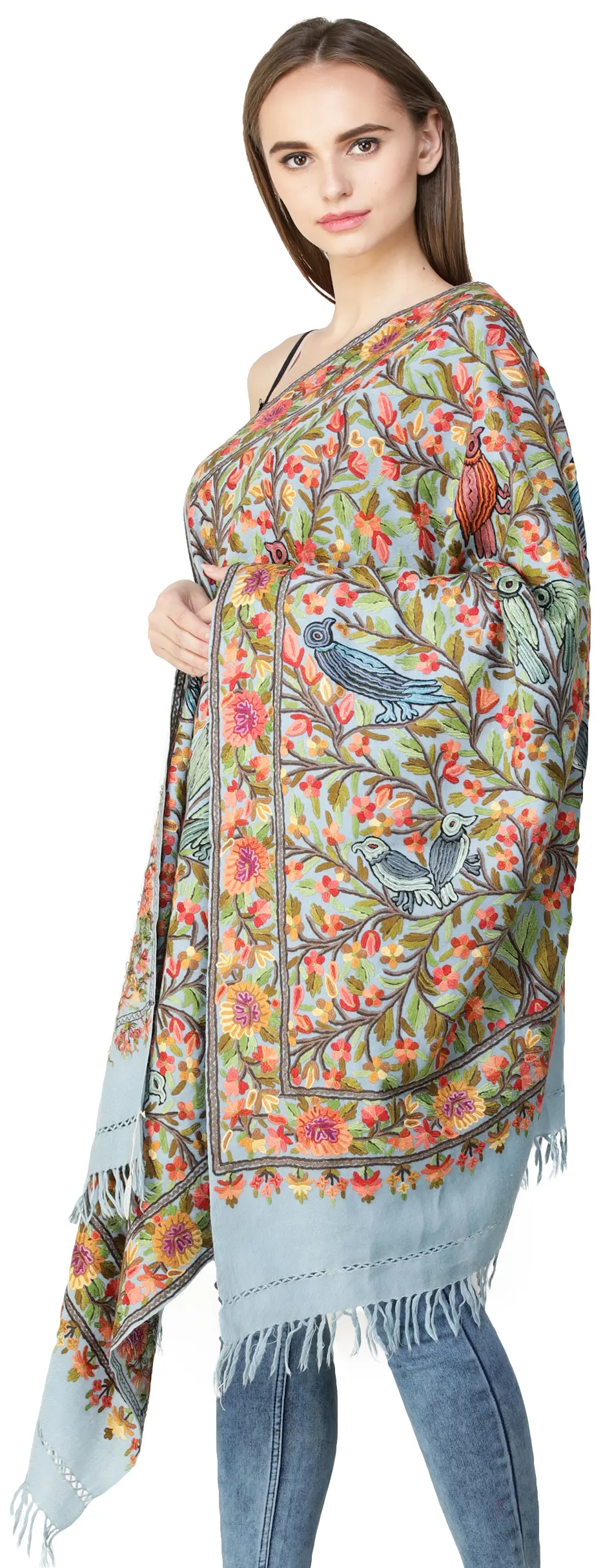 Pure Wool Stole from Kashmir with Aari Hand-Embroidered Birds on Tree Branches