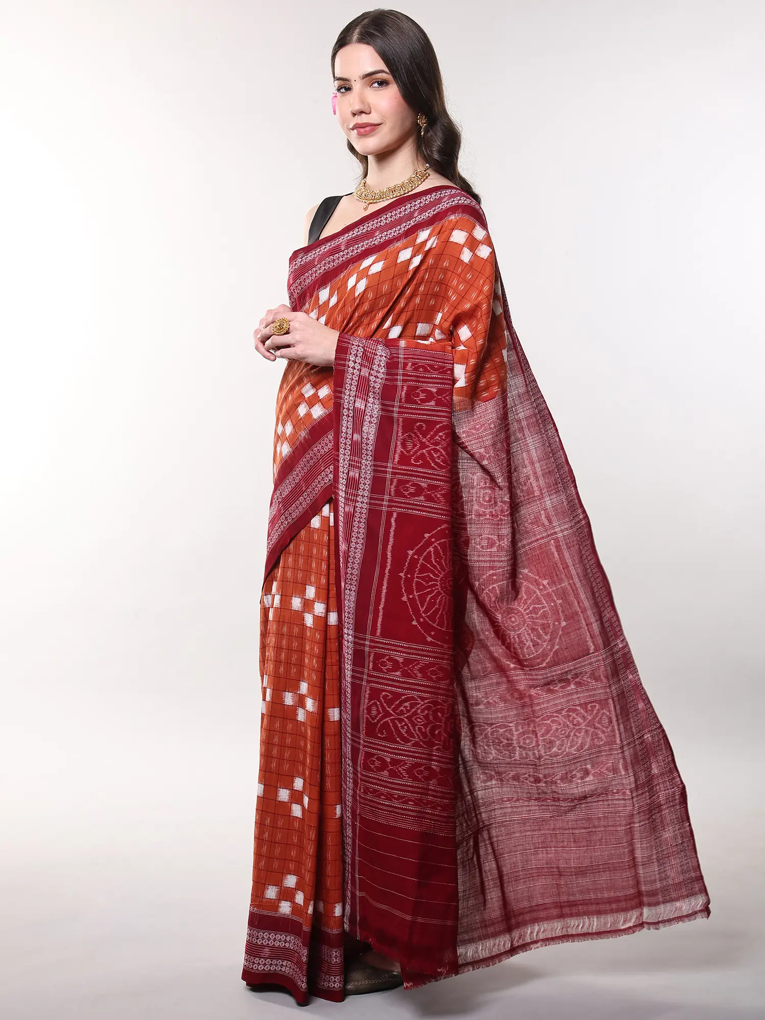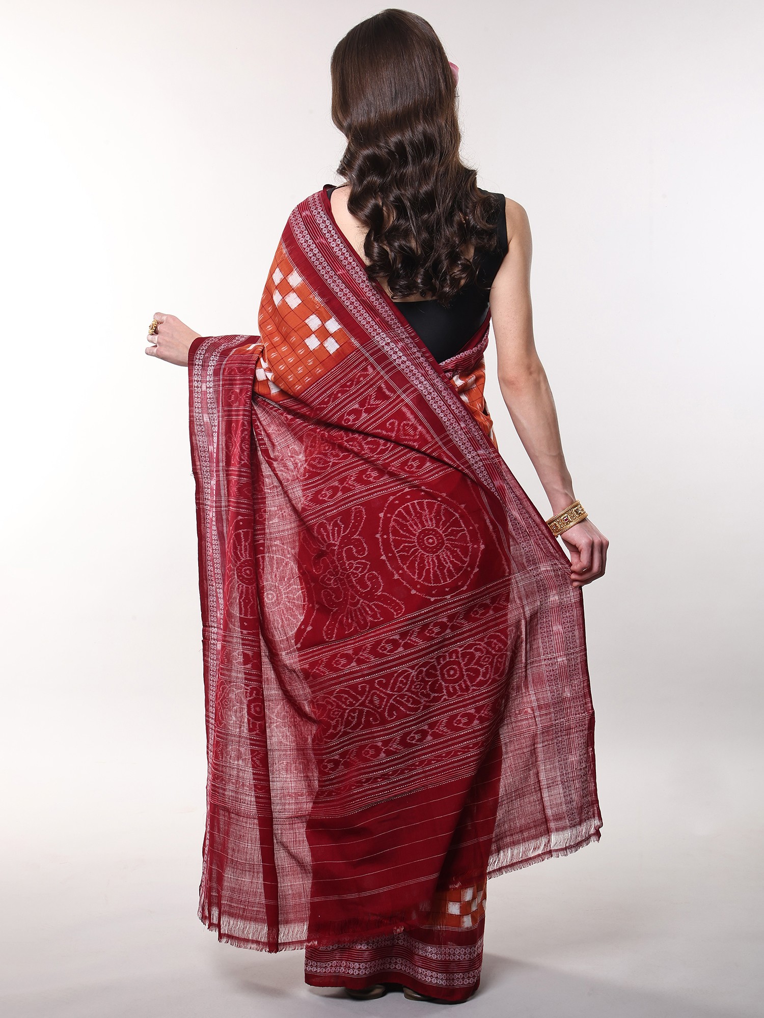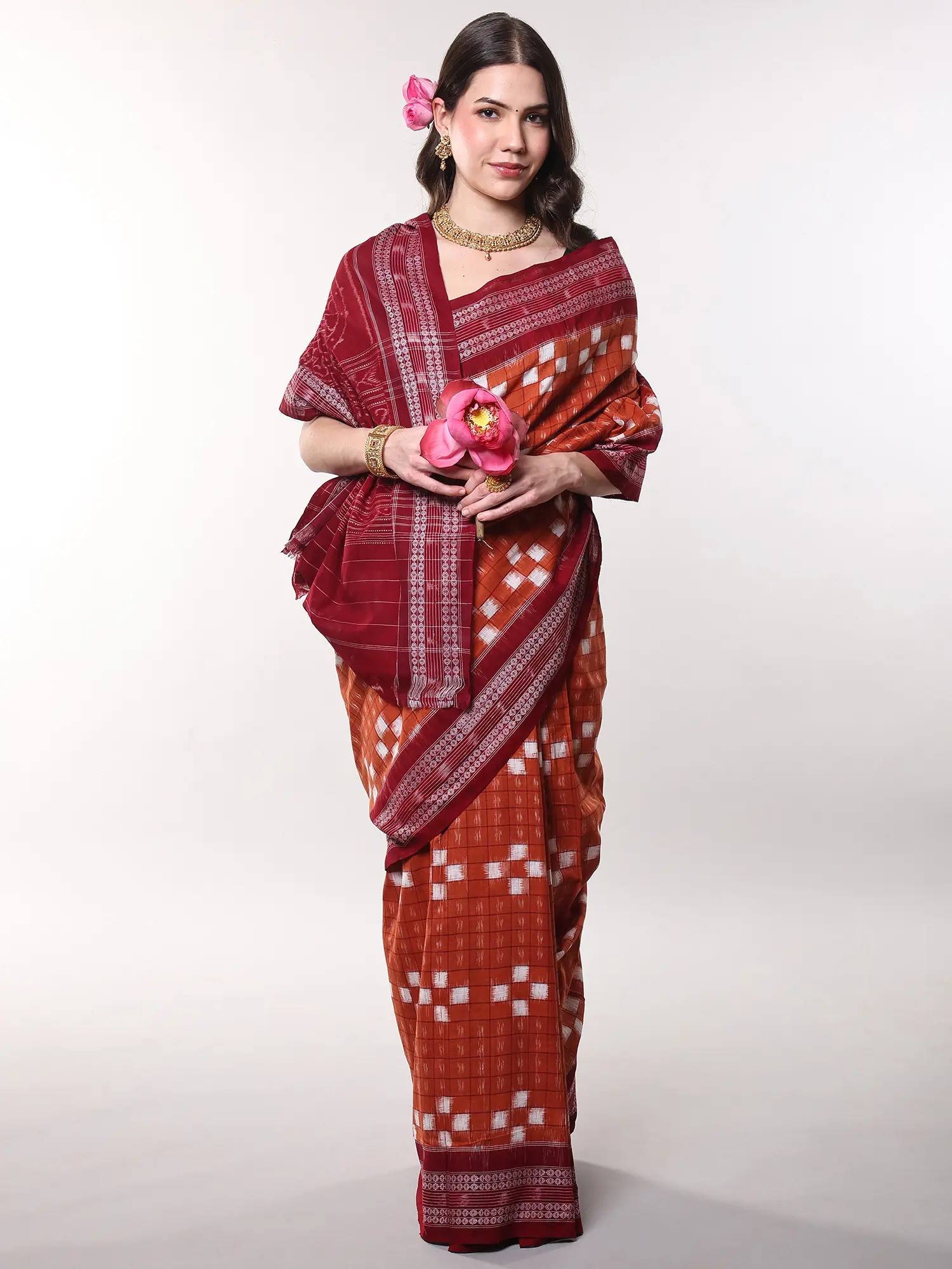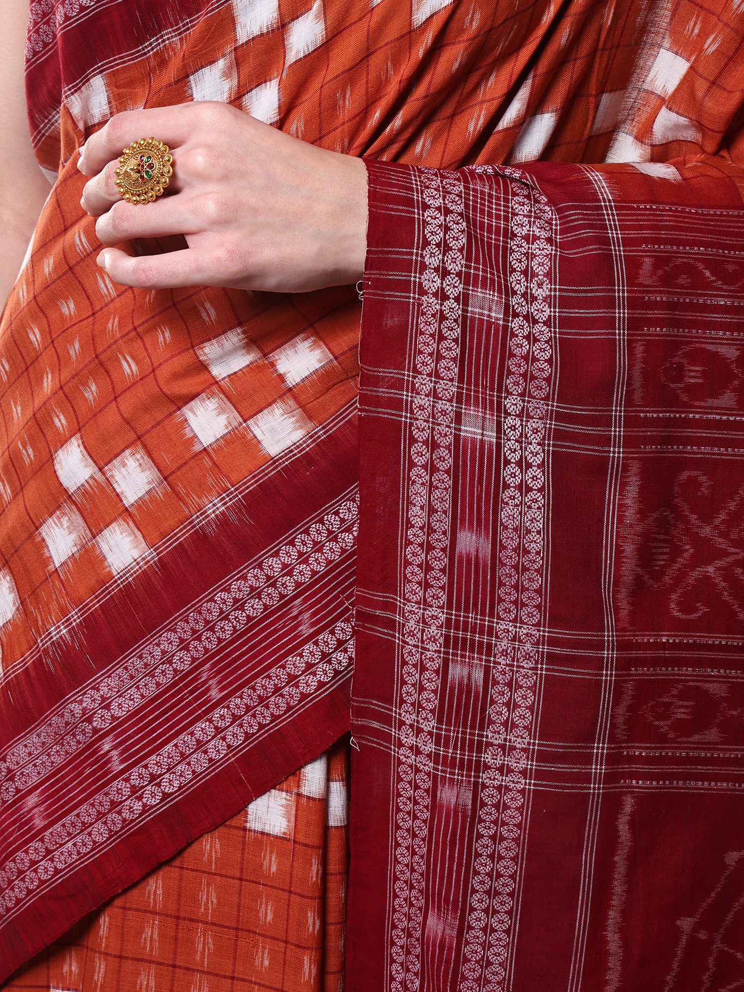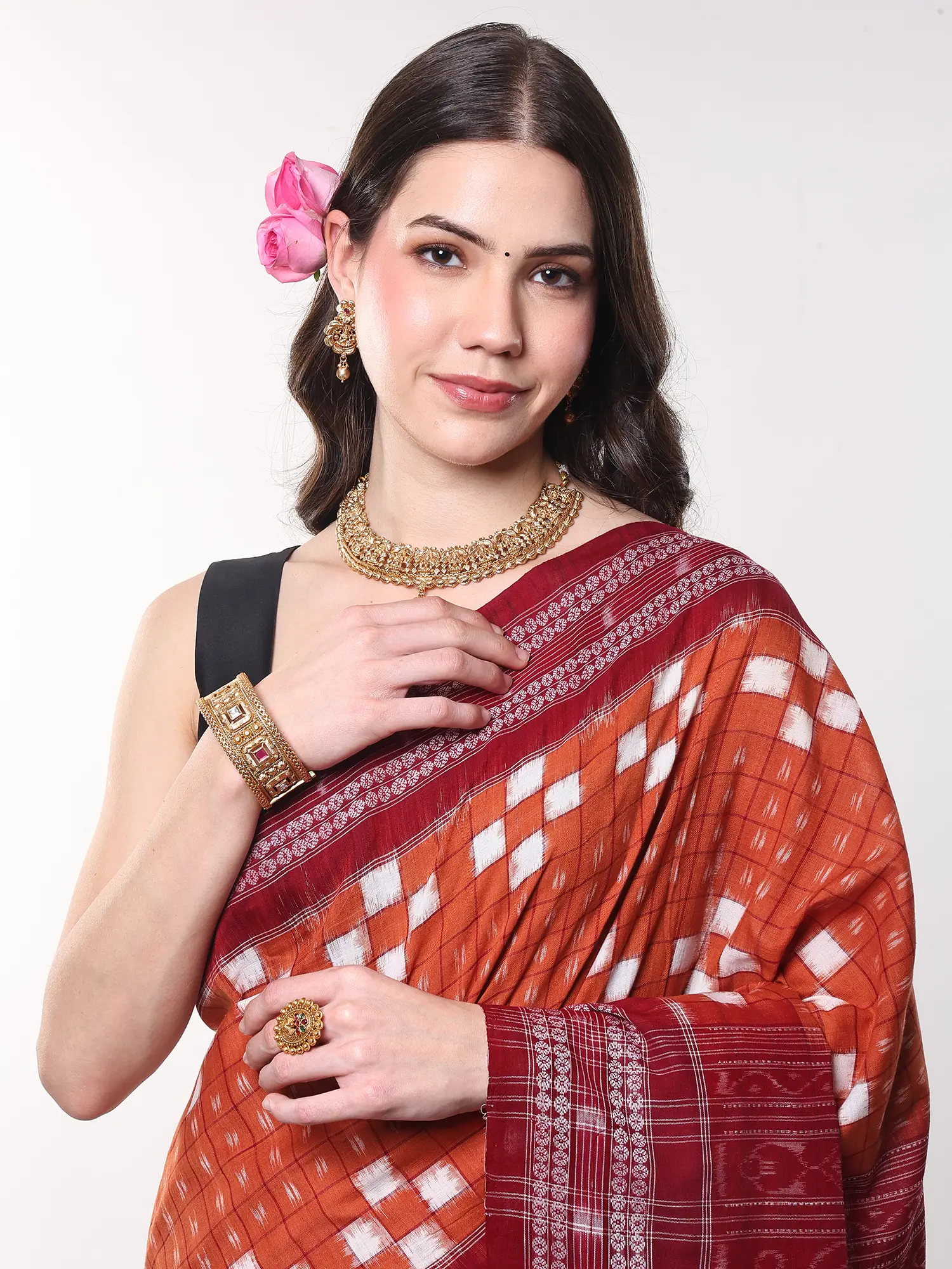 Glazed-Ginger Ikat Saree with Woven Contrast Rudraksha Boder from Sambhalpur