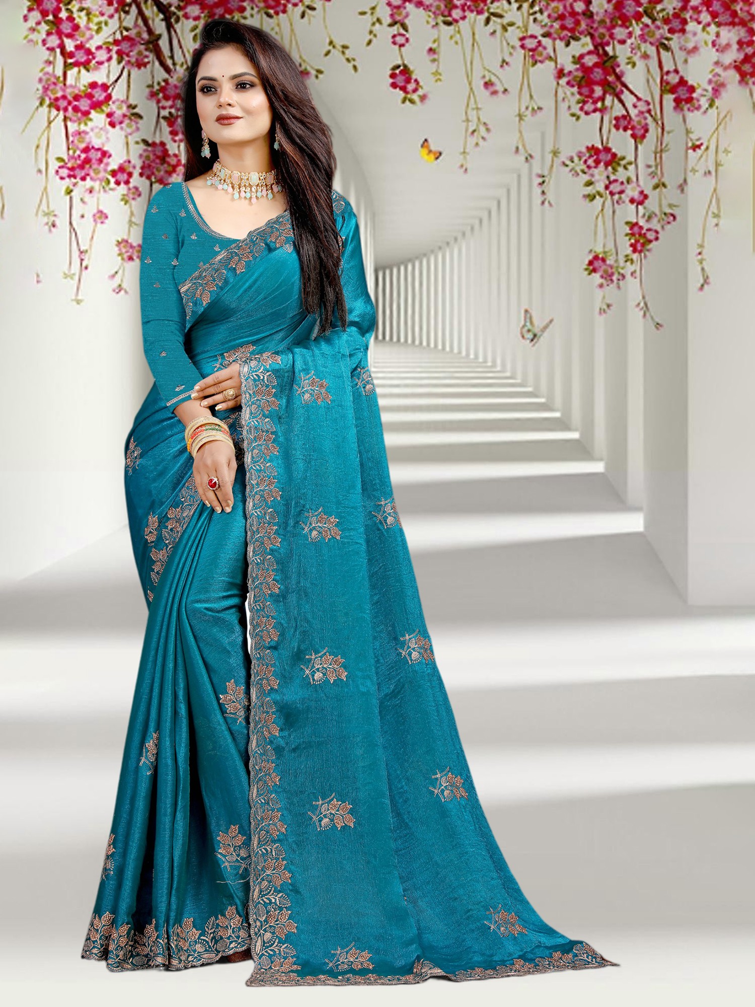Silk Weaving And Sequins Work Party Wear Designer Floral Border Saree With Blouse