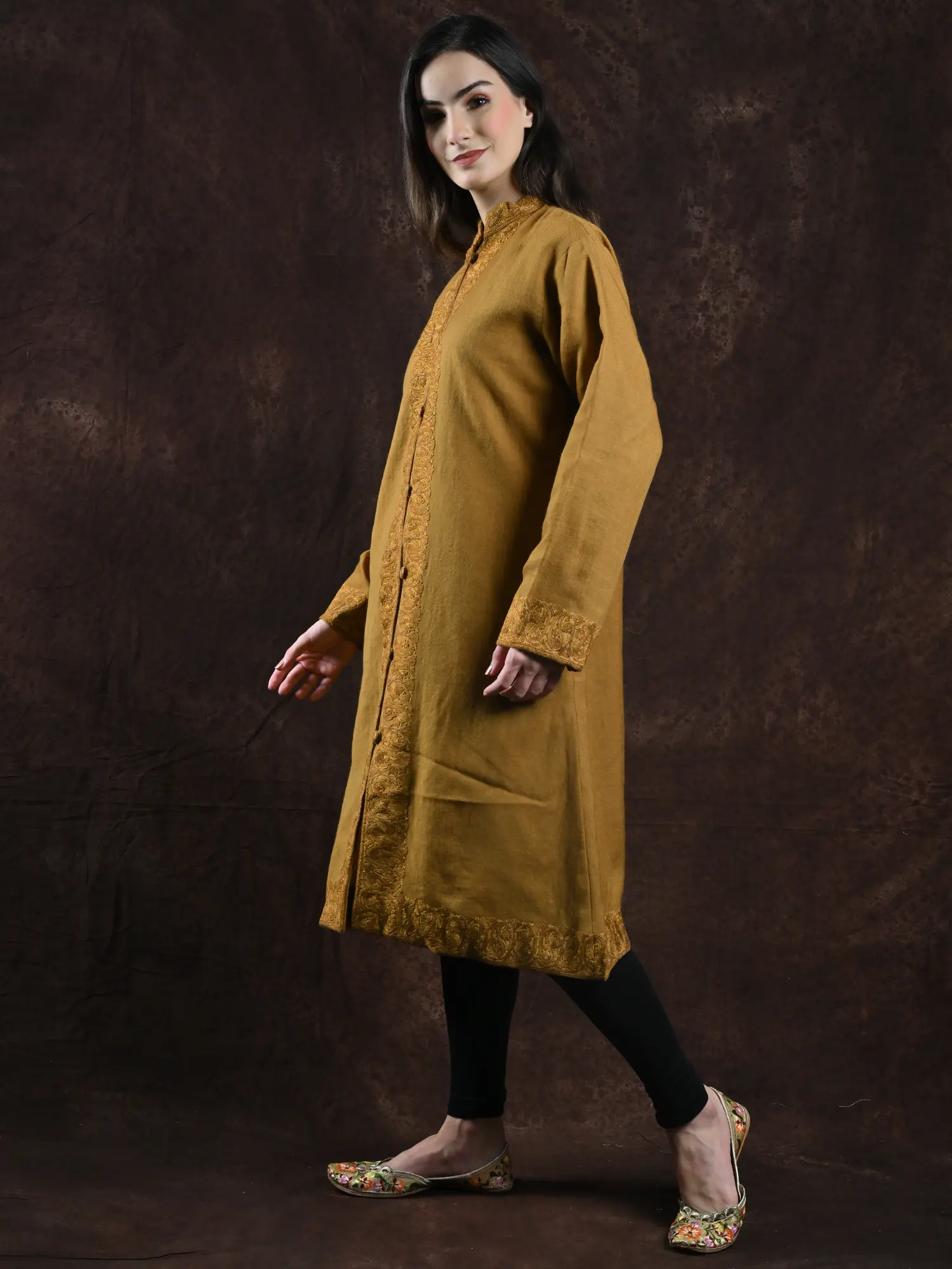 Step into a world of exquisite craftsmanship and enduring style with this magnificent long jacket. Woven from the finest pure wool, its warm ecru-olive hue forms the perfect canvas for the intricate artistry that defines it. This piece is more than just a garment; it's a wearable work of art, a testament to the rich heritage of Kashmiri embroidery.