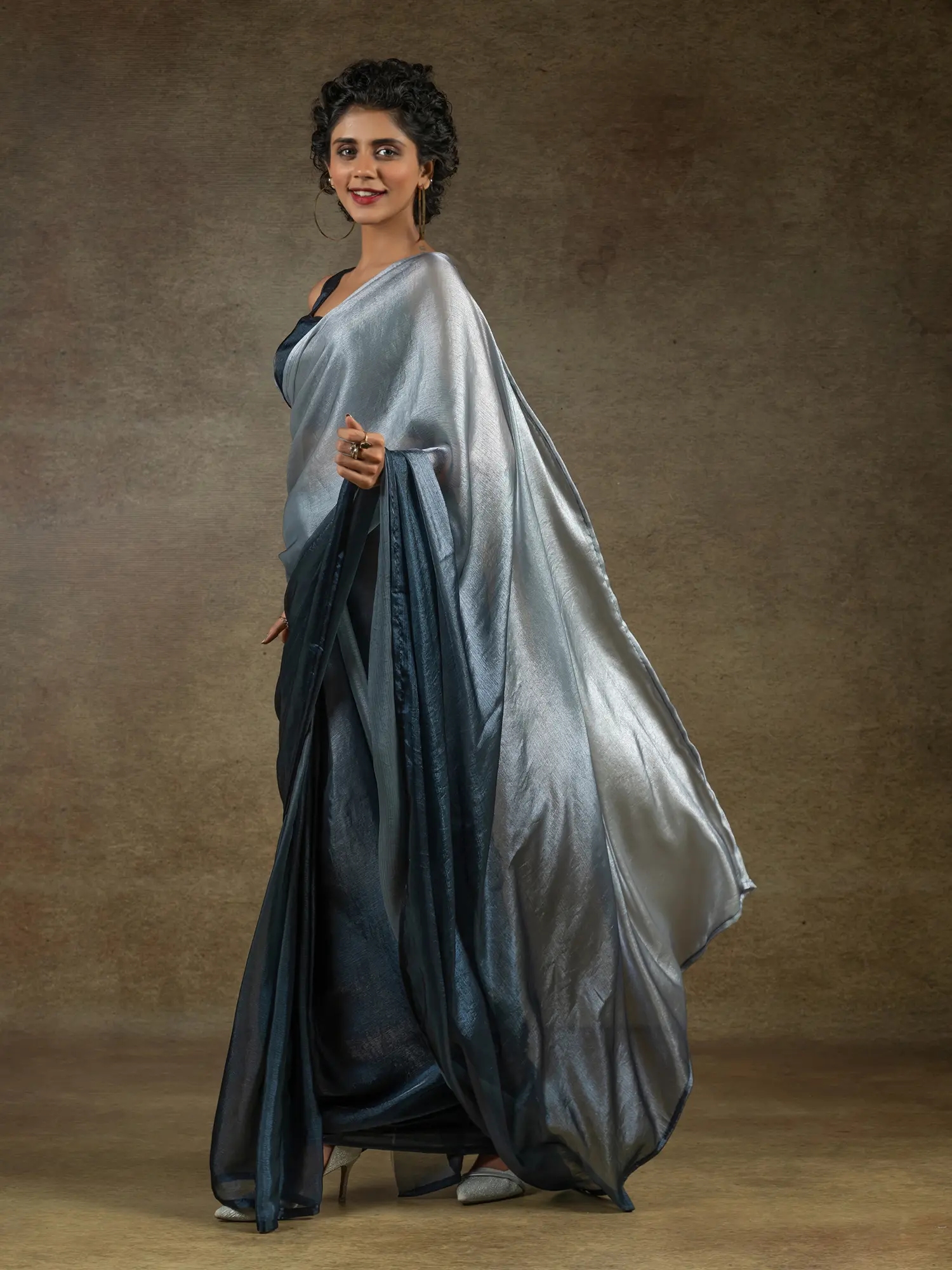 The captivating two-tone shading flows like liquid metal, transitioning from a soft, ethereal silver to a deep, opulent midnight blue. This gradient effect is not merely a color choice but a deliberate artistic statement, enhancing the inherent beauty of the satin silk. The innovative flexible multiple hooks closure is thoughtfully integrated, offering a discreet and remarkably effortless way to secure your drape, allowing the fabric to fall perfectly without compromise.