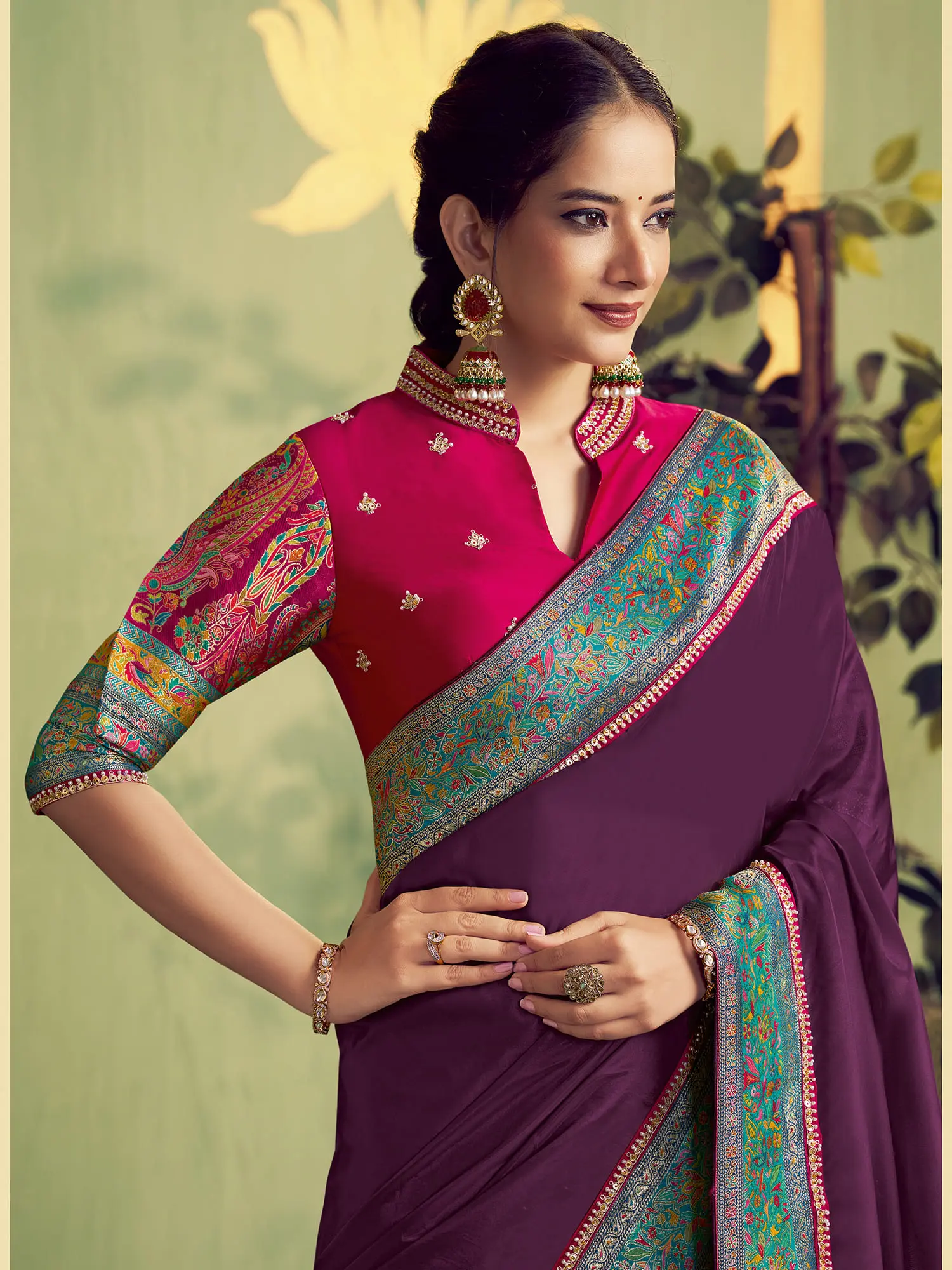 The deep, regal hue of the silk provides a perfect canvas for the vibrant, contrasting borders, which are alive with intricate patterns and delicate bead embellishments. The rich textile is further enhanced by the inclusion of a blouse and underskirt, tailored to your precise measurements, promising a flawless fit that complements the garment's inherent splendor. This ensures a cohesive and striking silhouette that truly captivates.