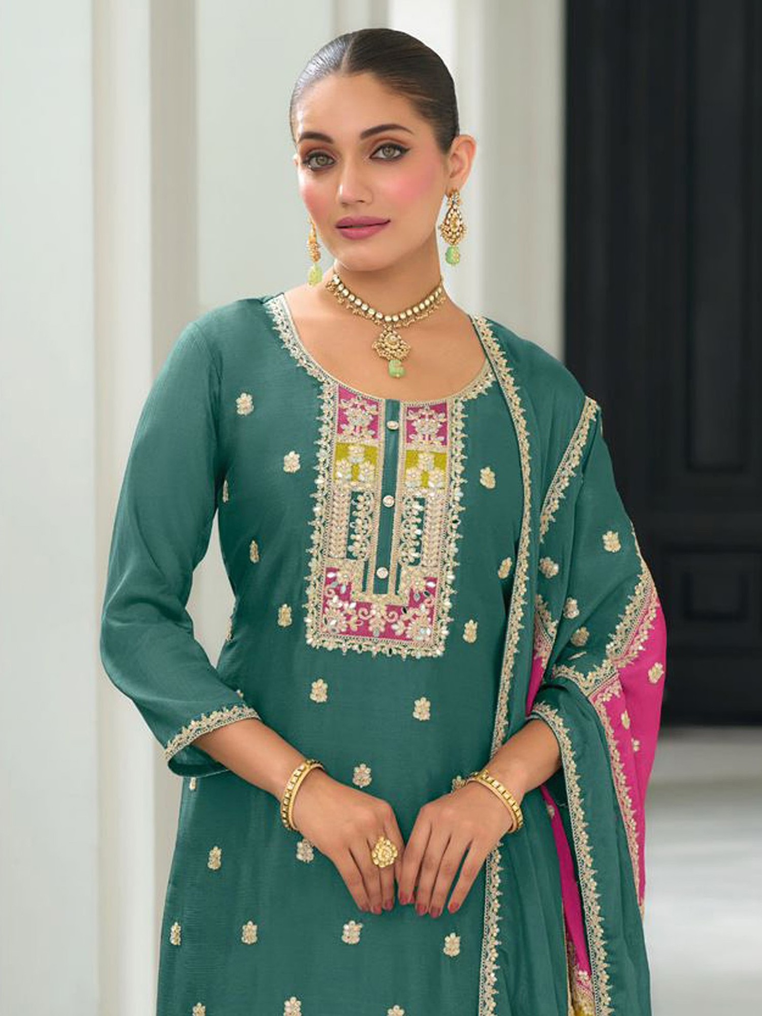 The kameez is perfectly paired with a comfortable and flowing rayon silk bottom, designed to provide ease of movement without compromising on style. This thoughtful pairing ensures that you can celebrate and socialize in comfort throughout the event. Completing this stunning ensemble is a breathtaking Chinon dupatta. The dupatta is a masterpiece of color and design, featuring a vibrant panel of hot pink and mustard yellow, bordered by the same elegant teal as the kameez. This contrasting yet harmonious palette adds a playful touch and a striking visual appeal, making this salwar suit a true work of art. Whether you're attending a wedding, a festive party, or a special family function, this teal Chinon salwar suit is sure to make you the center of attention, radiating an aura of refined beauty and ethnic charm.