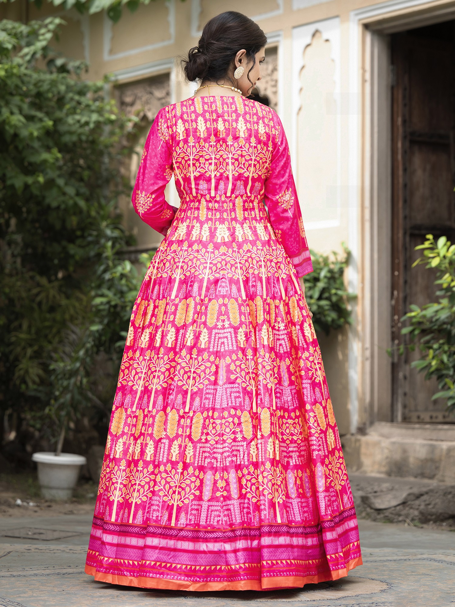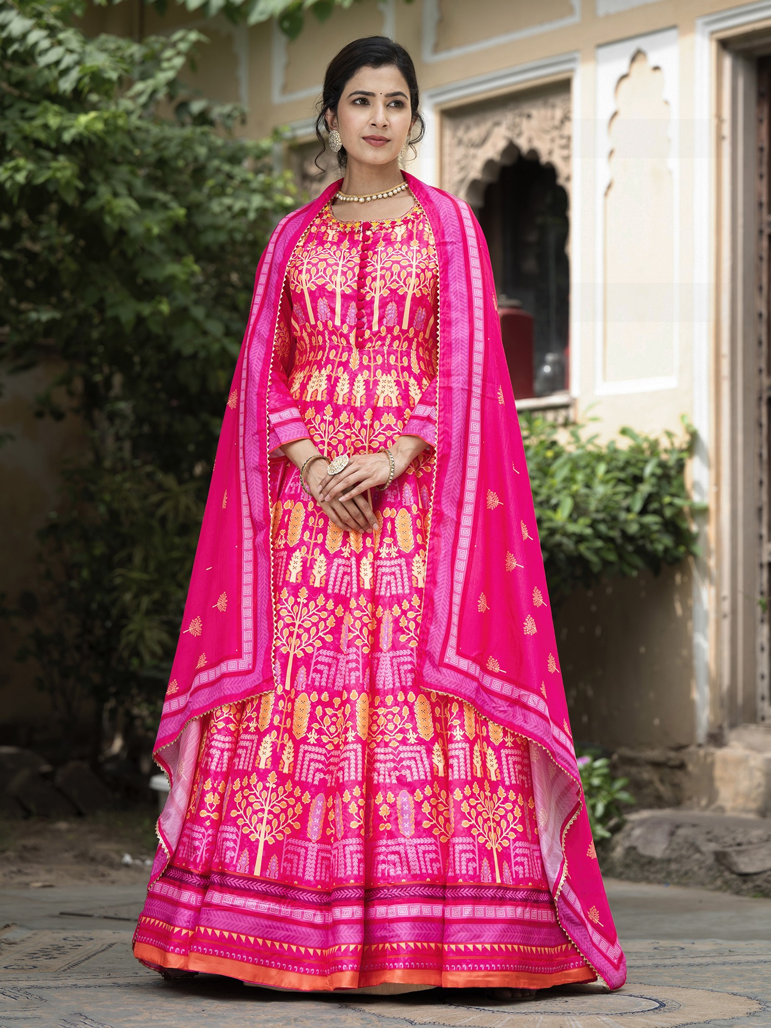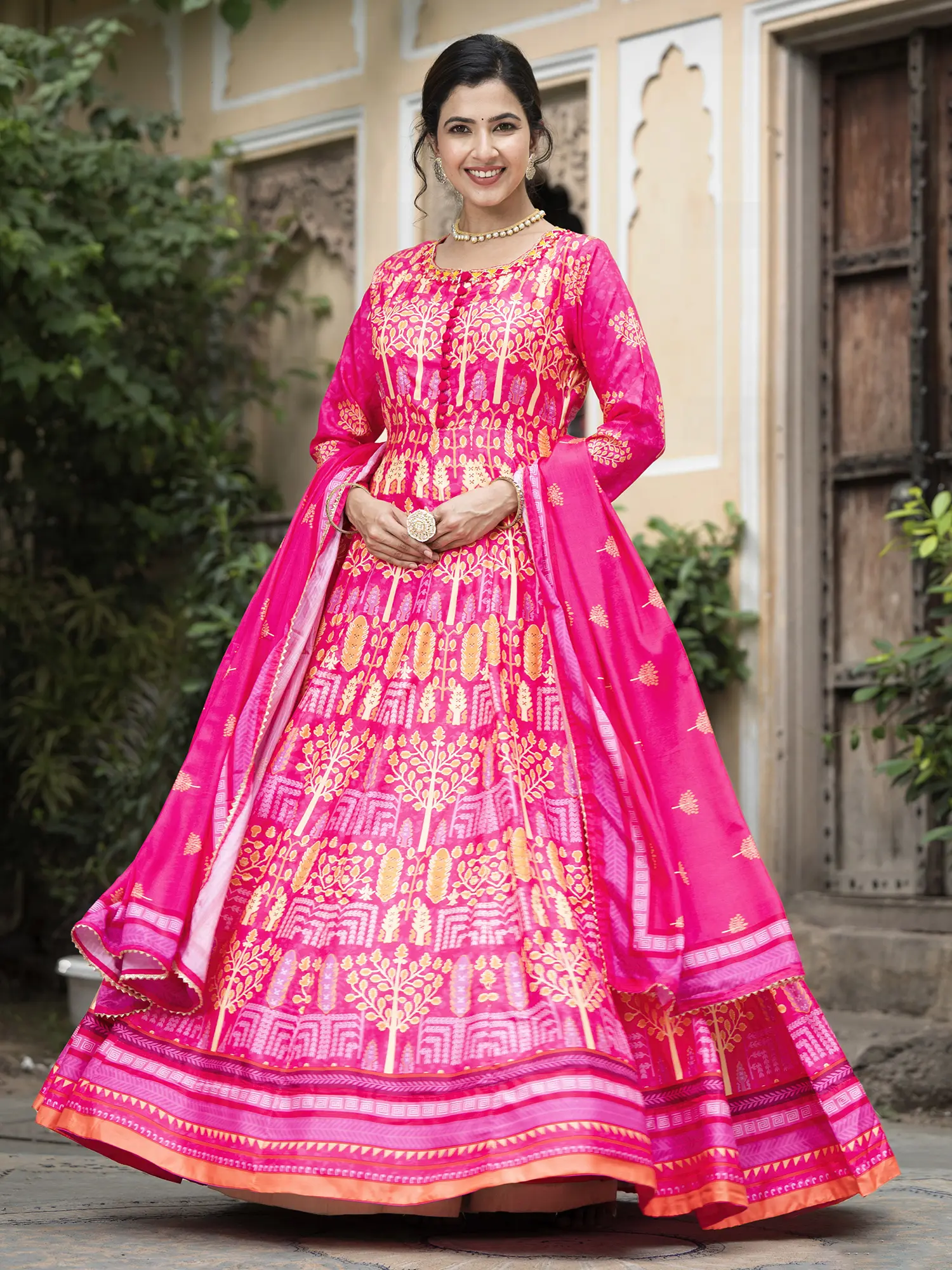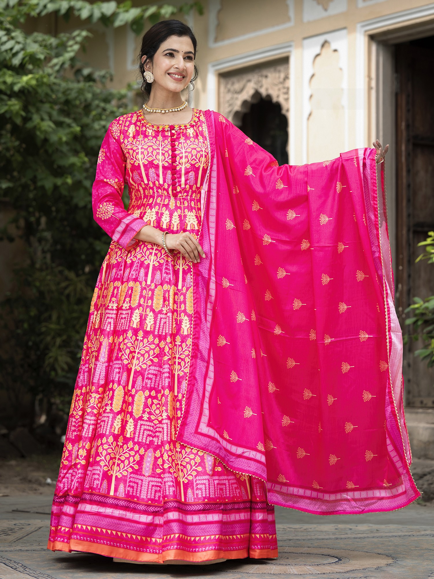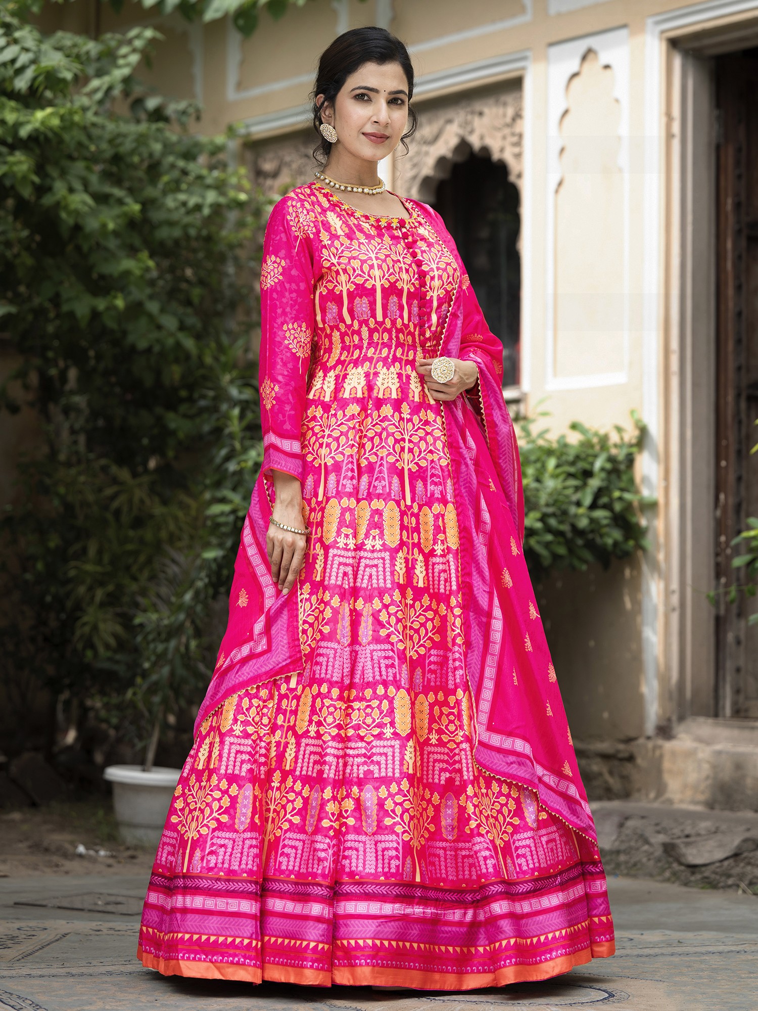 Elegant Contrast Digital Print Soft Dola Silk Festive Wear Anarkali Gown With Chinon Dupatta