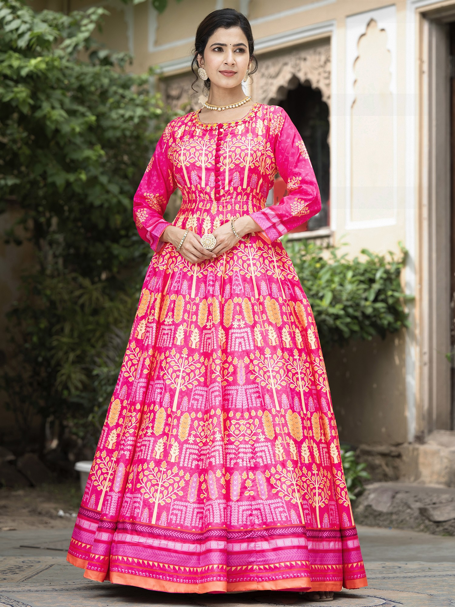 Enhance the allure of this Anarkali gown with the right accessories. Pair it with delicate jewelry, such as a pearl necklace and matching earrings, to highlight the neckline. For footwear, consider strappy heels or embellished sandals in a complementary color. A small, elegant clutch will complete the ensemble. Whether you’re attending a wedding, a festive gathering, or a special celebration, this Anarkali gown is a guaranteed head-turner. Its vibrant color and sophisticated design will make you feel confident and radiant.