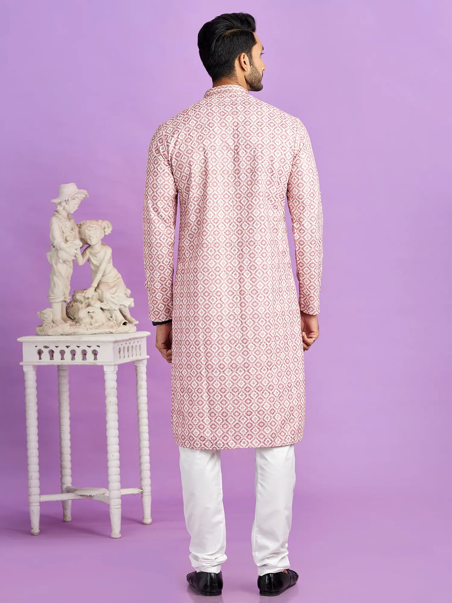 Pink Straight Kurta and Aligarhi Pajama with Embroidery Work on Collar for Festival
