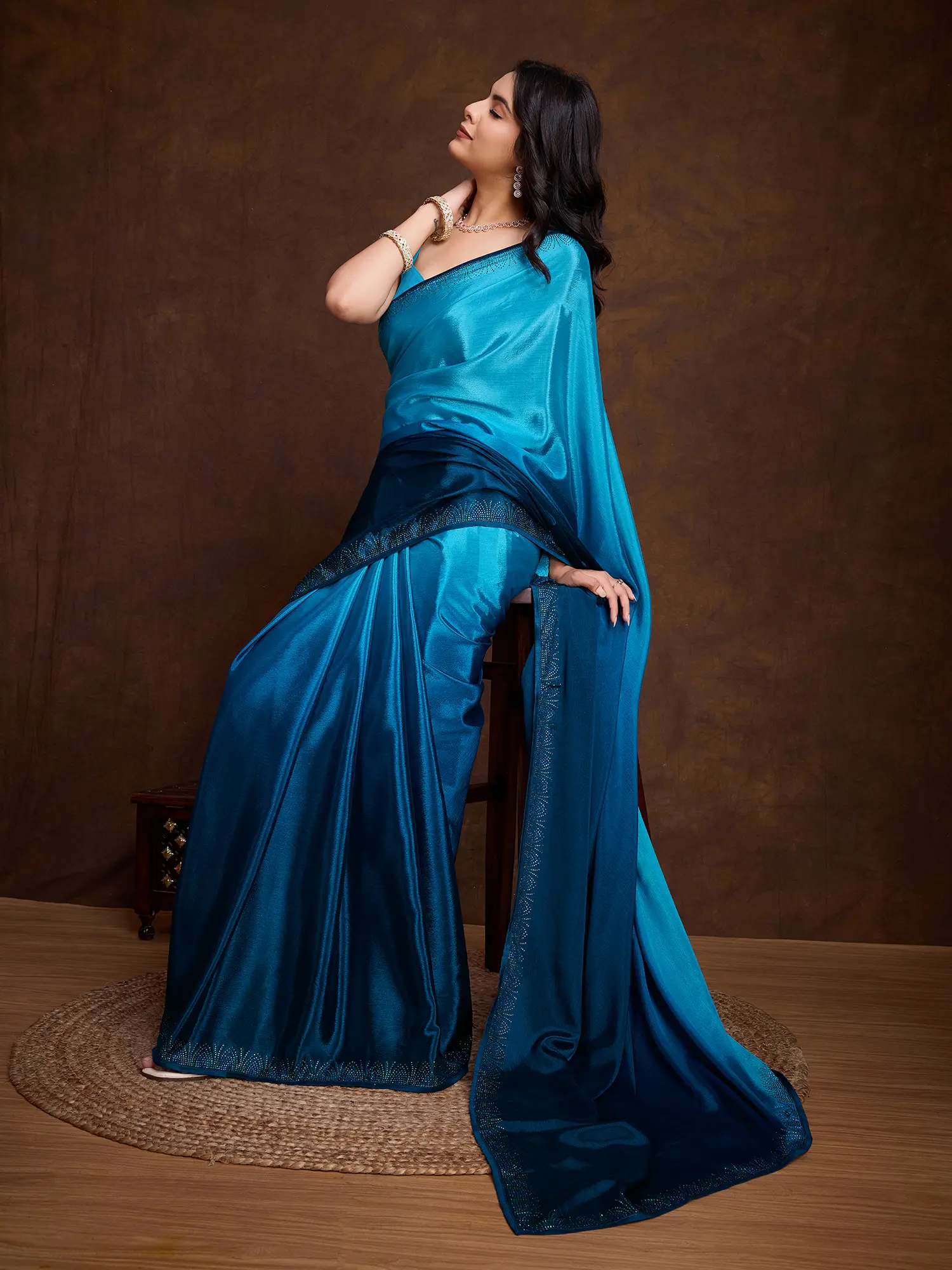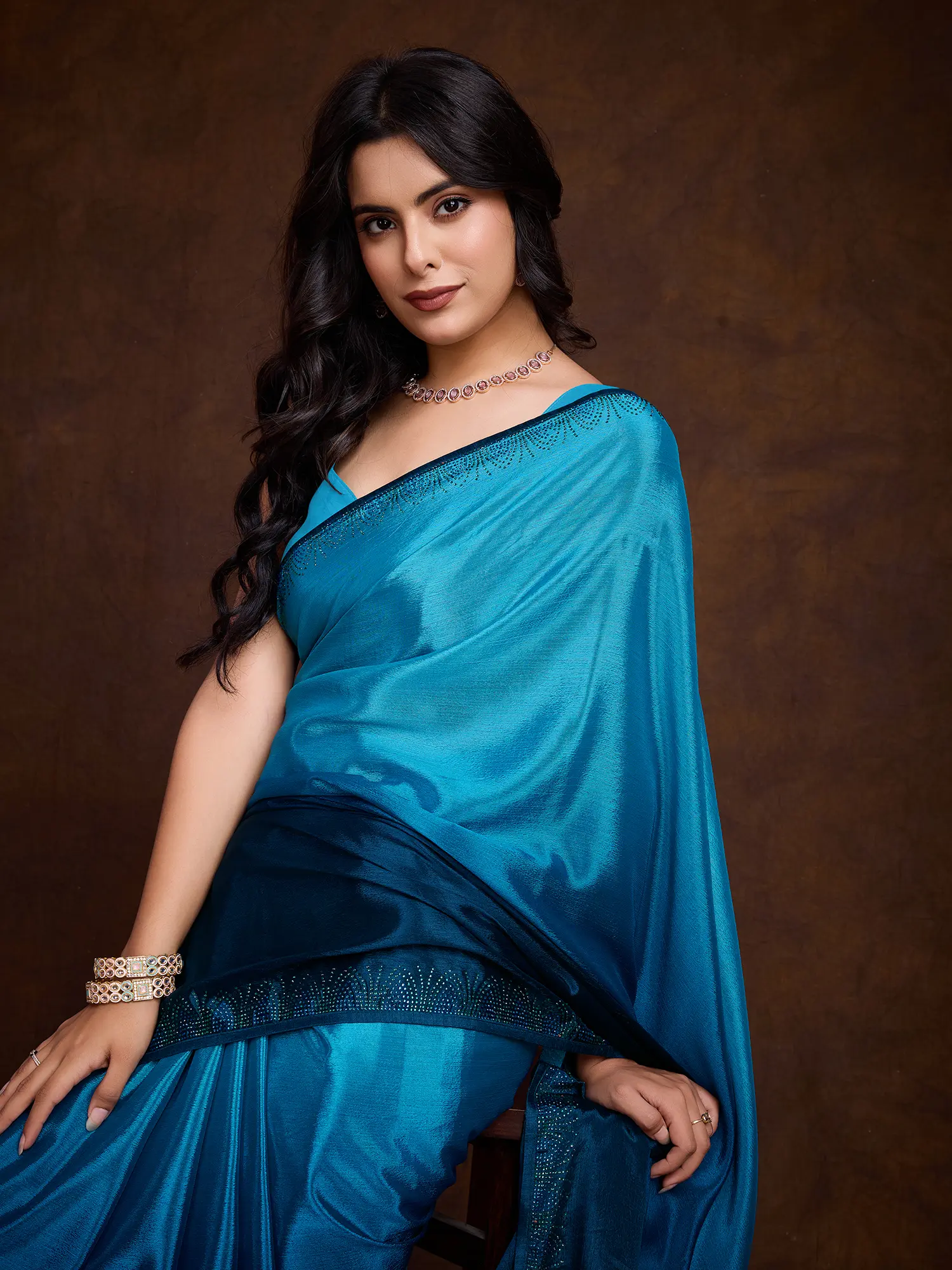 The fabric itself boasts a beautiful dual-tone shading, transitioning seamlessly from a vibrant sky blue to a deeper, richer oceanic hue, creating a dynamic visual effect. The Swarovski embroidery is thoughtfully applied, offering a sophisticated sparkle without being overwhelming, enhancing the fabric's natural luminescence. This thoughtful embellishment is further complemented by the refined piping, which adds a polished finish and structural definition.