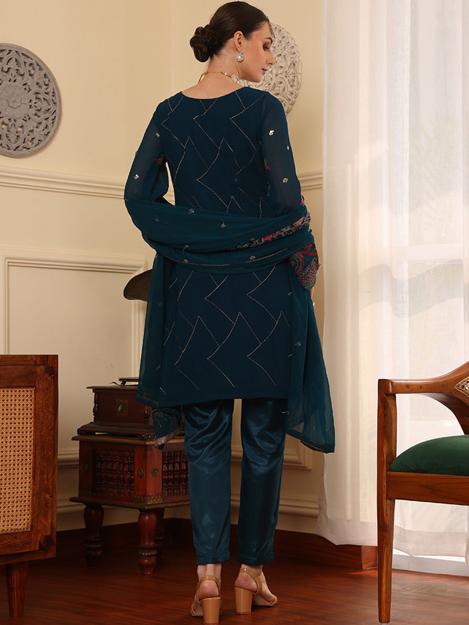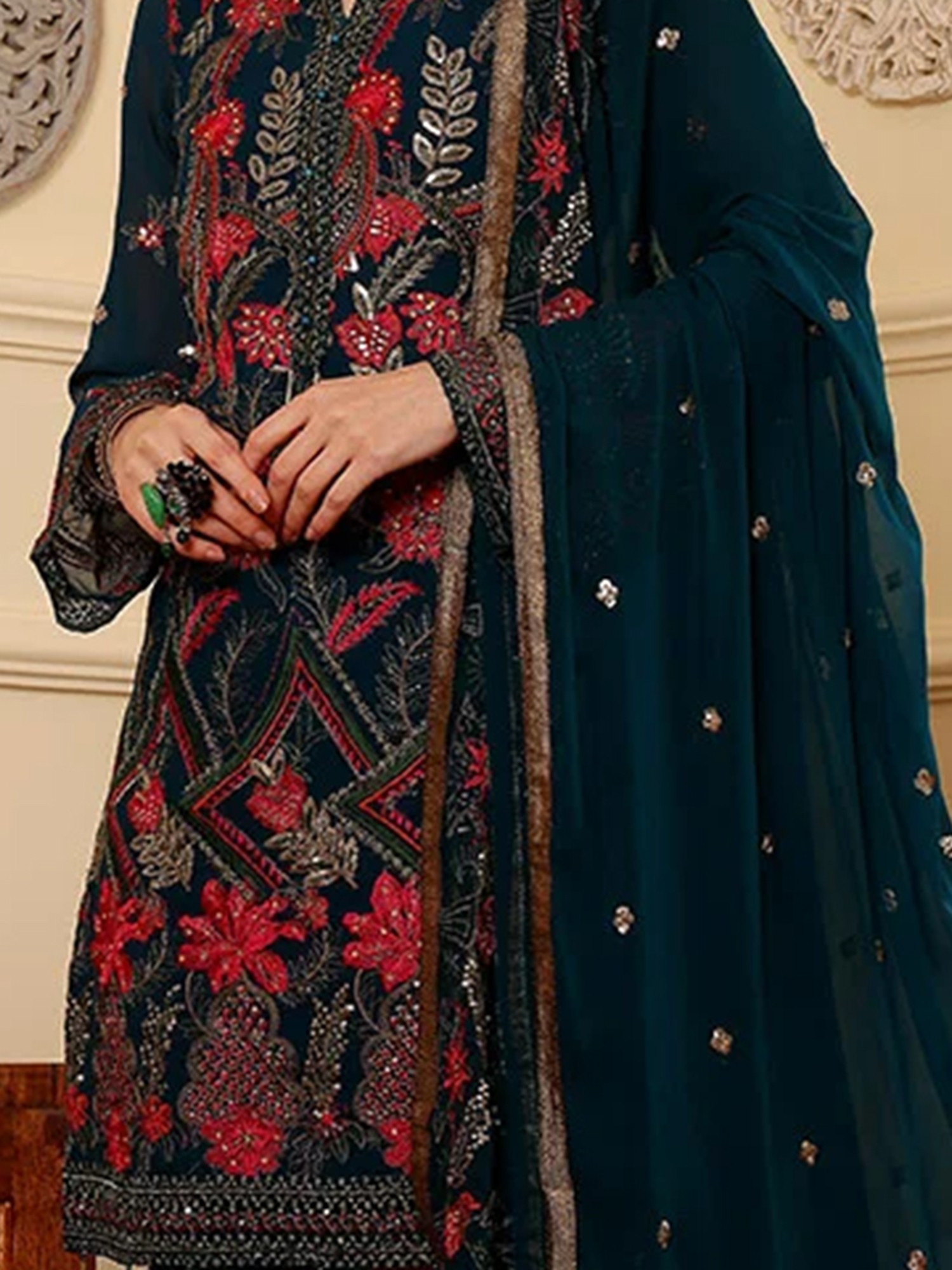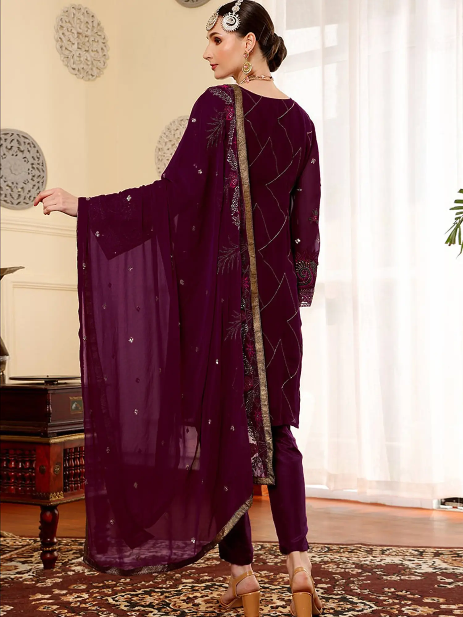 Make a captivating statement at your next party or festive gathering with this stunning salwar suit. Designed for the modern woman who appreciates intricate craftsmanship and timeless elegance, this ensemble is a true embodiment of sophisticated style. The deep, rich hue serves as a perfect canvas for the breathtaking embroidery that adorns the faux georgette kameez. Each stitch is meticulously placed, creating a symphony of floral motifs and geometric patterns that shimmer and catch the light, promising to turn heads.