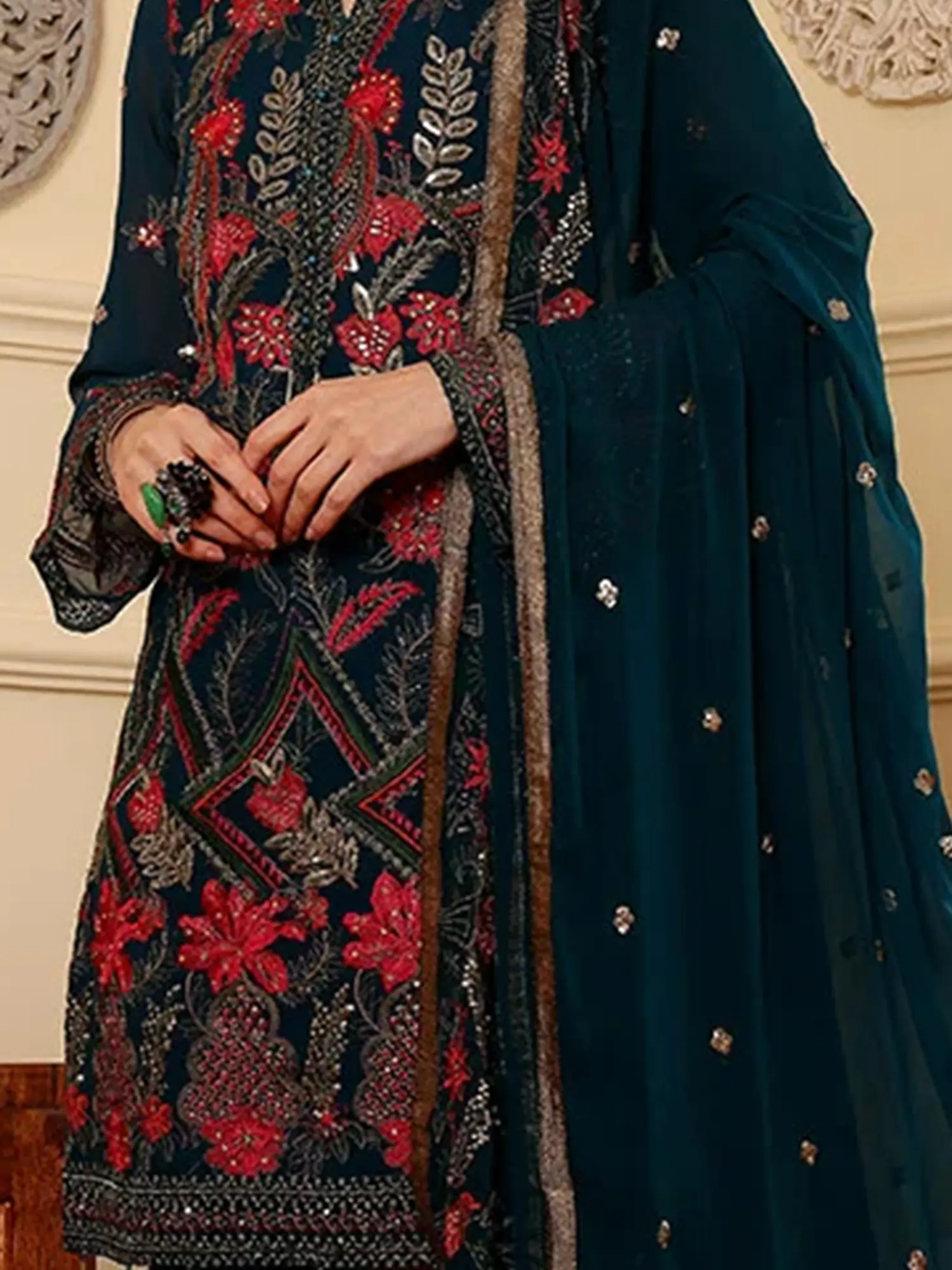 The luxurious faux georgette fabric drapes beautifully, offering a graceful silhouette that is both comfortable and chic. This is complemented by a Santoon trouser, providing a smooth and refined base that balances the ethereal quality of the georgette. The accompanying chiffon dupatta is a masterpiece in itself, featuring delicate scattered embellishments that echo the richness of the kameez. Its sheer texture adds an extra layer of elegance, allowing for a subtle play of light and shadow as you move. The thoughtful combination of these fabrics ensures a look that is as comfortable as it is visually striking.